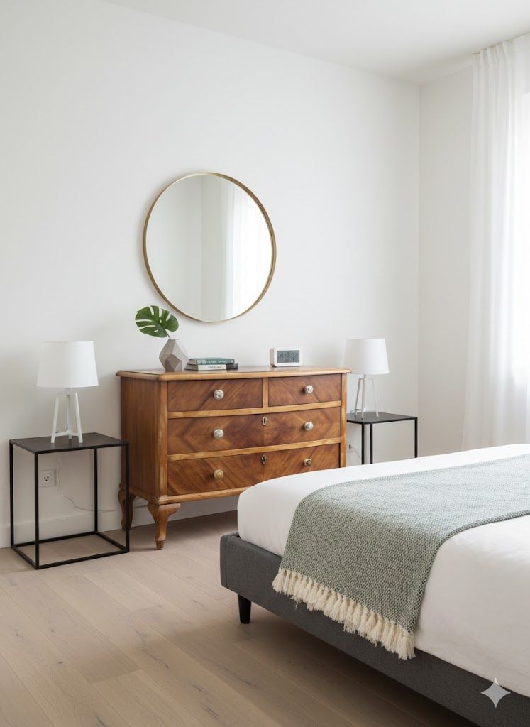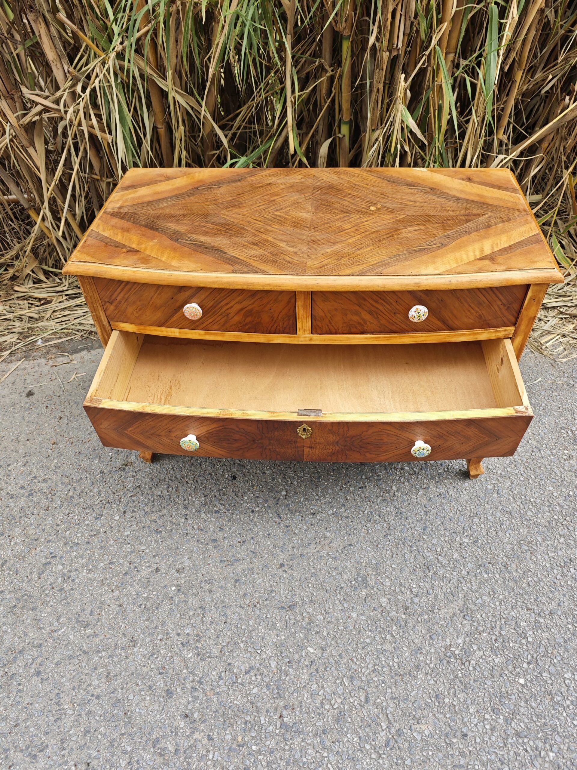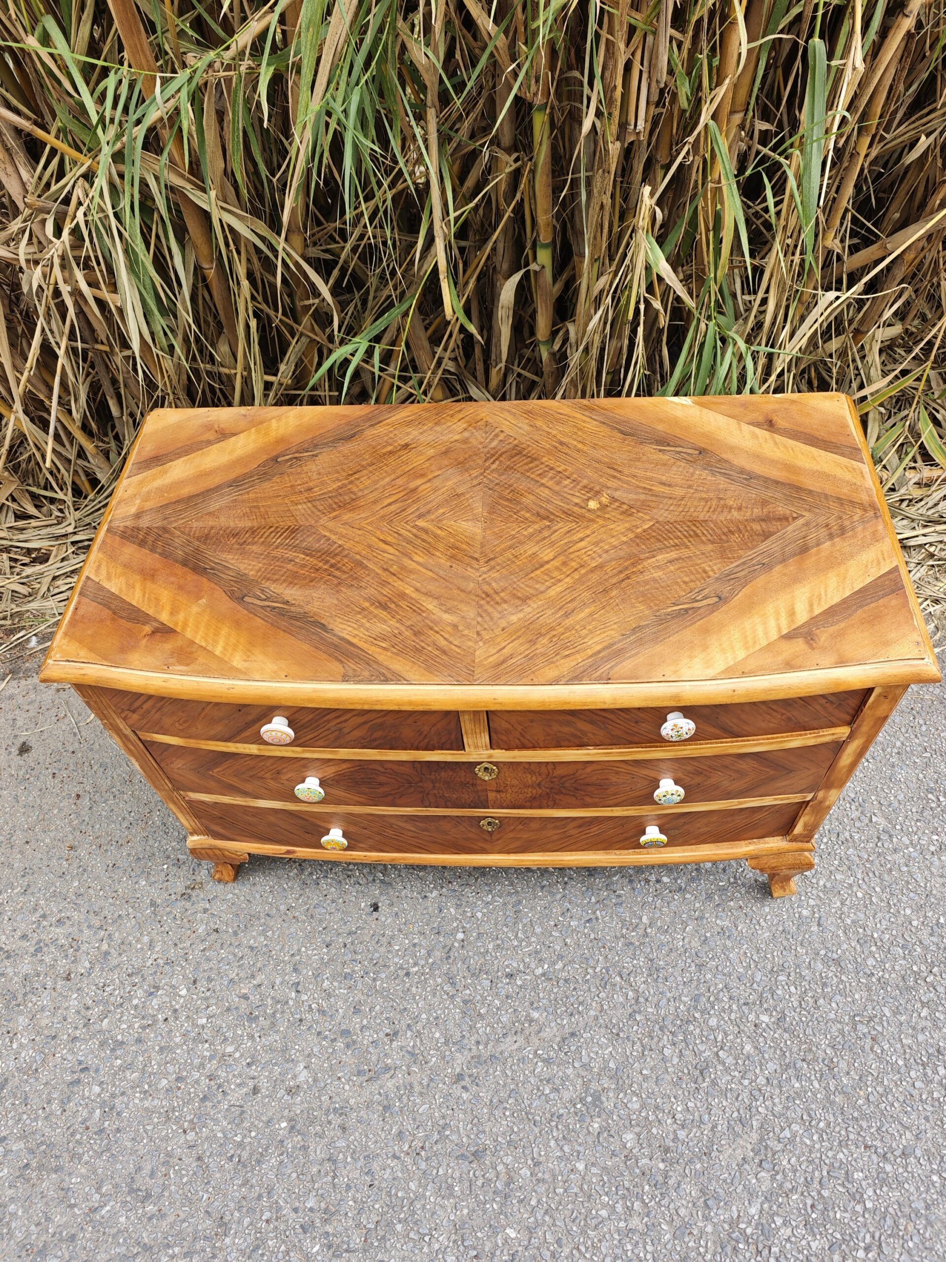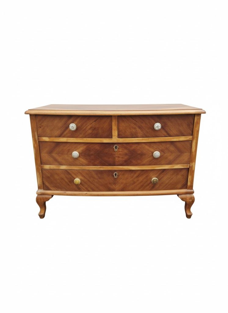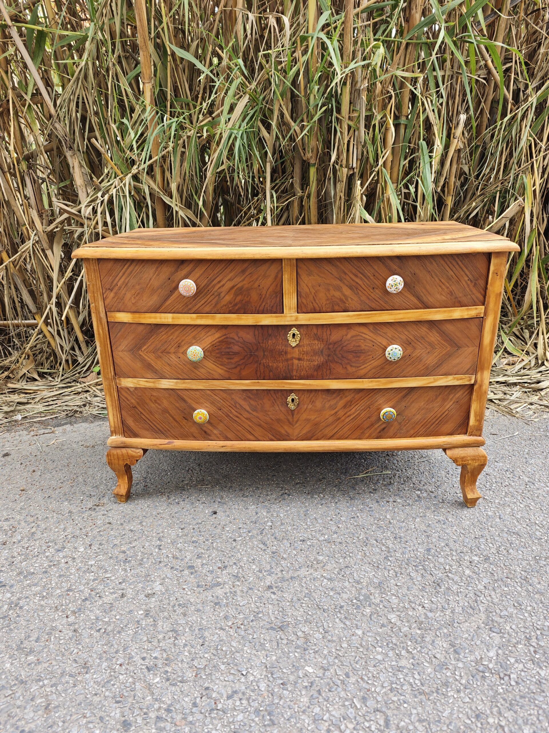 Esta cómoda francesa es una pieza de mobiliario clásica que destaca por su refinado trabajo de ebanistería. Fabricada en madera noble con acabados en chapa de raíz y motivos de marquetería geométrica en los frontales, presenta un diseño de líneas curvas que evoca el estilo provenzal y Luis XV. La estructura se compone de dos cajones superiores de menor tamaño y dos cajones inferiores de gran capacidad, todos ellos equipados con tiradores circulares ceramicos de estilo vintage.