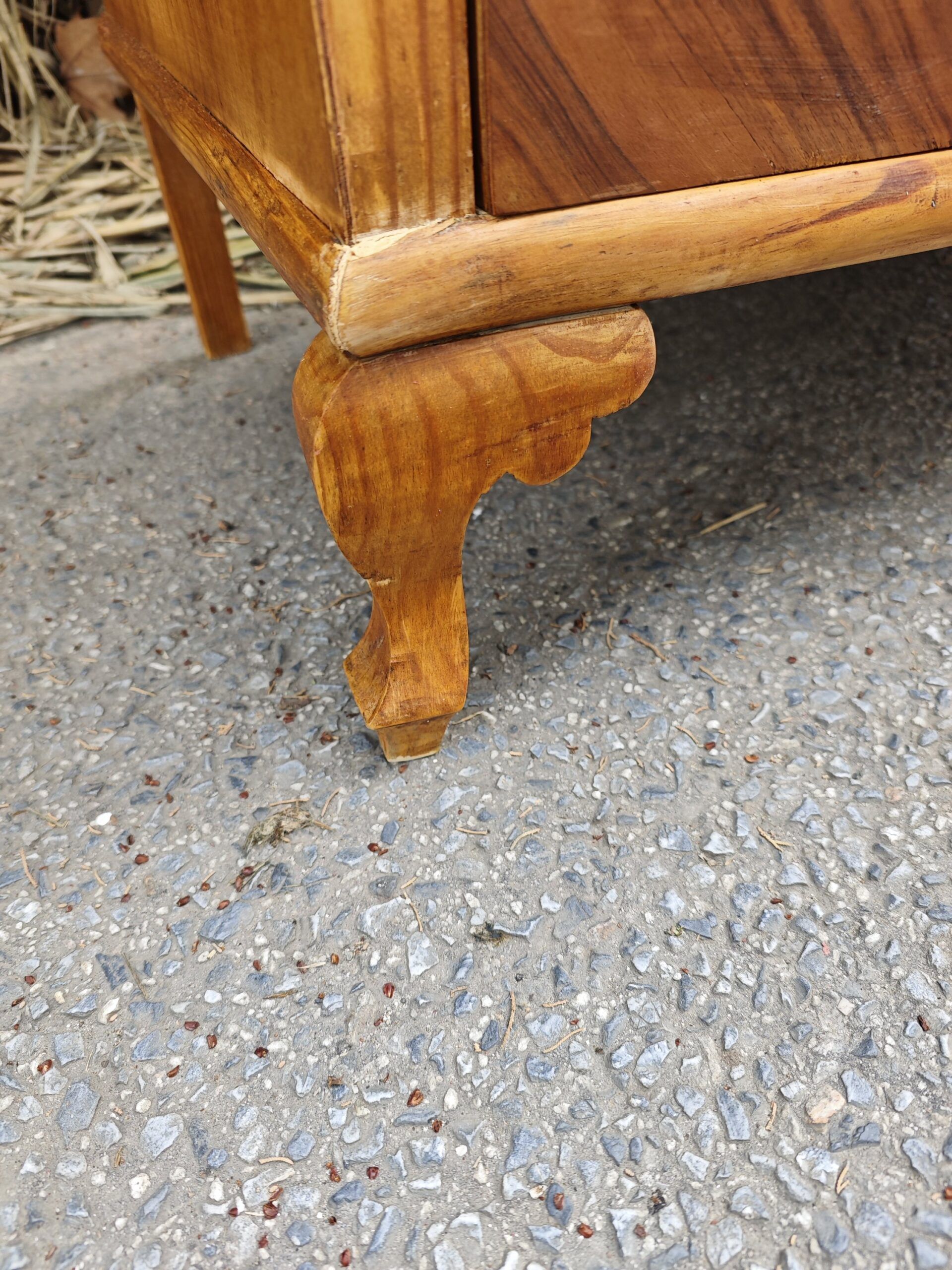 El mueble se apoya sobre cuatro patas 2 de ellas tipo cabriolé, que aportan ligereza visual a pesar de su robusta construcción. El sobre de madera muestra un veteado natural dispuesto de forma simétrica, lo que subraya su valor artesanal. Es una pieza ideal para proyectos de interiorismo clásico, dormitorios de lujo o salones elegantes que requieran un mueble auxiliar con carácter histórico y gran funcionalidad de almacenaje.