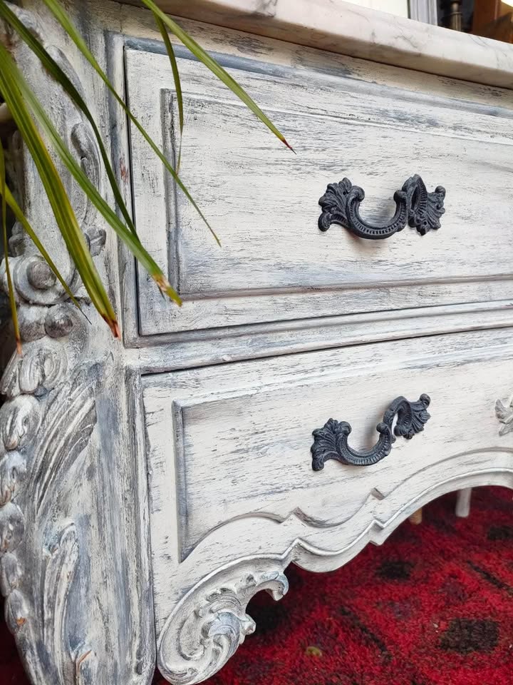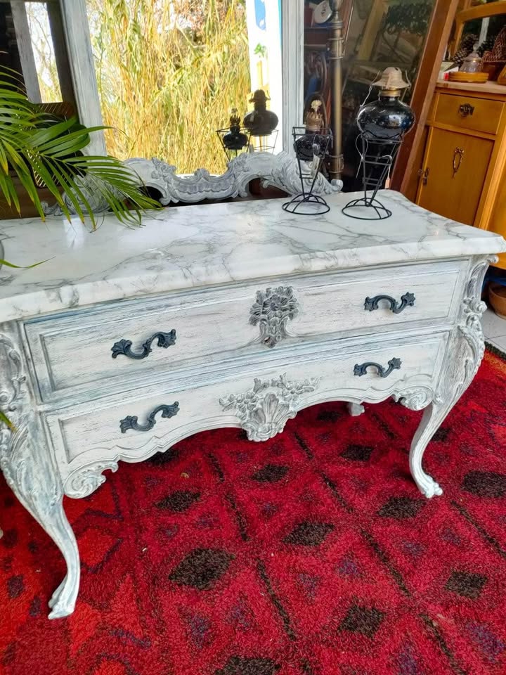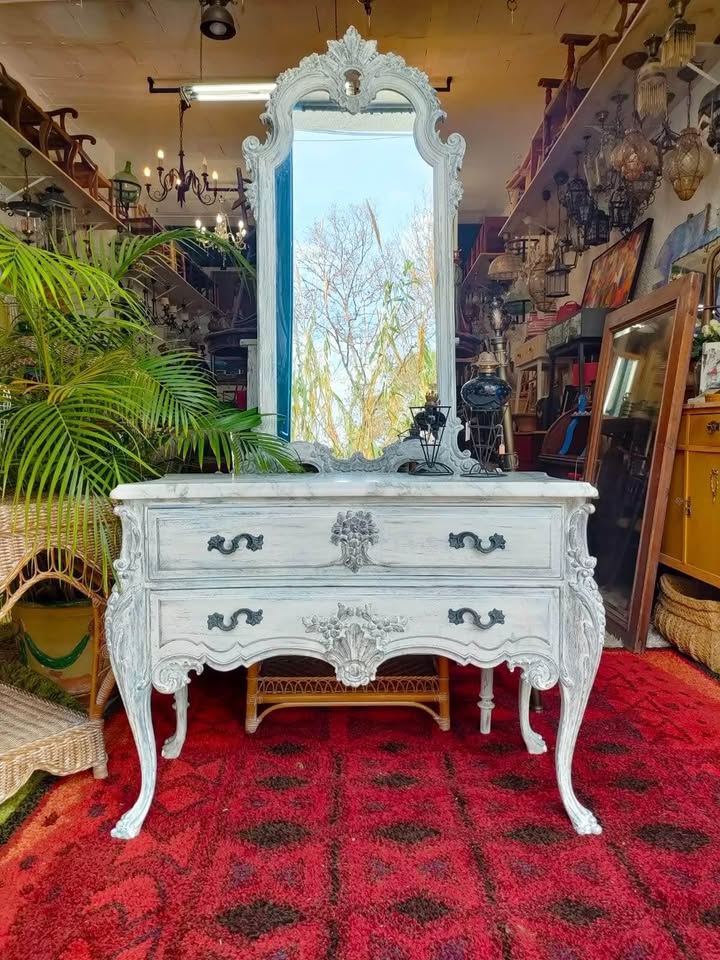 Conjunto de cómoda y espejo vintage en blanco envejecido. Diseño ornamental ideal para dormitorios o recibidores con encanto.