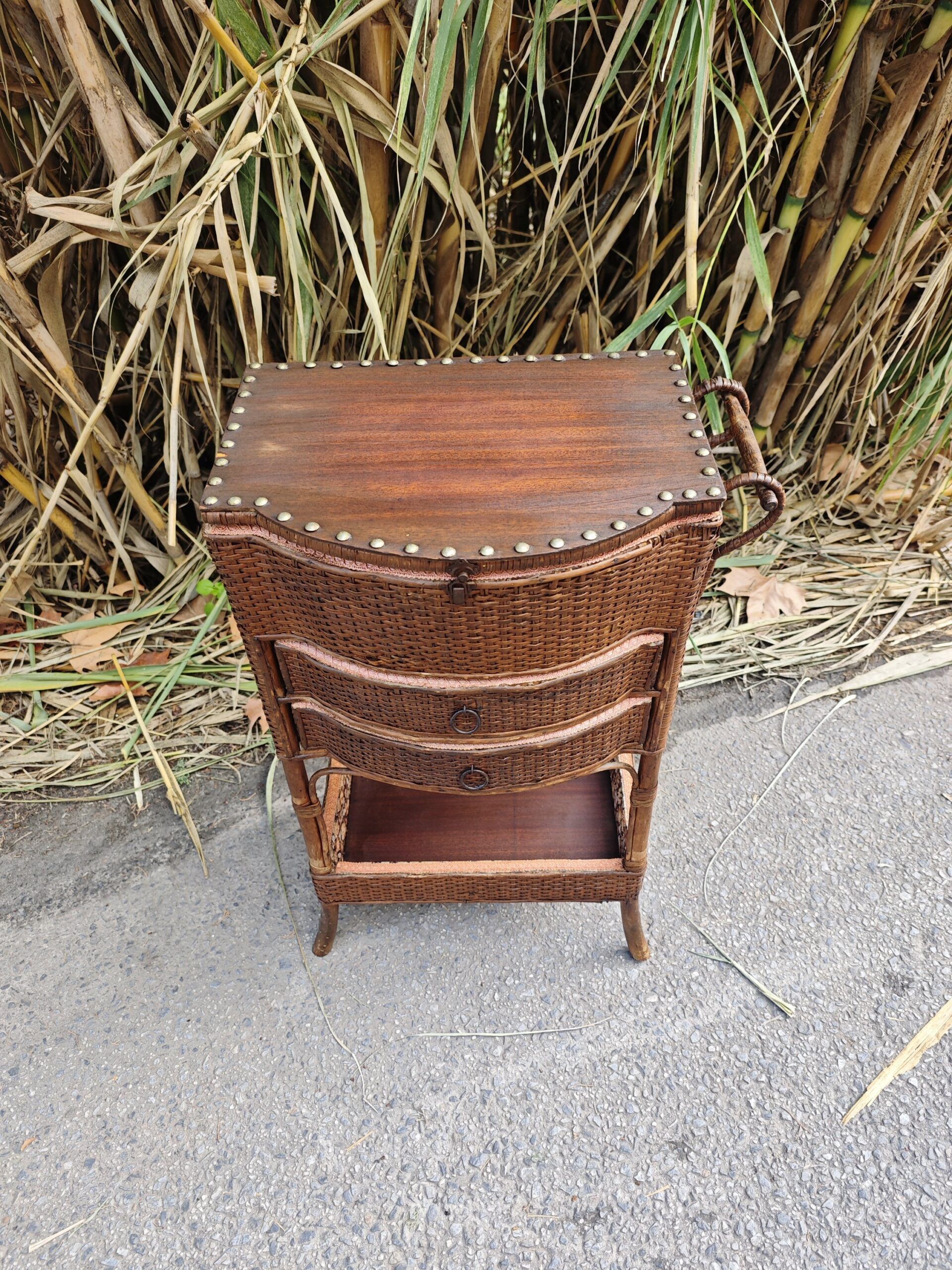 Este costurero antiguo es una pieza de coleccionista con sello de autenticidad de la prestigiosa fábrica Hijos de F. Sánchez, referente histórico de la cestería y muebles de junco en Madrid. Fabricado artesanalmente a mediados del siglo XX, el mueble destaca por su estructura robusta de junco entrelazado y su acabado en un cálido tono castaño.