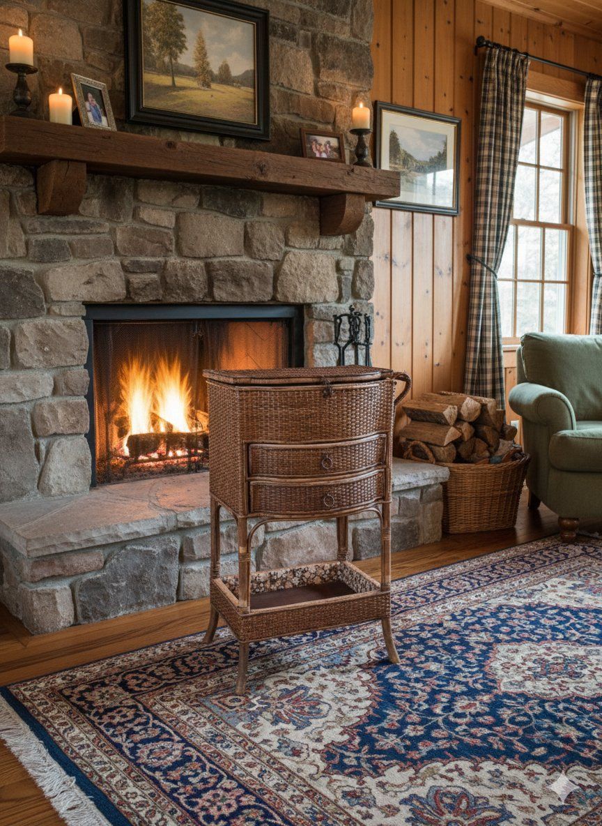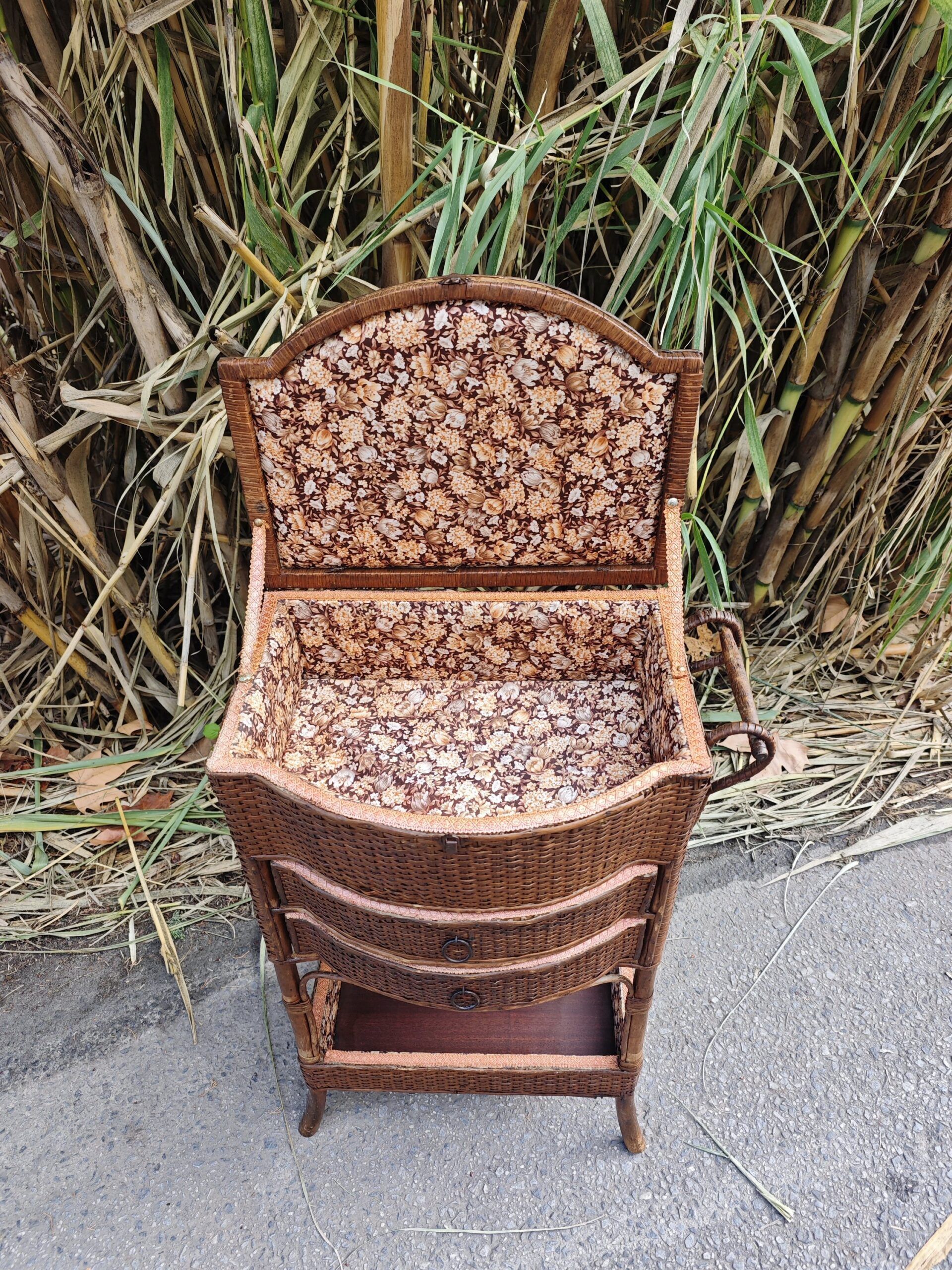 El diseño funcional consta de una tapa superior con cierre de seguridad, que al abrirse muestra un interior bellamente forrado con tela de estampado floral clásico, ideal para organizar hilos y herramientas de costura. Cuenta además con dos cajones frontales curvos con tiradores metálicos tipo anilla y una balda inferior de madera reforzada para almacenamiento adicional. La combinación de fibras naturales y el sello de fabricación madrileña lo convierten en un objeto de decoración rústica y vintage con gran valor histórico y estético.