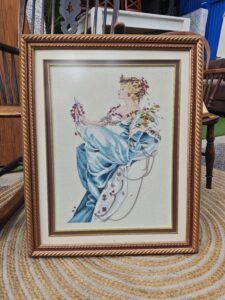 Esta obra de punto de cruz representa a una mujer sentada en una silla ornamentada, vestida con un majestuoso vestido azul de amplias capas que caen con elegancia. La figura transmite serenidad y contemplación, con la mirada baja y un ramo de flores en sus manos, mientras otras flores adornan su cabello. El bordado destaca por su minucioso trabajo de sombreado, que da volumen al vestido y profundidad a la escena. Cada puntada está cuidadosamente colocada para crear texturas realistas en los pliegues de la tela, el tapizado de la silla y los pétalos del ramo. El marco dorado con detalles marrones complementa el estilo clásico de la obra, convirtiéndola en una pieza central ideal para cualquier espacio que valore la artesanía tradicional y la estética romántica.