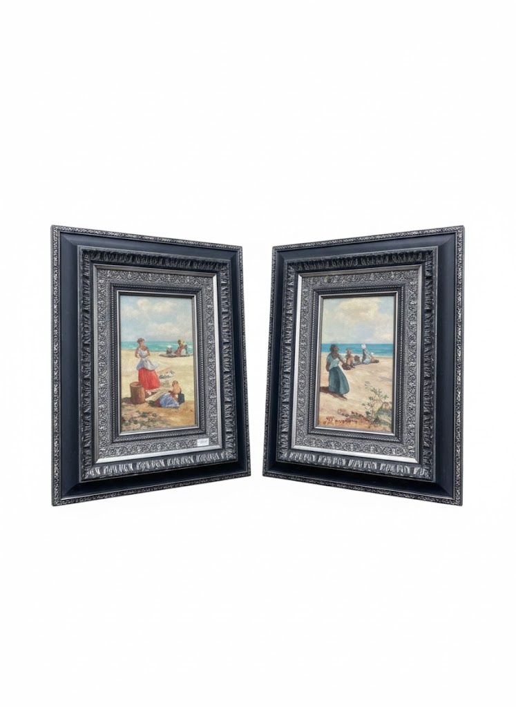 Estos cuadros pintados a mano representan una escena costera tradicional, con figuras femeninas y niños en la playa, capturando momentos cotidianos de descanso y actividad junto al mar. La composición transmite serenidad y vida, con una paleta de colores suaves y detalles que evocan el ambiente cálido y humano de las costas mediterráneas.