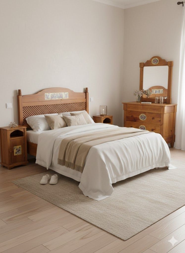 Conjunto de Dormitorio Rústico con Azulejos Florales – Artesanía con Encanto Mediterráneo