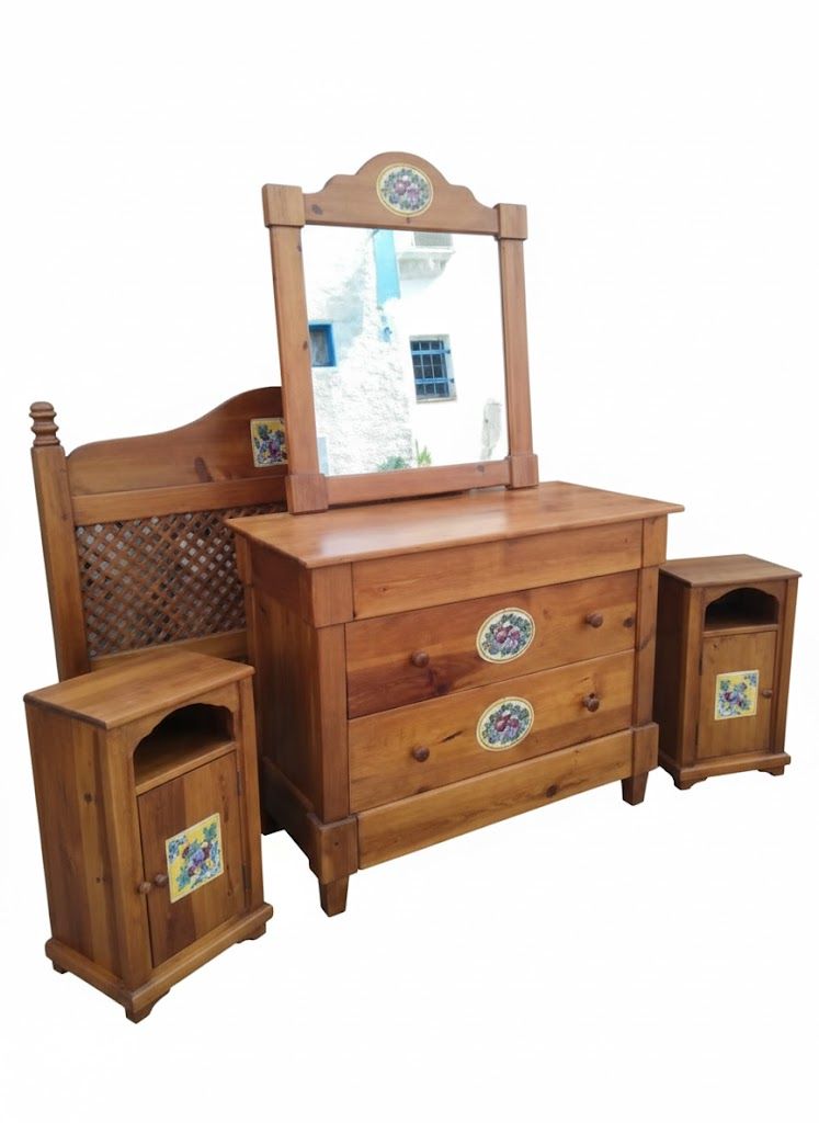 Este conjunto de dormitorio artesanal combina la calidez de la madera maciza con el colorido de los azulejos pintados a mano, creando un ambiente acogedor y lleno de personalidad. Cada pieza ha sido cuidadosamente elaborada con detalles únicos que evocan el estilo mediterráneo y rústico, ideal para quienes valoran la autenticidad y el diseño tradicional.