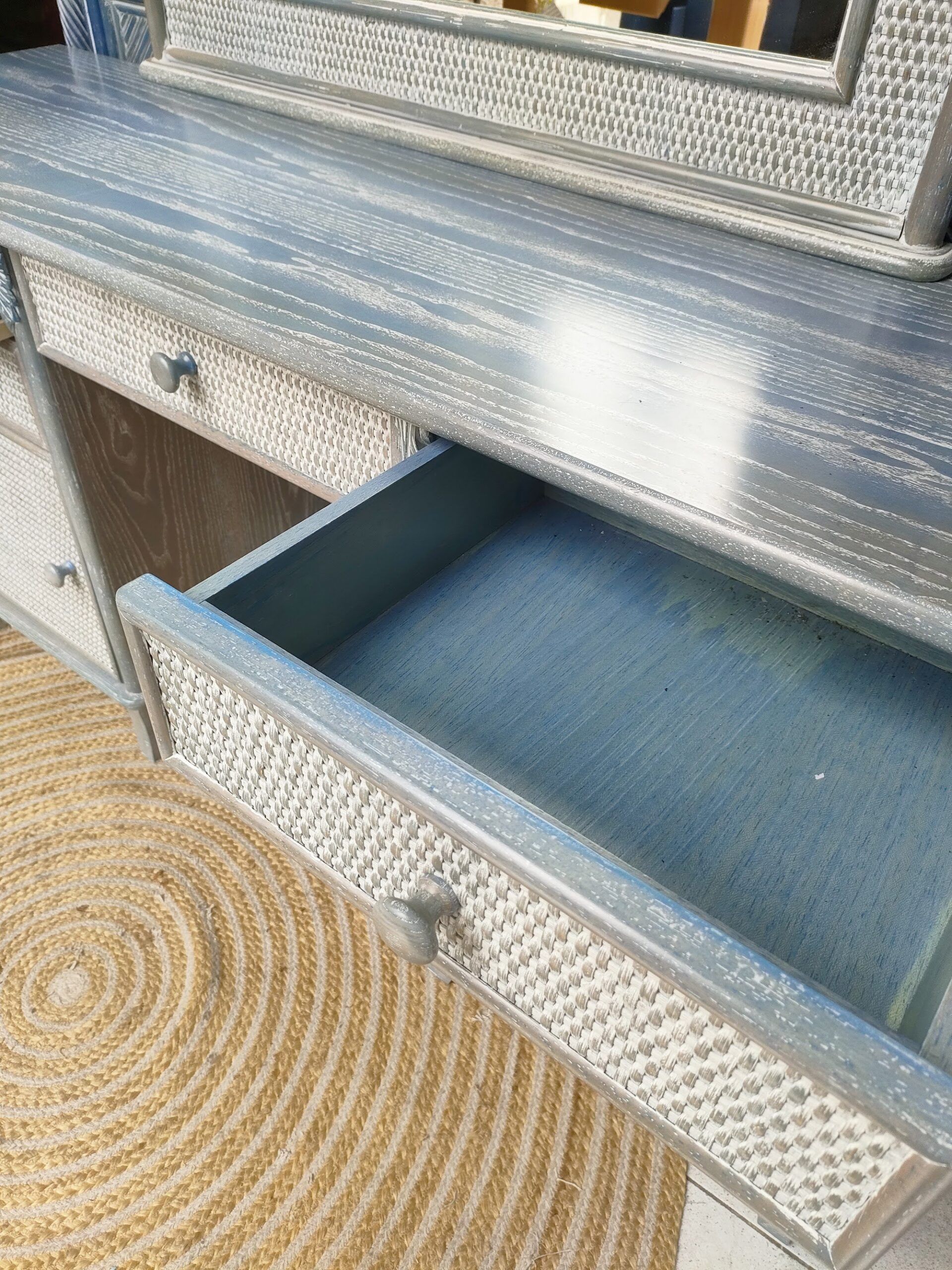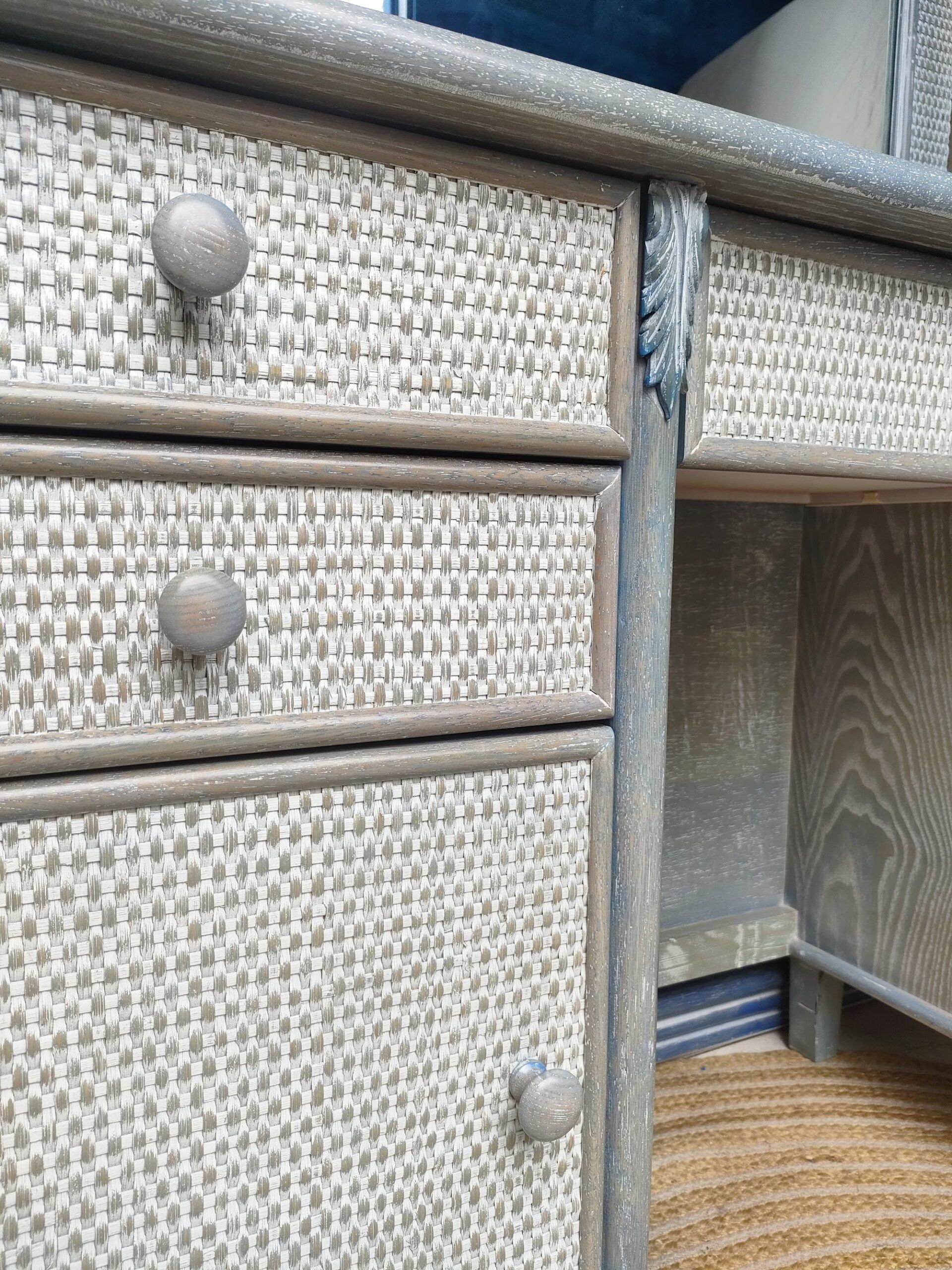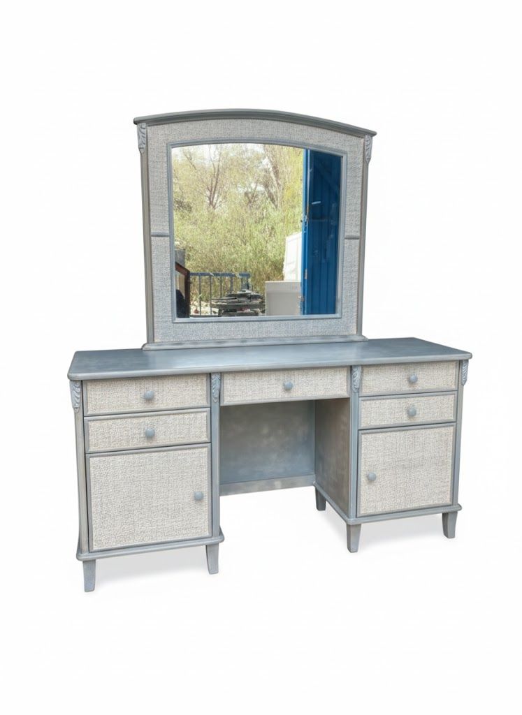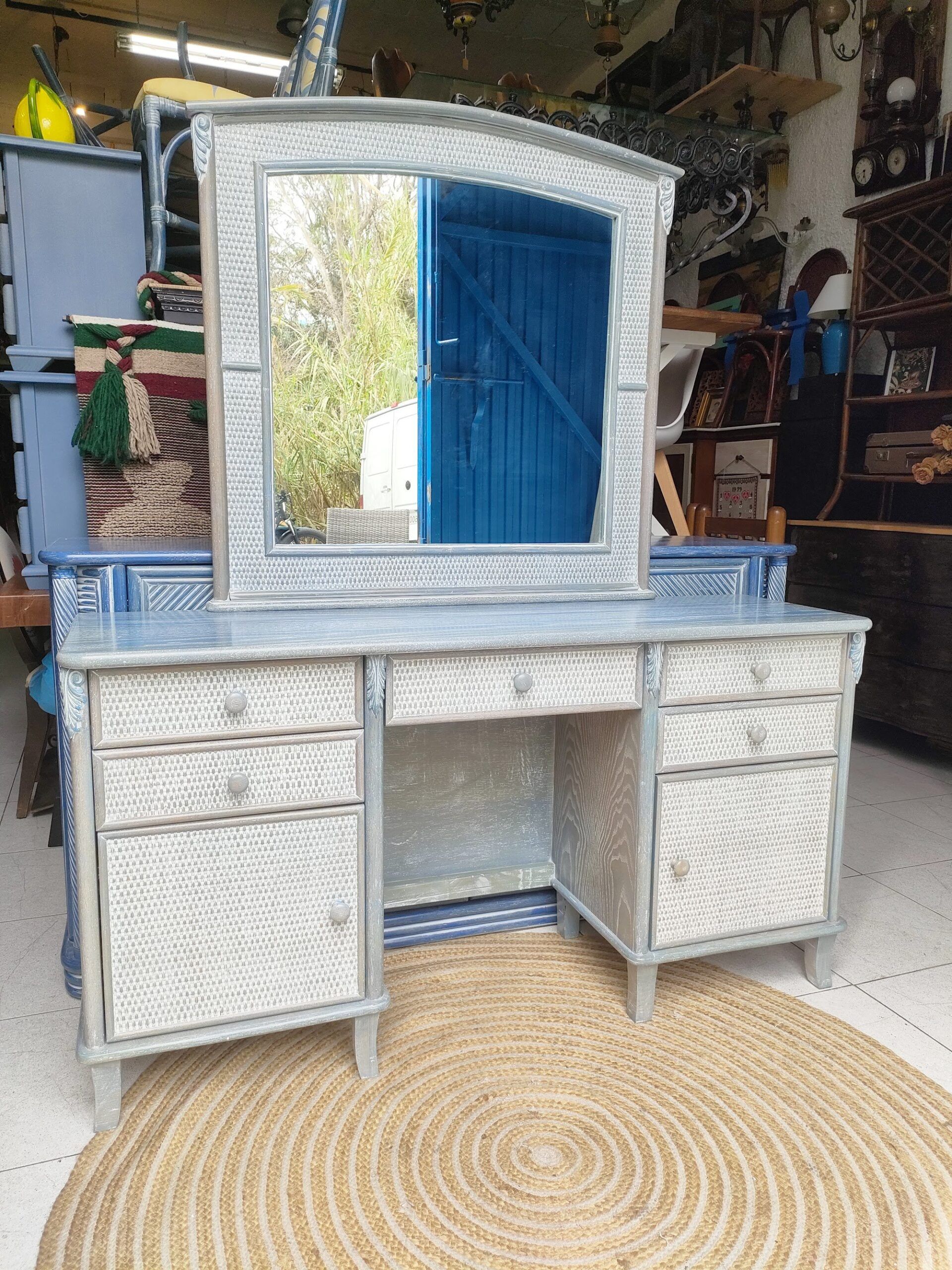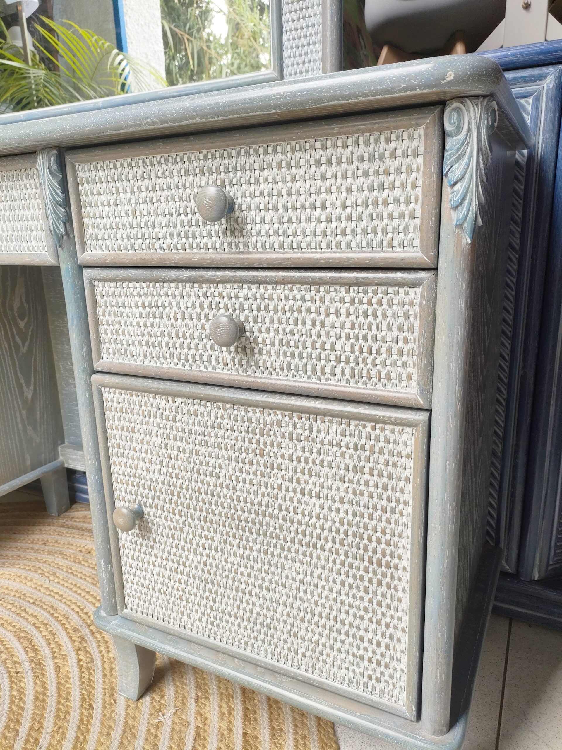 Escritorio Tocador de estilo vintage con estructura de madera pintada en acabado gris claro decapado, que resalta su textura artesanal y aporta un aire romántico y elegante. La pieza cuenta con siete cajones: tres a cada lado y uno central sobre el hueco de las piernas, todos con tiradores redondos que refuerzan su estética clásica. El frente de los cajones y la superficie presentan un acabado trenzado tipo rejilla, que recuerda al mimbre o ratán, aportando ligereza visual y un toque decorativo distintivo.