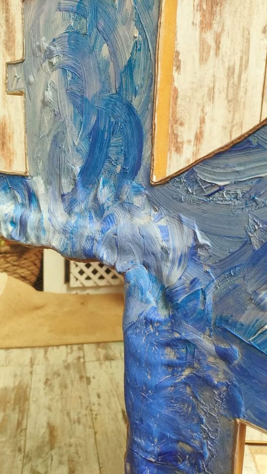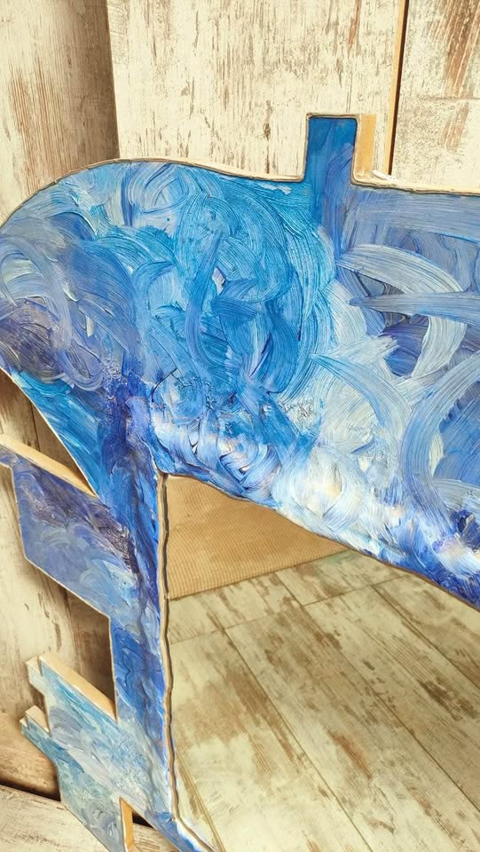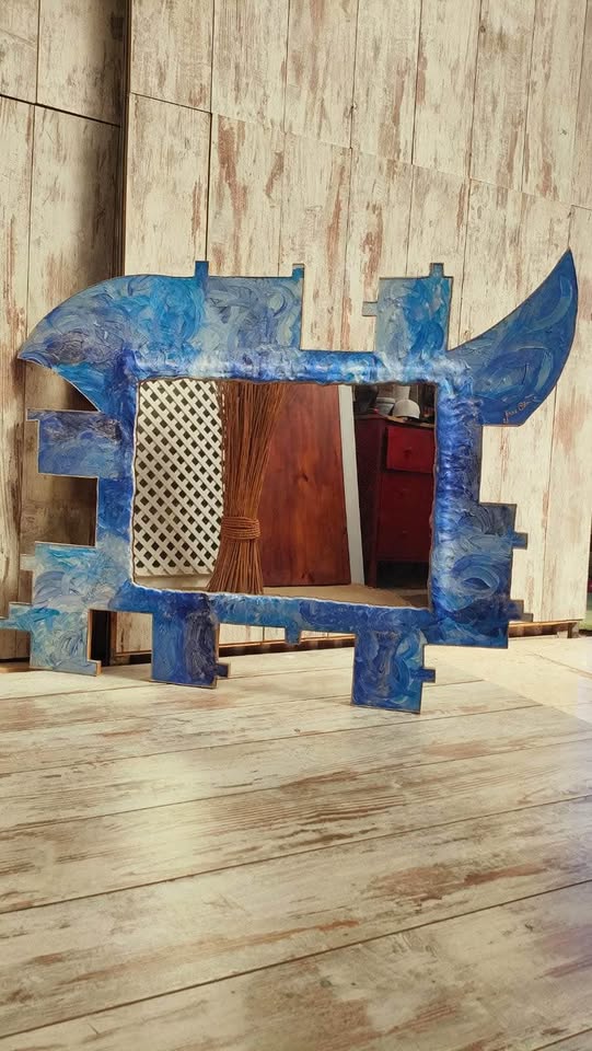 Este espejo artesanal destaca por su marco de diseño único, con formas geométricas y curvas pintadas a mano en tonos azul y blanco, que aportan carácter artístico y personalidad. Con unas medidas de 130 cm de ancho × 100 cm de alto, es una pieza decorativa de gran formato, ideal para salones, recibidores, escaparates o espacios creativos.