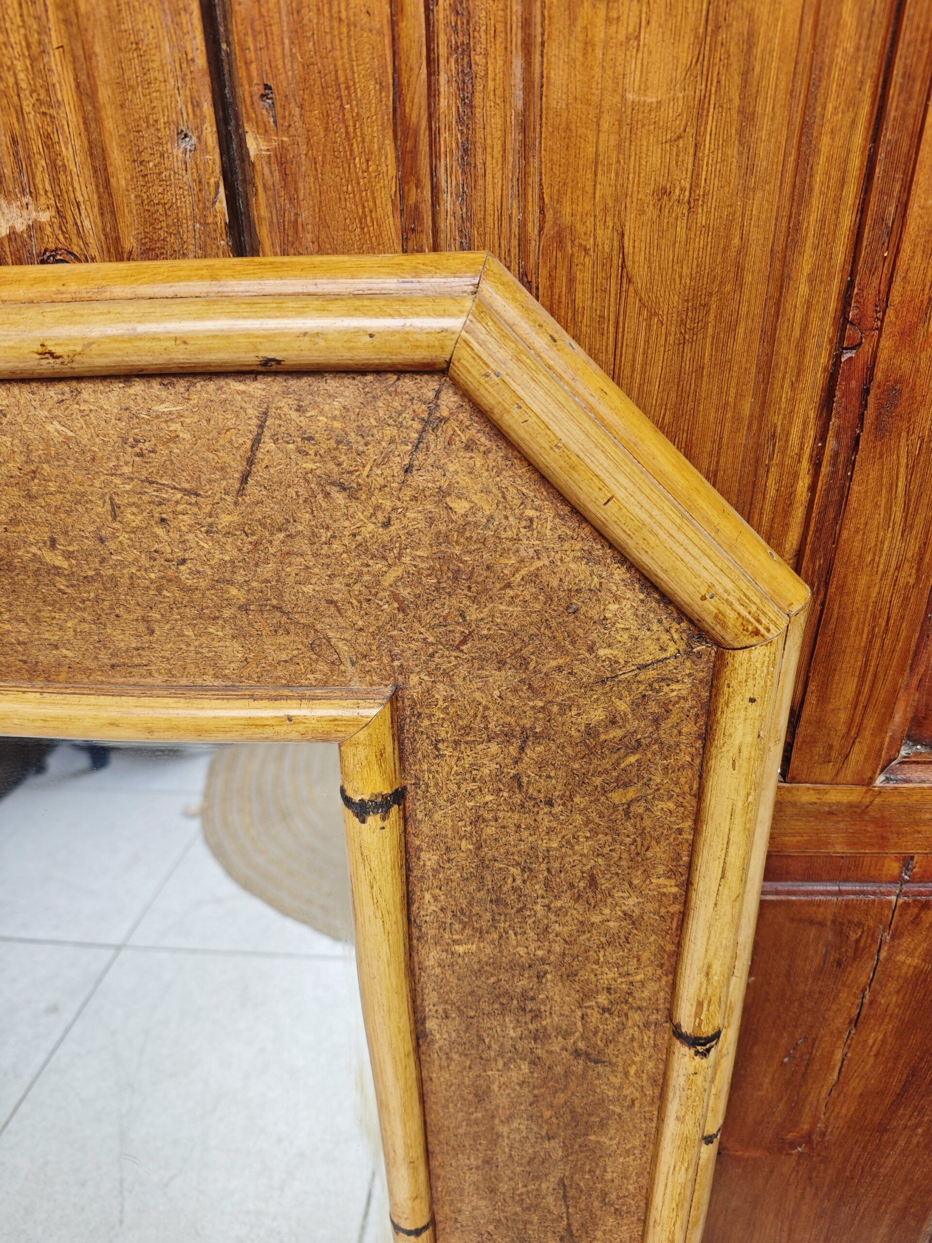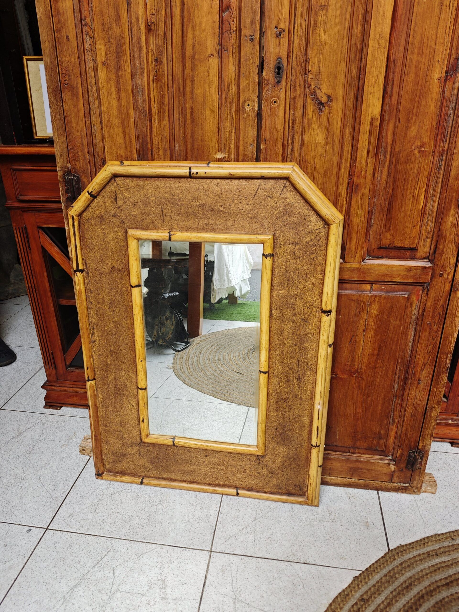 Espejo de bambú con forma irregular y diseño geométrico, ideal para aportar carácter y textura a cualquier ambiente. Su estructura vertical de 68 cm de ancho por 94 cm de alto está compuesta por cañas de bambú ensambladas con un acabado natural, resaltando las uniones artesanales y la calidez del material.