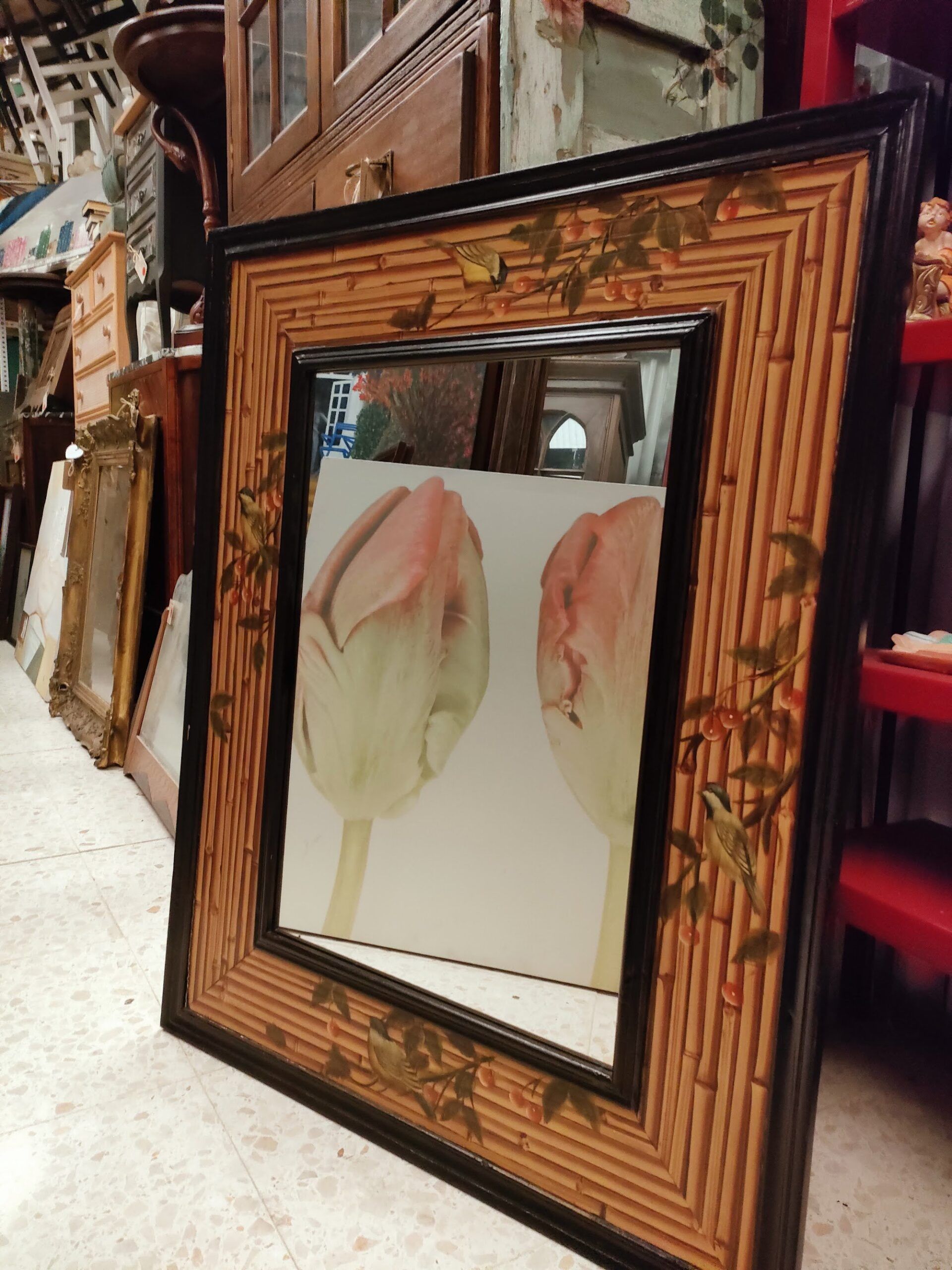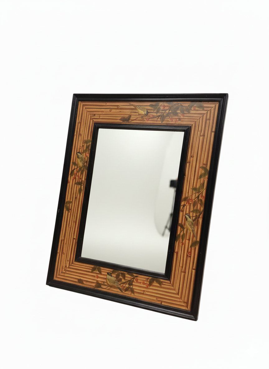 Realza la decoración de tu hogar con este espejo de pared decorativo único en su estilo. Este espejo destaca por su marco de madera con efecto bambú, que aporta una calidez orgánica y un toque oriental o boho-chic a cualquier estancia. El diseño se ve enriquecido por hermosas ilustraciones pintadas a mano que representan pájaros en ramas de cerezo, creando una pieza artística más que un simple objeto funcional.