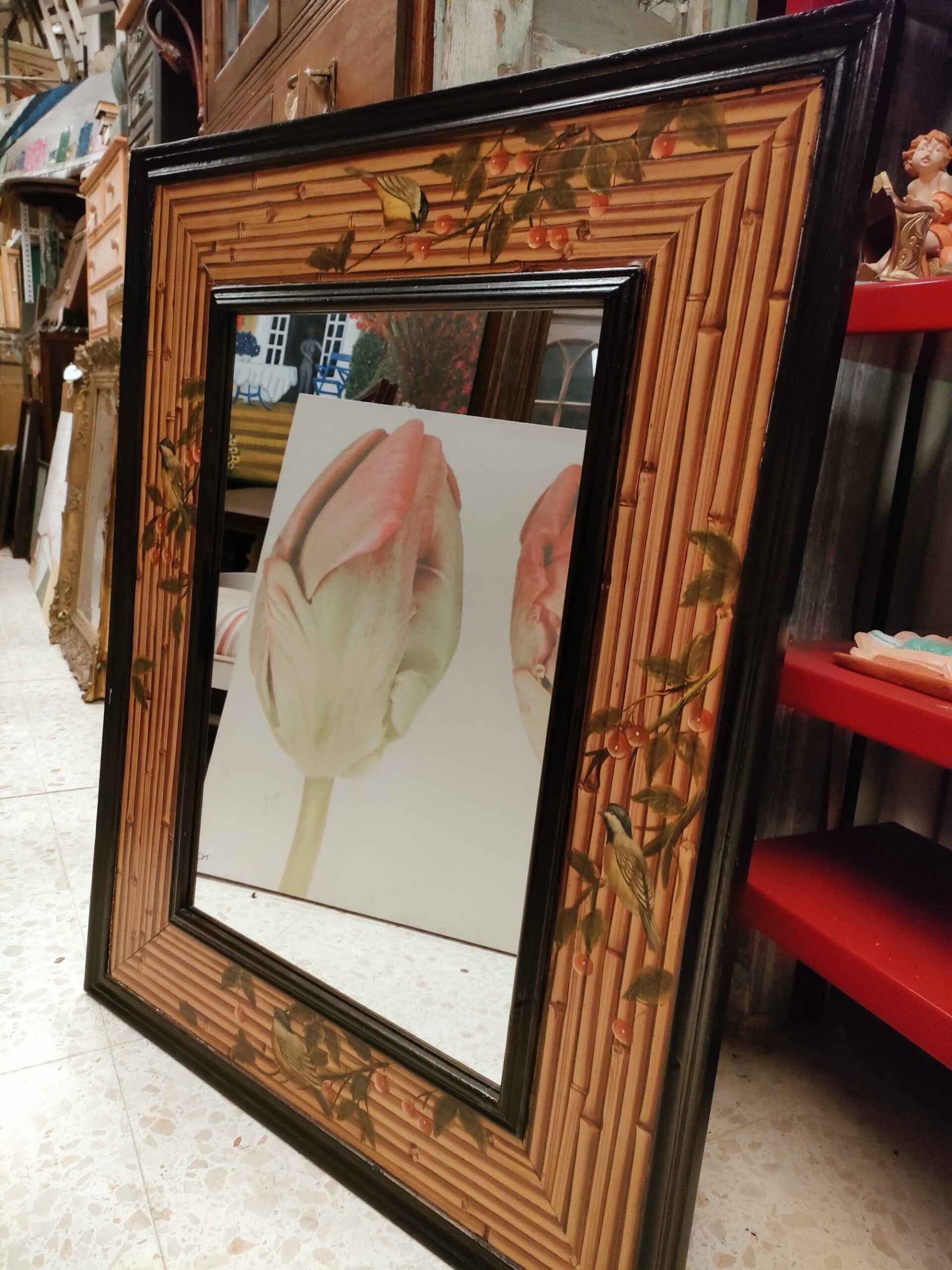 El marco cuenta con un elegante perfil exterior en color negro que resalta los tonos naturales del bambú y los colores suaves de las aves. Es una pieza ideal para salones, recibidores elegantes o dormitorios que busquen un punto focal con carácter vintage y artesanal. Su construcción robusta y su acabado detallado garantizan una durabilidad excepcional y un estilo atemporal.