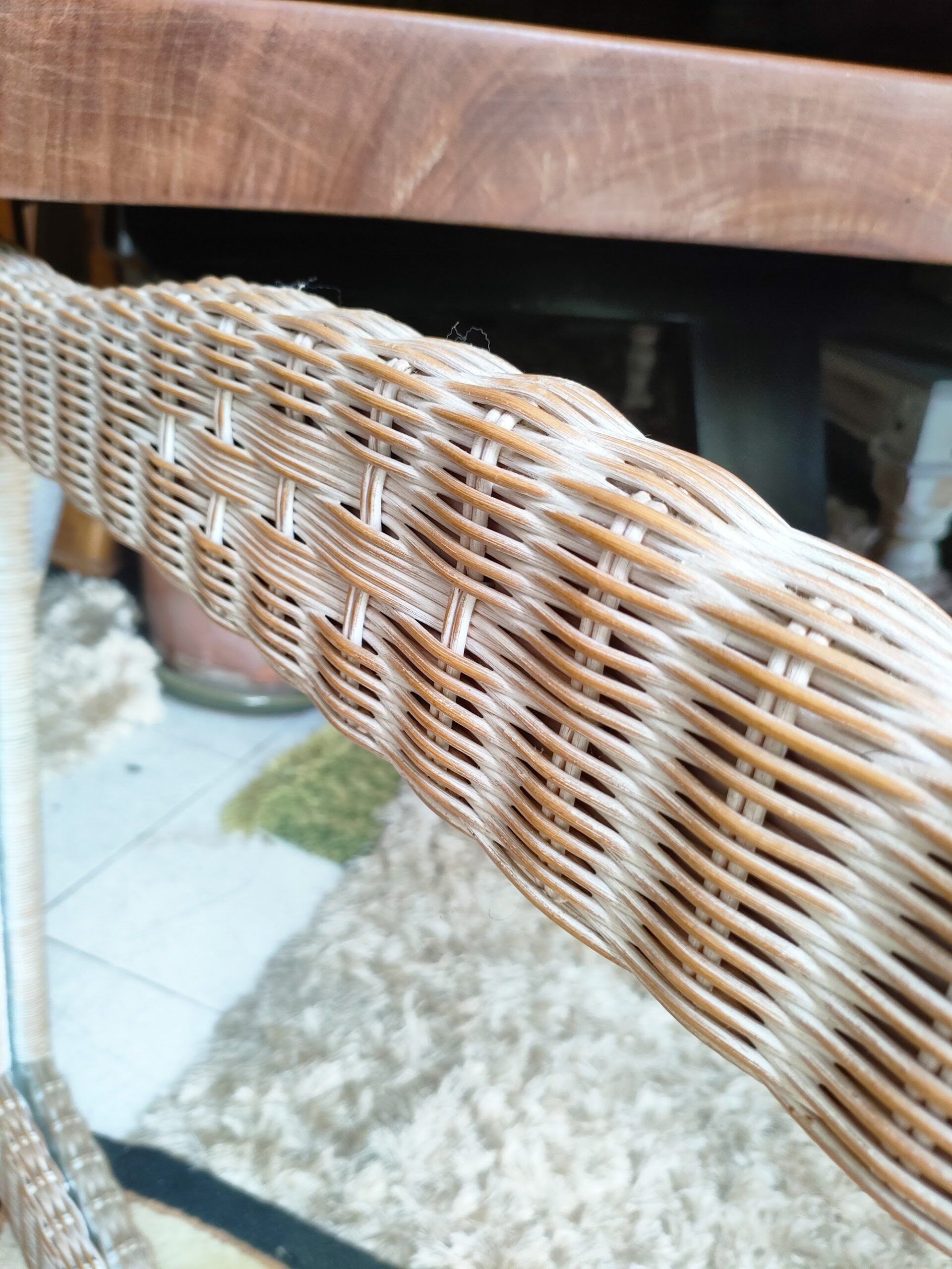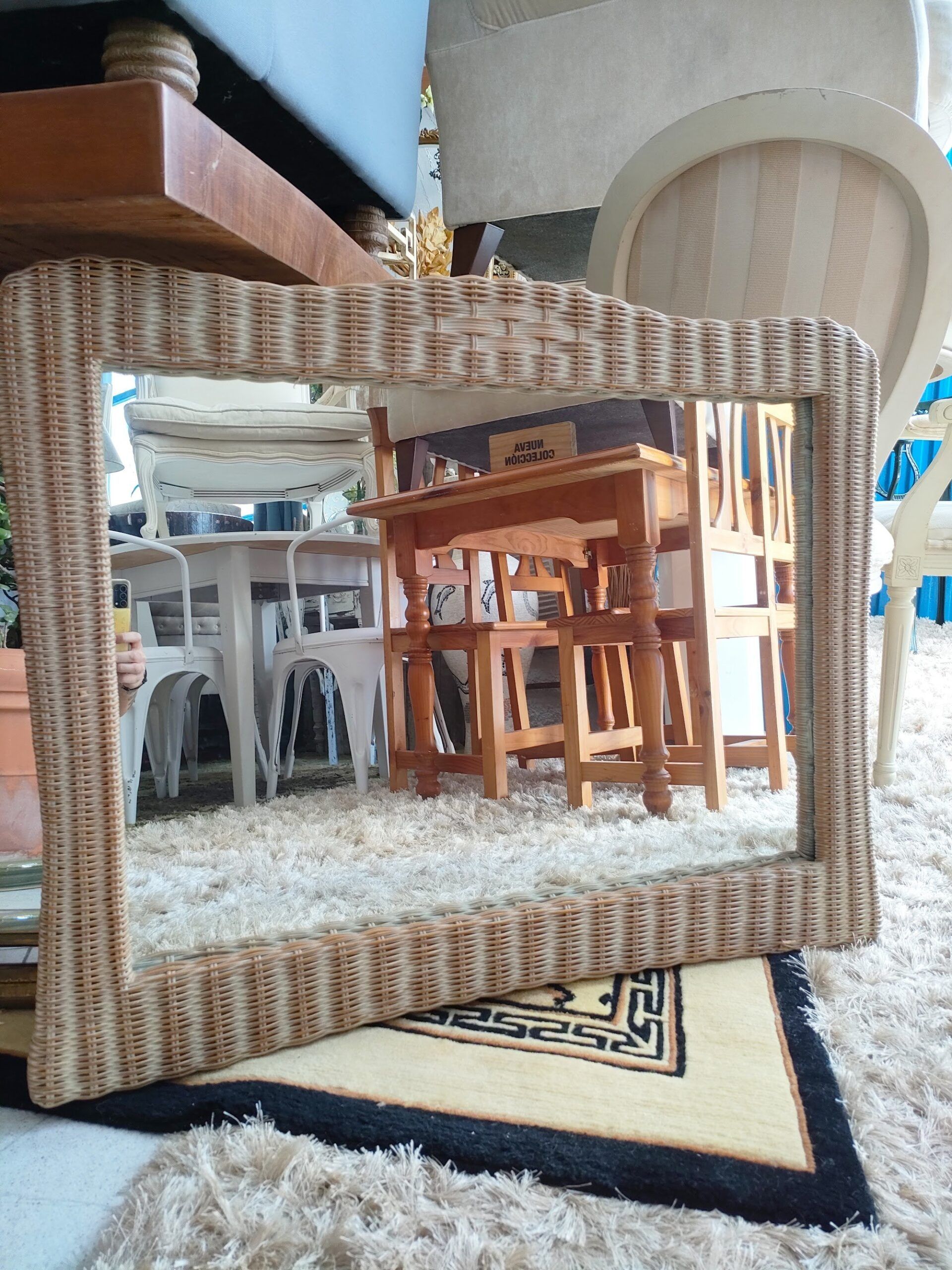 El marco, elaborado en fibras de ratán entrelazadas, aporta ligereza visual y un toque natural que combina perfectamente con muebles de madera, textiles neutros o cerámica decorativa. Refleja la luz y amplía el espacio, convirtiéndose en un punto focal tanto en salones como en recibidores o dormitorios.