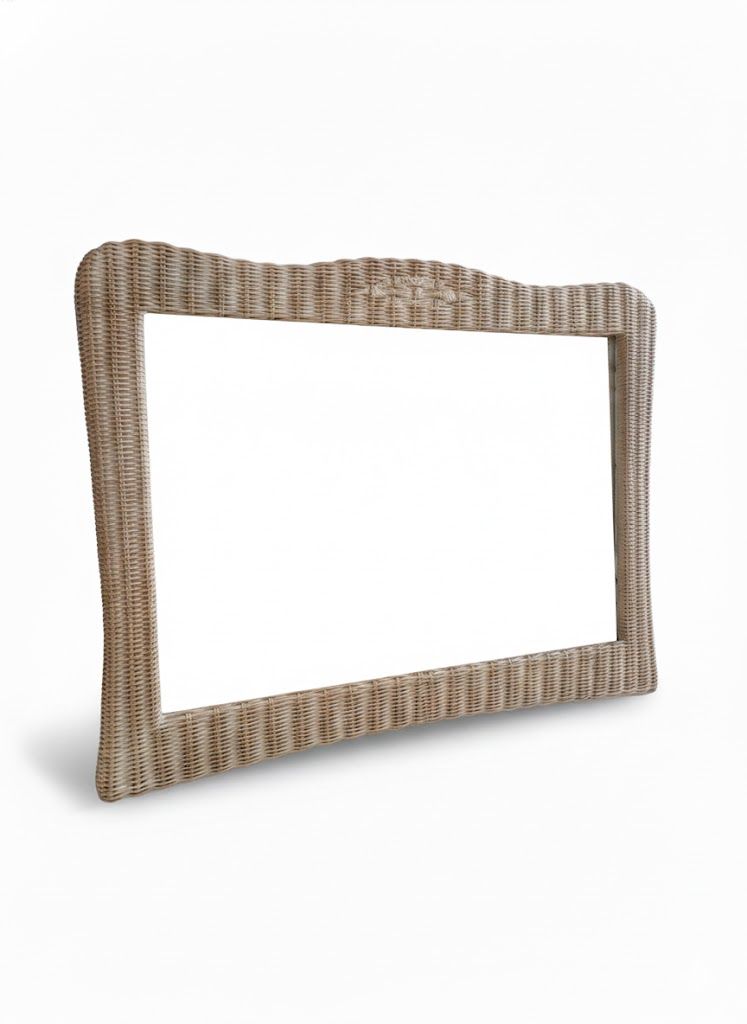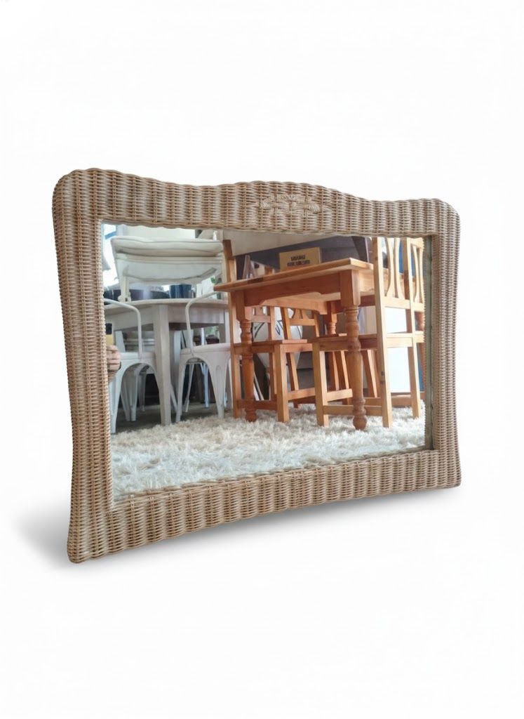Espejo de ratán natural con marco trabajado en forma orgánica y acabado artesanal. Con unas medidas de 87 cm de ancho por 68 cm de alto, esta pieza horizontal destaca por su presencia cálida y su textura envolvente, ideal para ambientes mediterráneos, tropicales o bohemios.