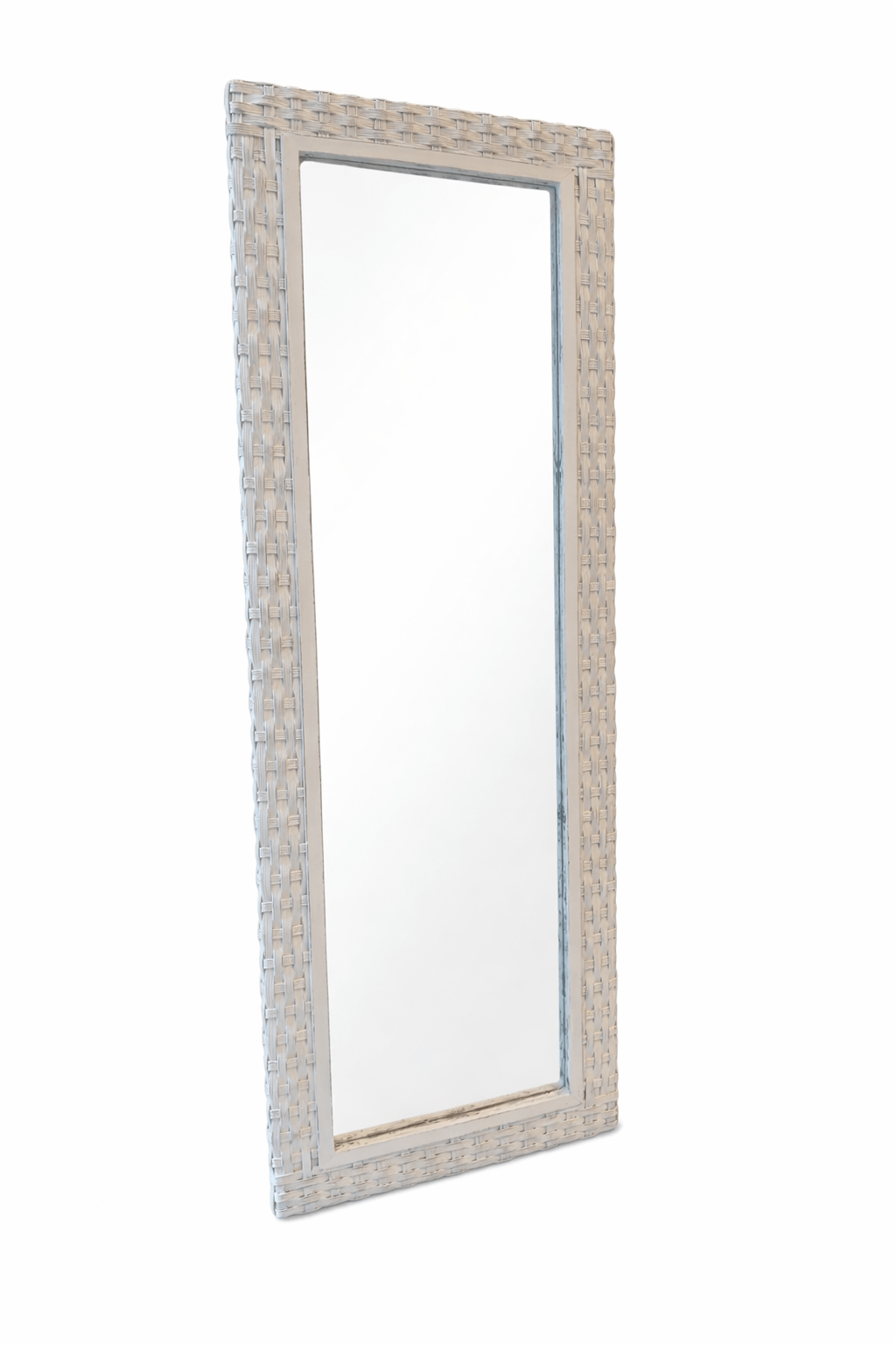 Espejo de ratán natural blanco estilo shabby chic de 180×60 cm. Espejo decorativo de cuerpo entero con marco trenzado artesanal. Ideal para dormitorio, recibidor o vestidor con decoración boho, vintage o provenzal.
