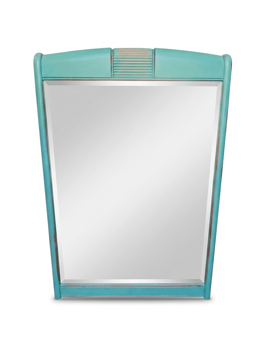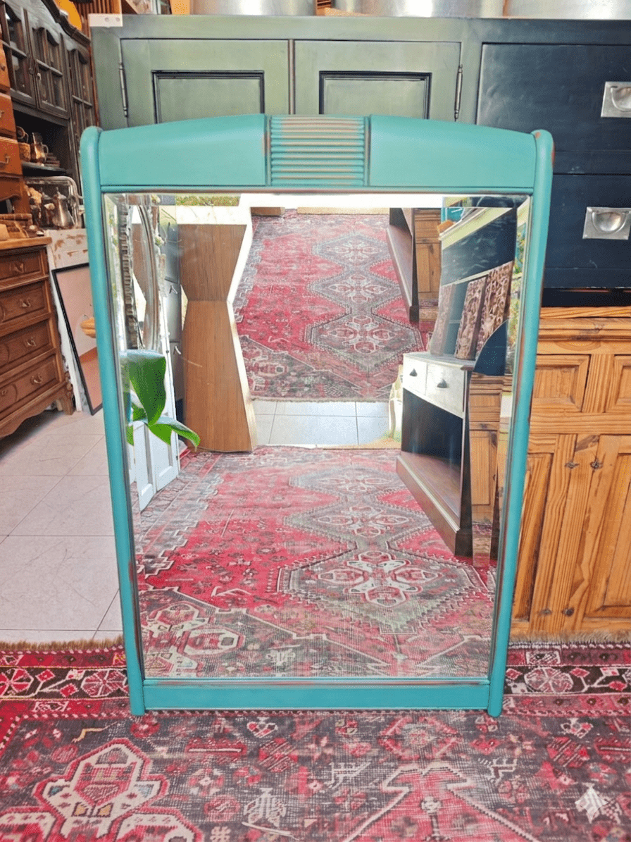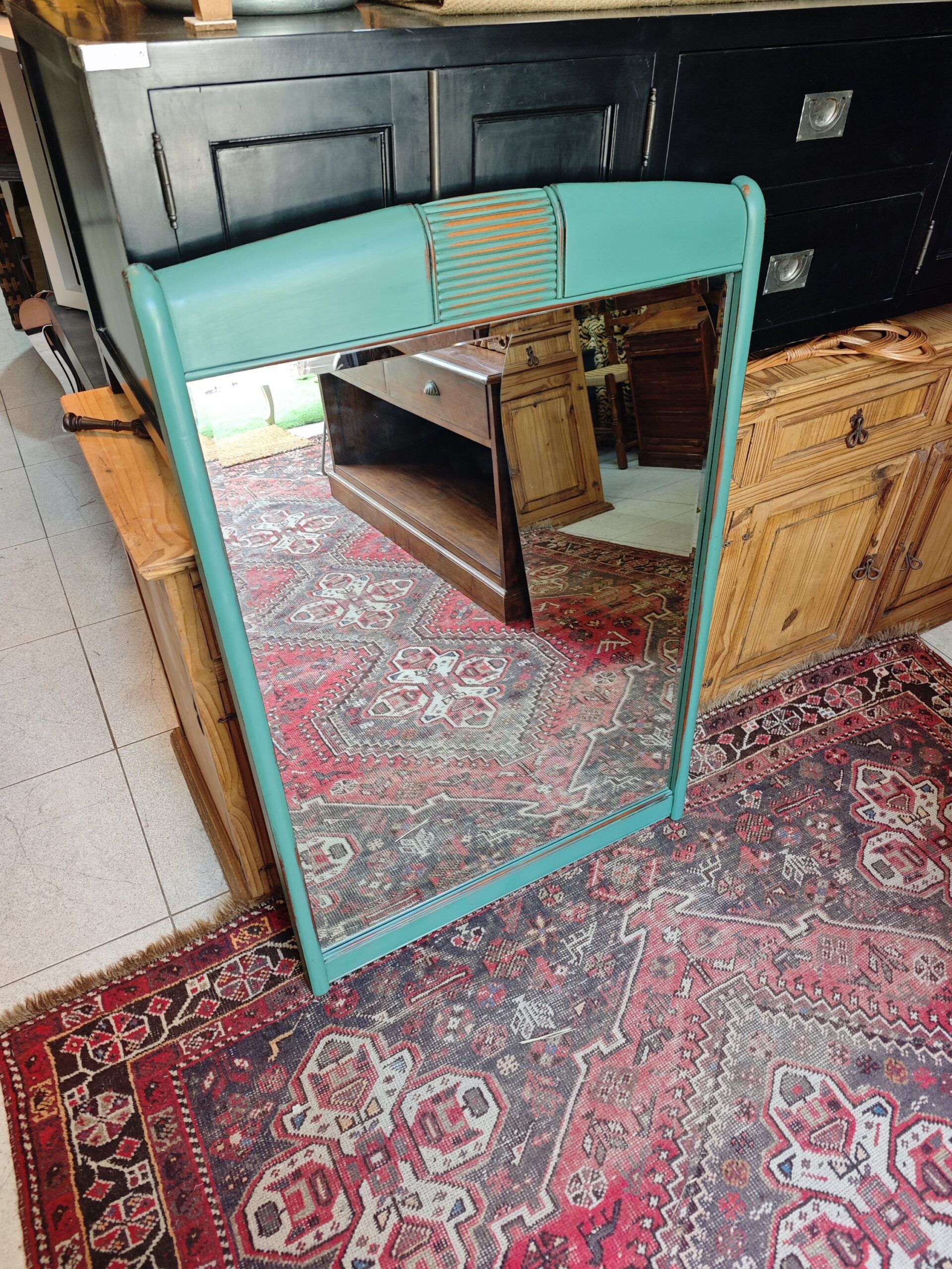 Este magnífico espejo de cuerpo presente es una pieza que exhala carácter y nostalgia. Con un diseño que rinde homenaje a la vanguardia del Art Déco, este espejo no es solo un objeto funcional, sino una declaración de principios estéticos. Su marco, acabado en un cautivador tono verde agua envejecido, aporta una pátina de historia y una frescura que ilumina cualquier estancia.