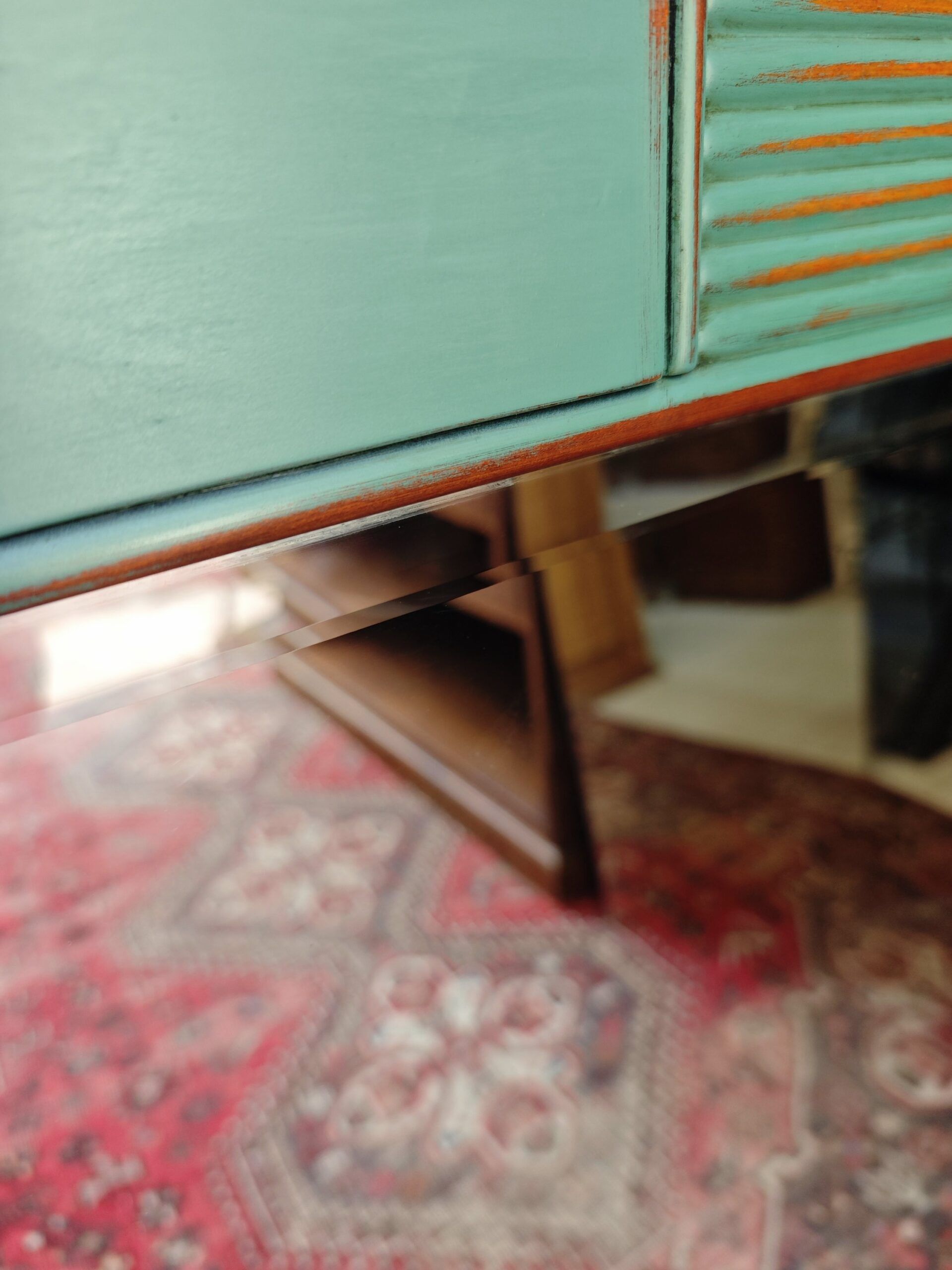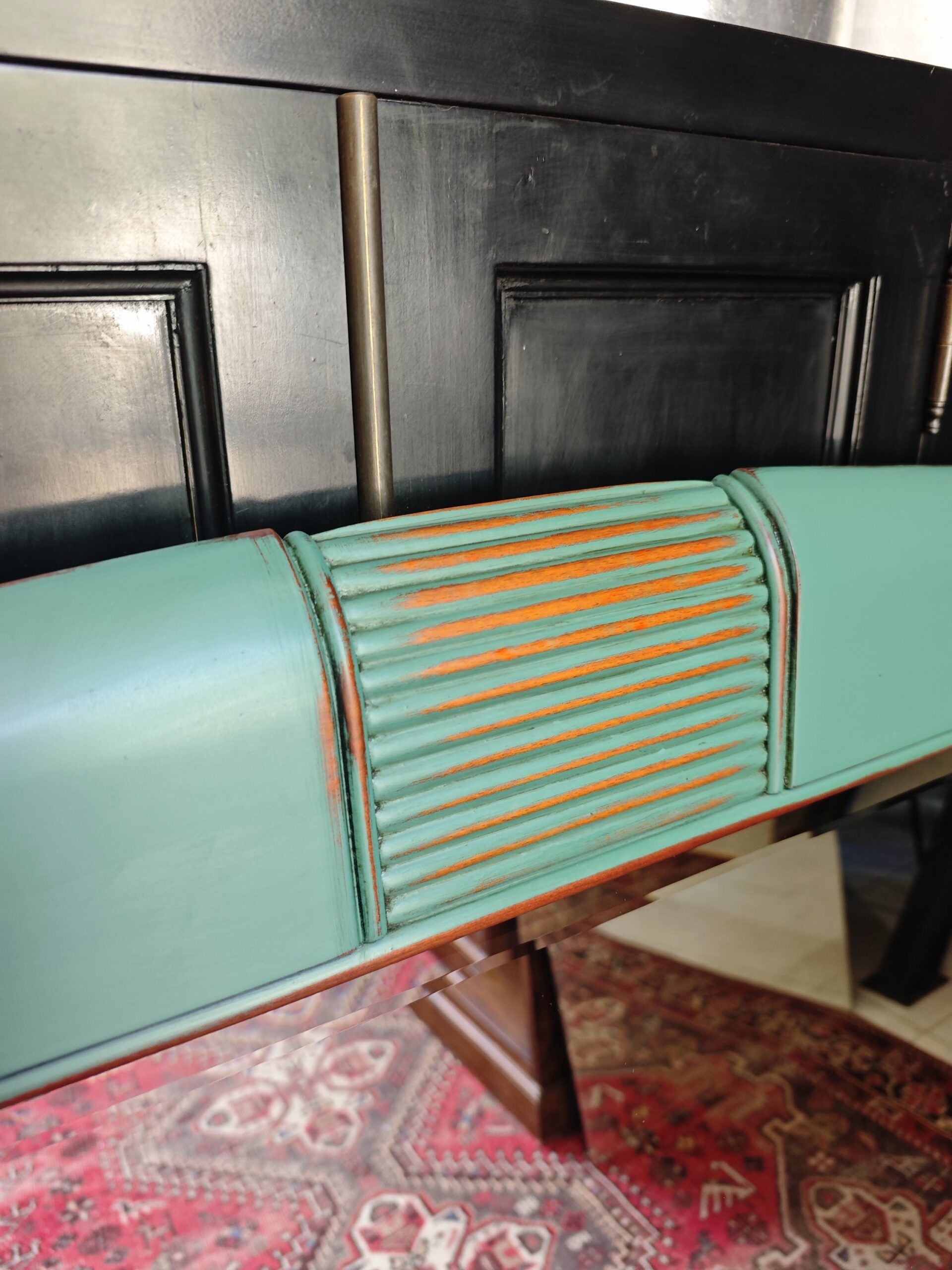 El diseño destaca por su copete superior con relieve de líneas verticales, un motivo geométrico clásico del periodo Art Déco de los años 30 y 40. Esta era se caracterizó por la transición de la ornamentación floral hacia la simetría industrial y arquitectónica. El acabado actual, con sutiles desgastes en las aristas, le confiere ese look «shabby chic» que suaviza sus líneas rígidas, haciéndolo perfecto para ambientes que mezclan lo antiguo con lo bohemio.