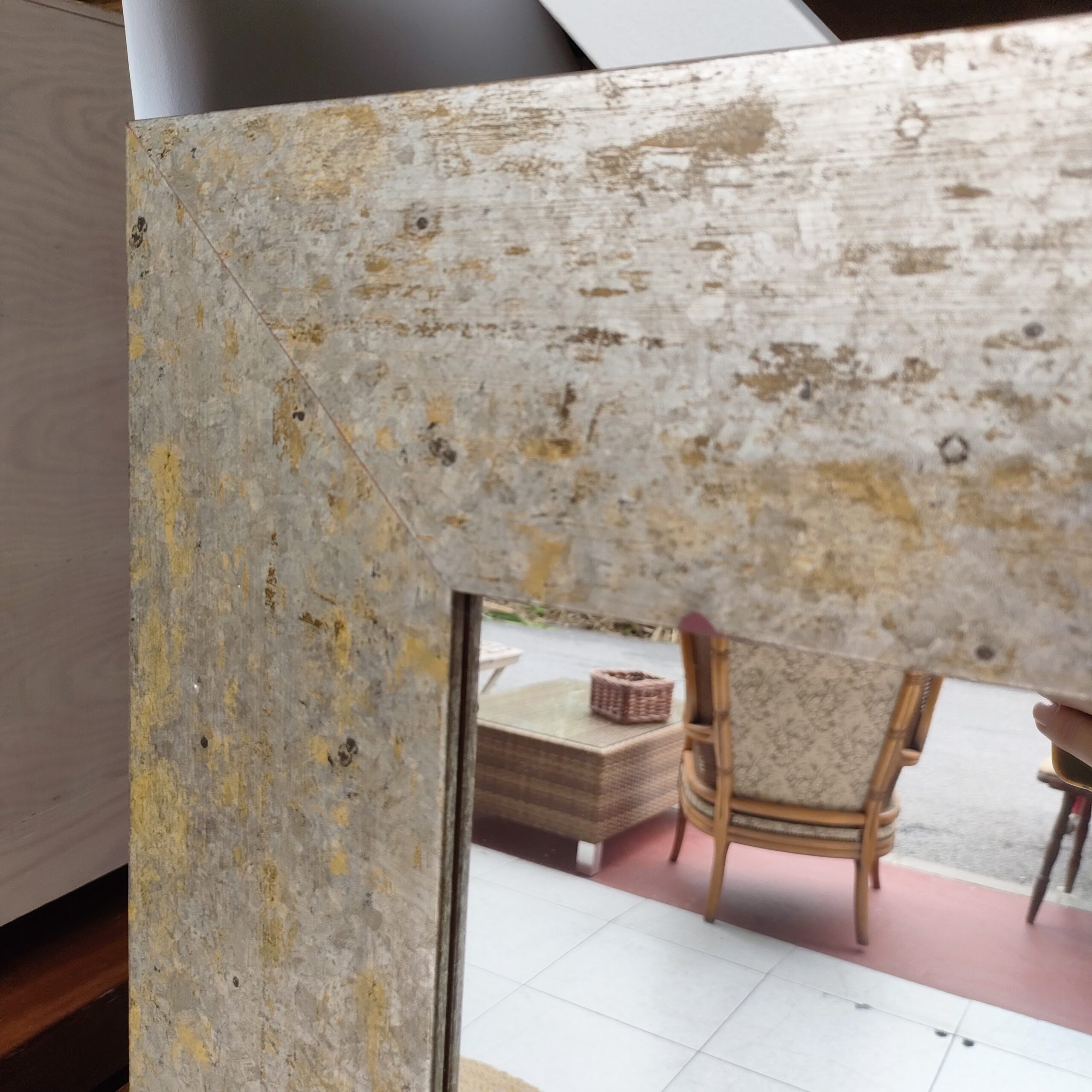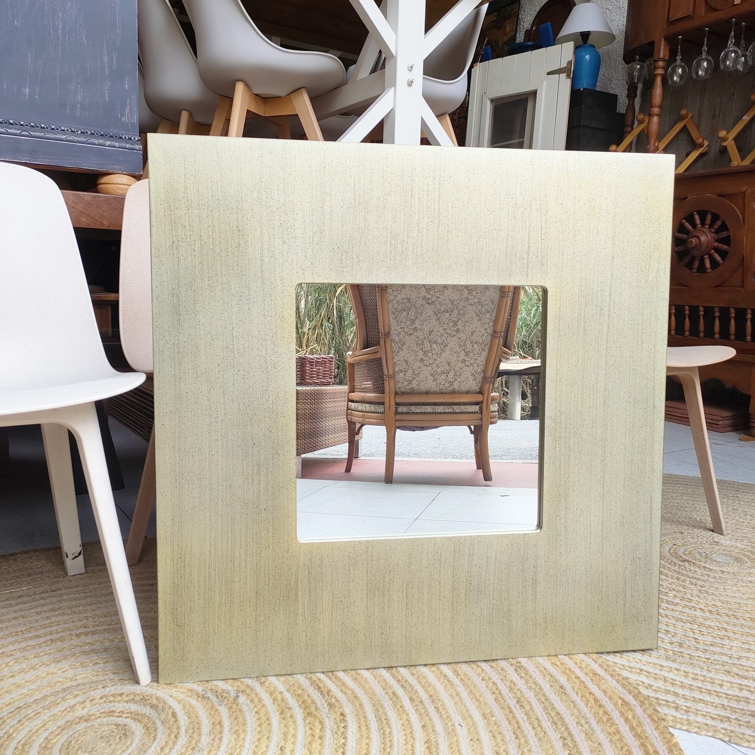 El marco, trabajado en tonos neutros con efecto desgastado, evoca la estética vintage y artesanal, y resalta por su presencia visual sin resultar invasivo. Refleja la luz y amplía visualmente el espacio, mientras que su diseño sobrio permite combinarlo con muebles de madera, fibras naturales o cerámica decorativa.