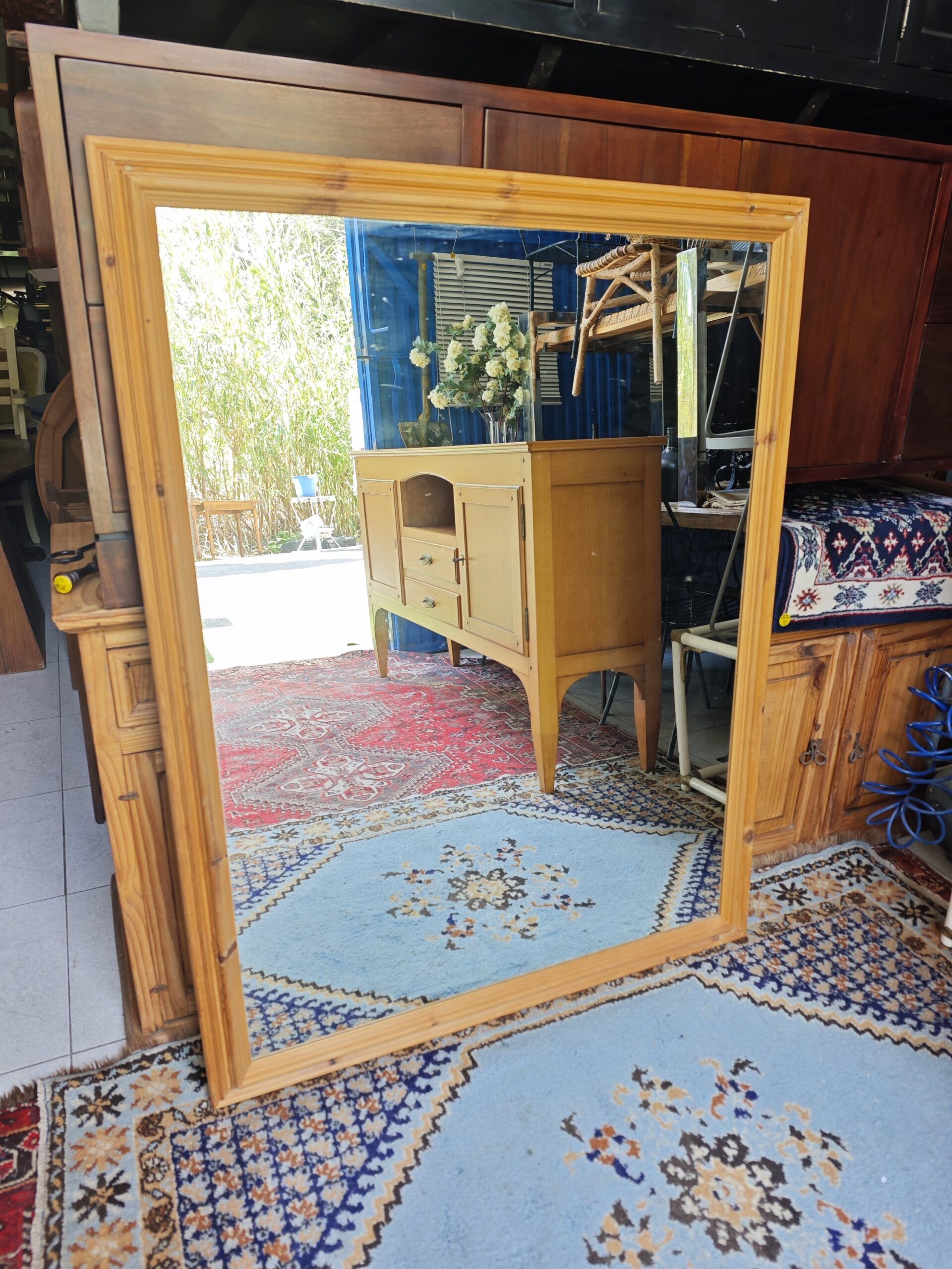 Espejo rectangular de gran formato con marco de madera maciza natural. Ideal para proyectos de decoración que busquen luminosidad y un toque rústico elegante.