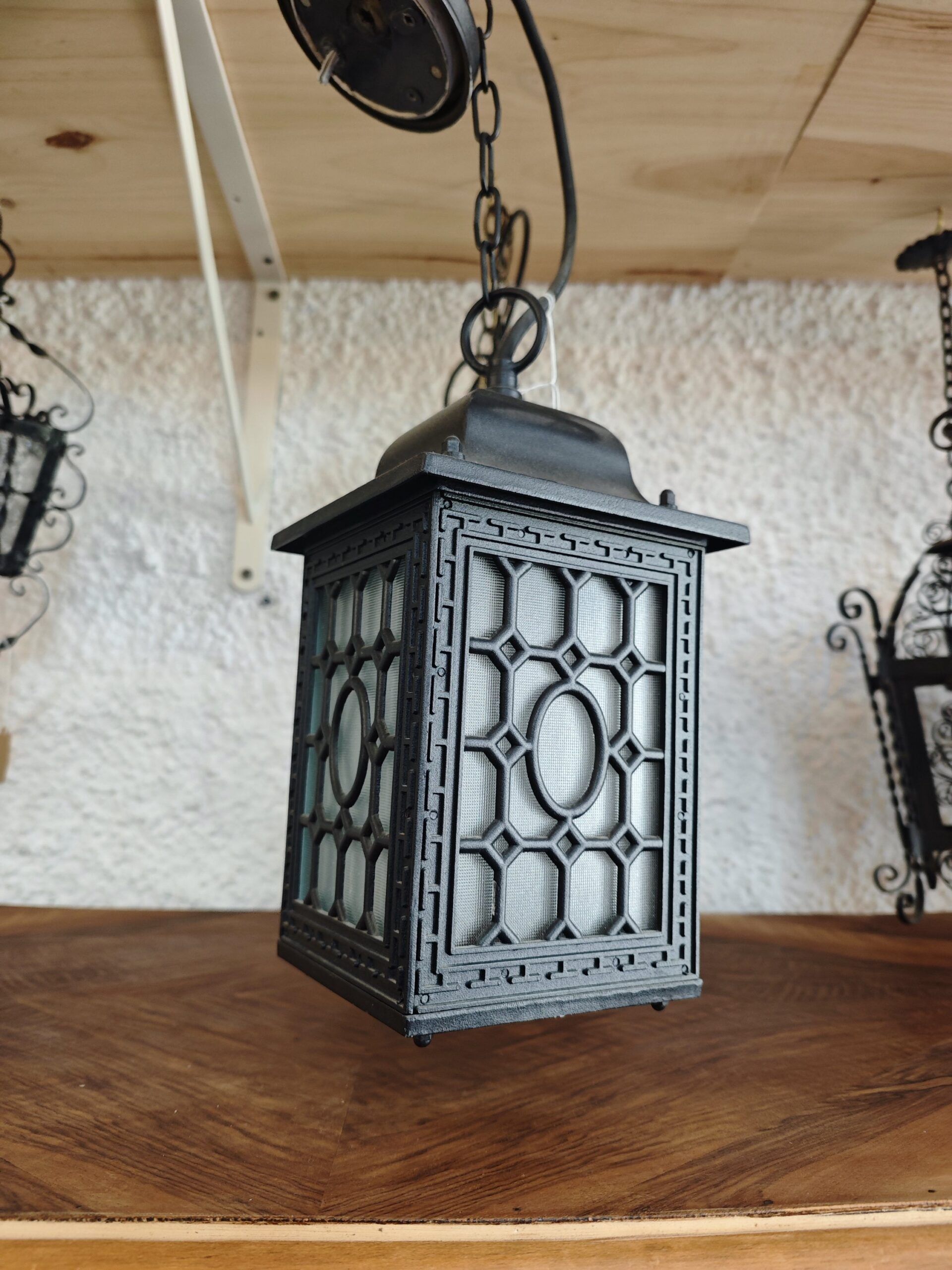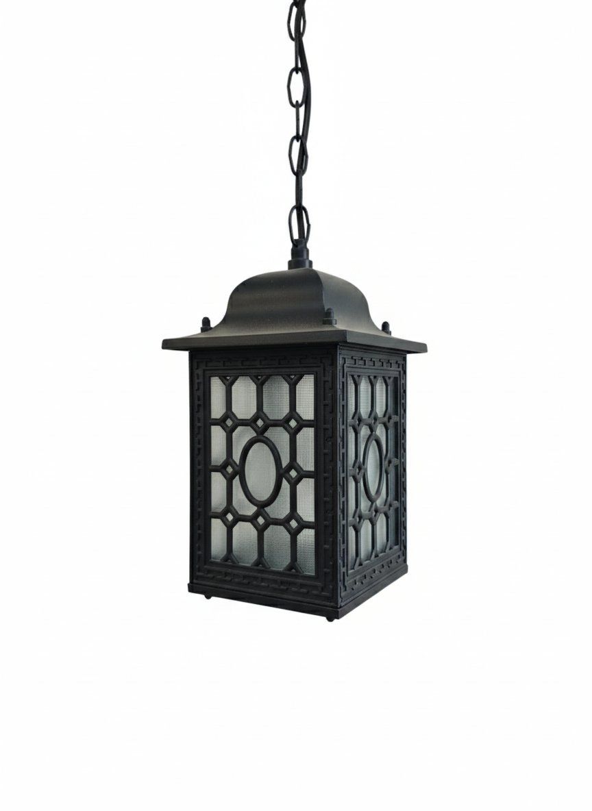 Añade un carácter histórico y artesanal a tu hogar con este farol colgante de forja artística. Fabricado íntegramente en metal de color negro, esta pieza destaca por su elaborado trabajo de herrería que incluye volutas decorativas y refuerzos de metal retorcido. El cuerpo central alberga paneles de cristal opaco con textura, ideales para difundir la luz de manera suave y evitar deslumbramientos, creando una iluminación ambiental acogedora y elegante.