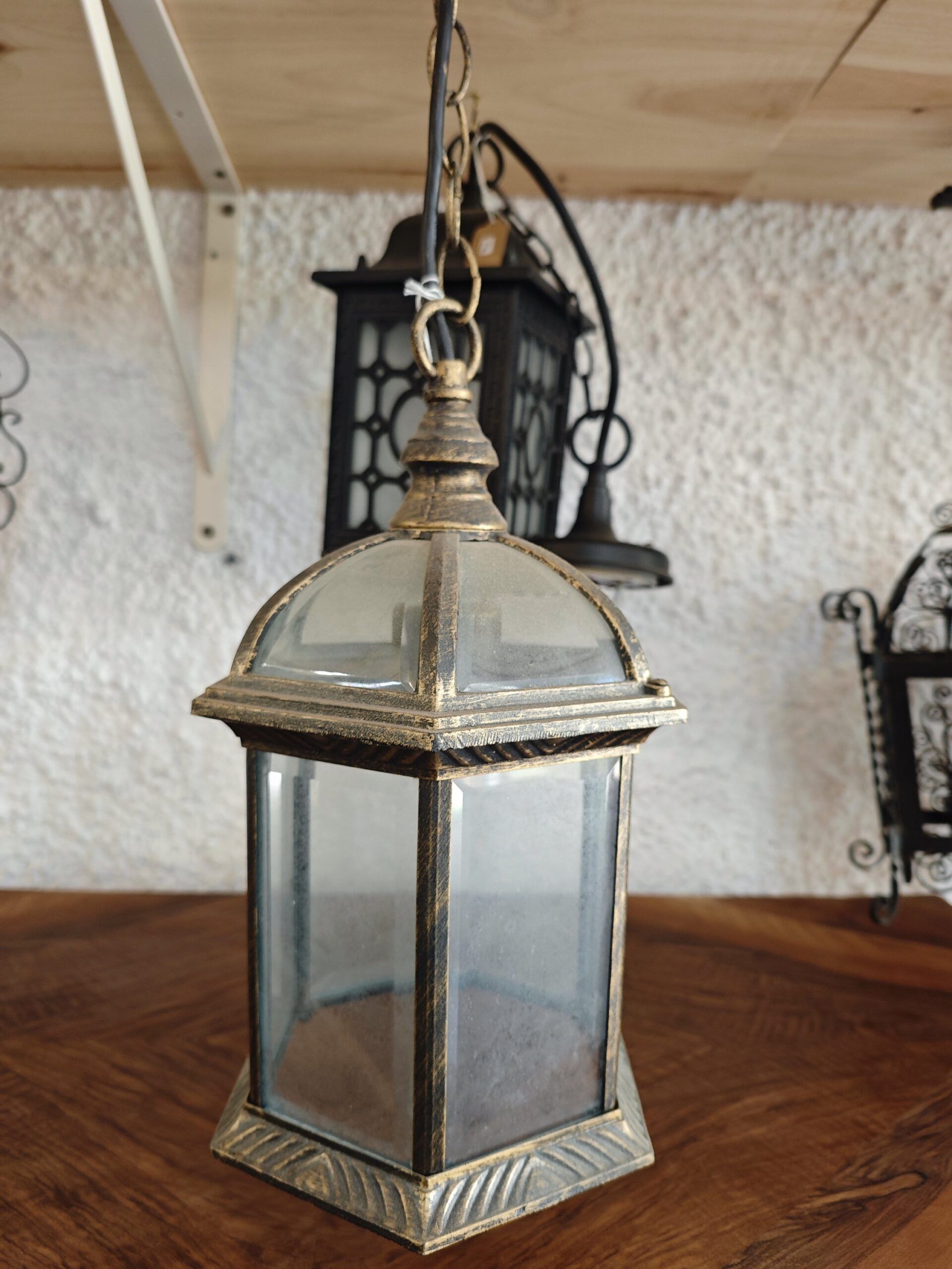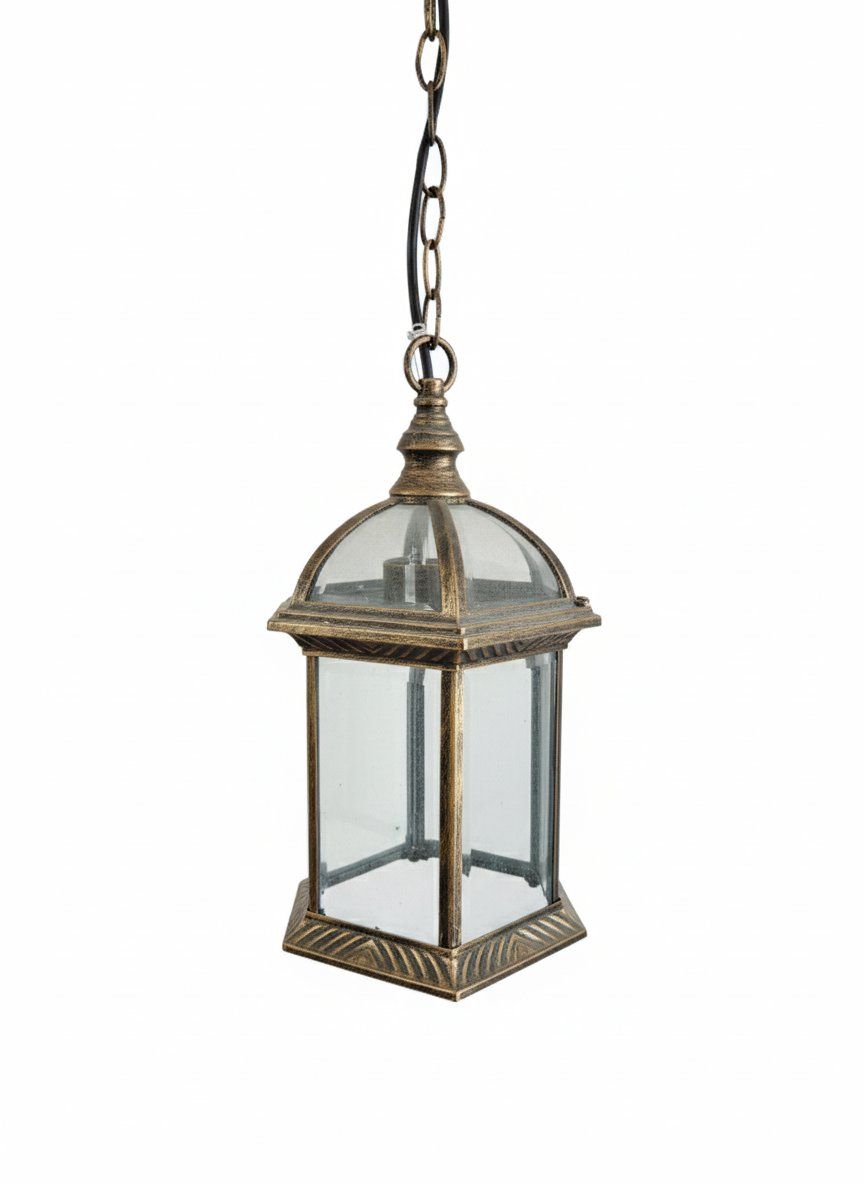 Refinado farol hexagonal de metal con acabado envejecido y paneles de vidrio transparente. Una lámpara colgante clásica ideal para crear ambientes cálidos y acogedores con un aire antiguo.