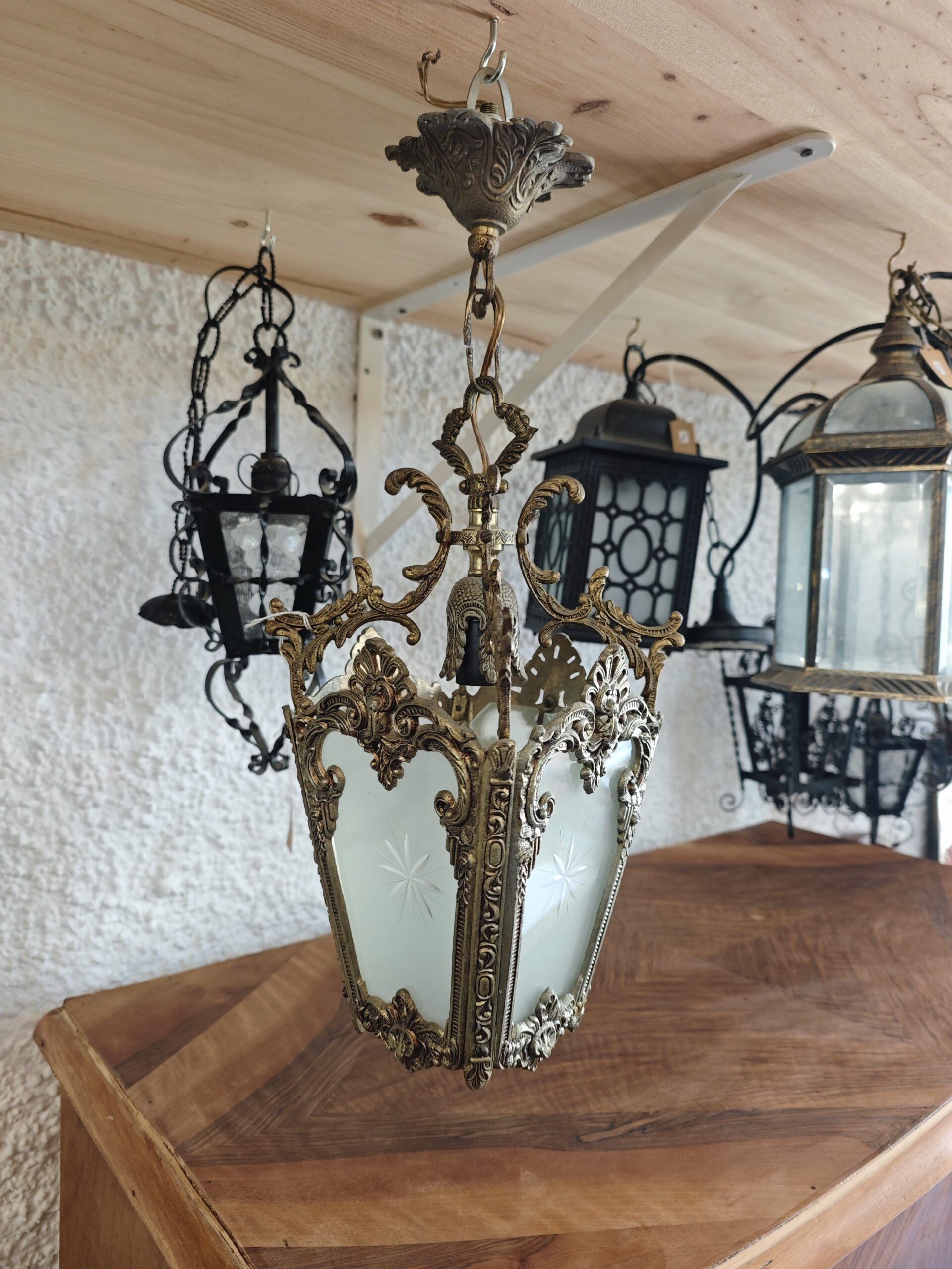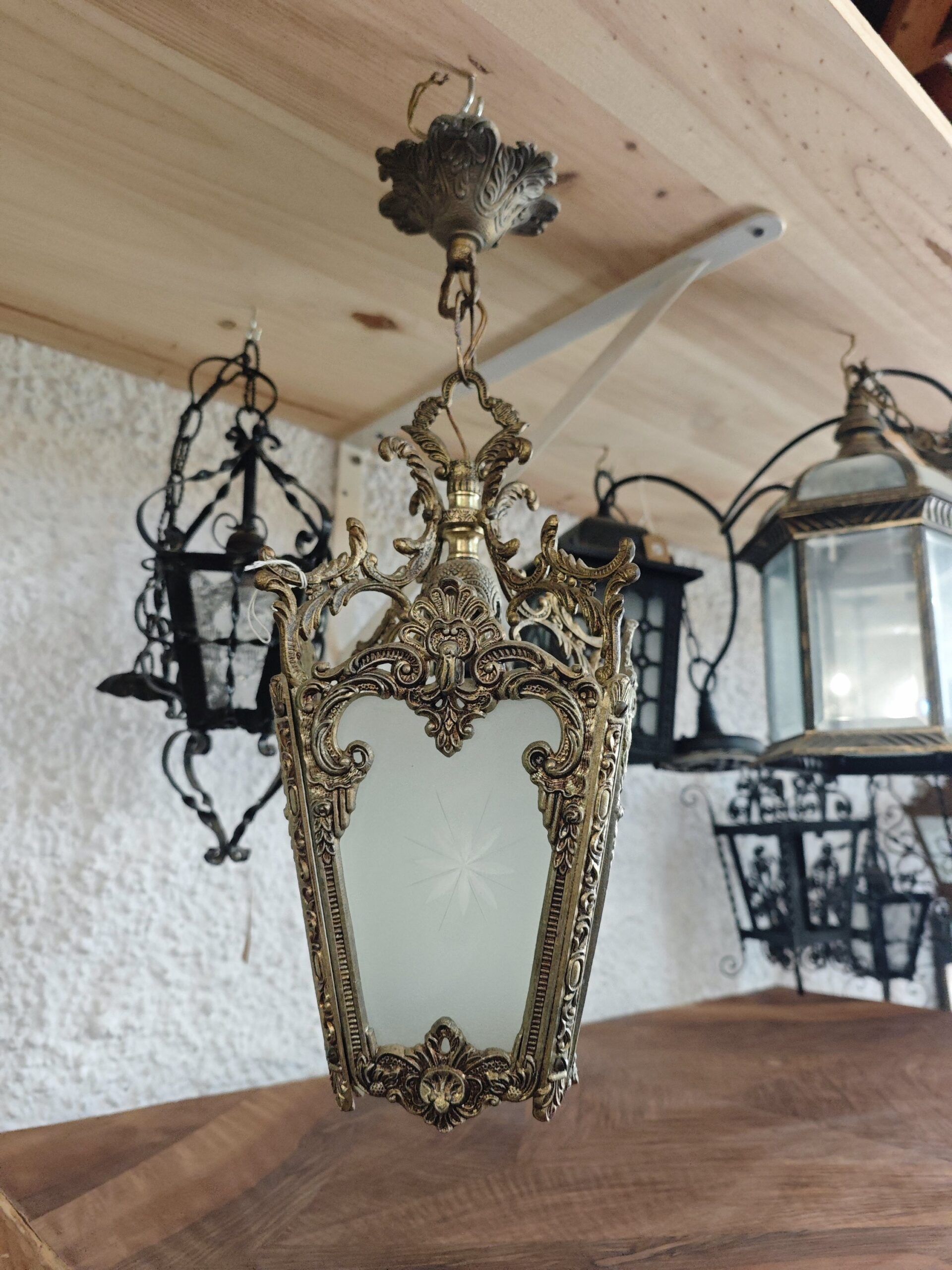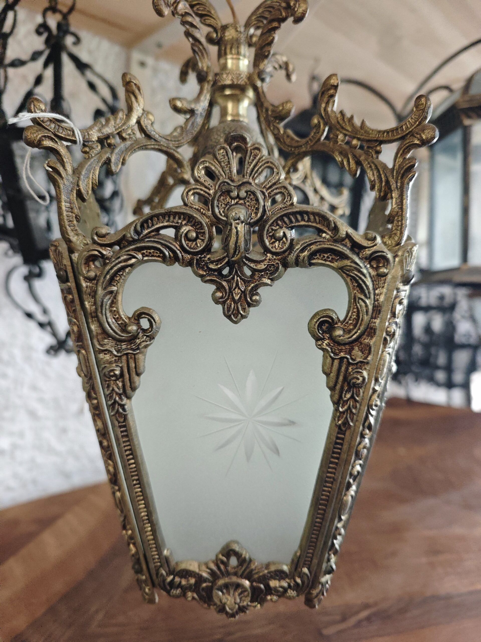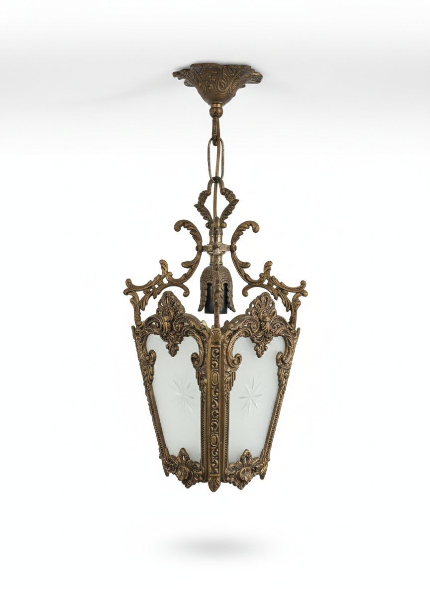 Este farol cuenta con paneles de cristal glaseado (mate) que proporcionan una iluminación difusa y acogedora, evitando deslumbramientos. Cada cristal está decorado con un delicado tallado en forma de estrella, añadiendo un detalle artesanal único. Es la pieza ideal para quienes buscan una lámpara vintage de lujo para decorar porches cubiertos, entradas señoriales o comedores con un toque de elegancia histórica.