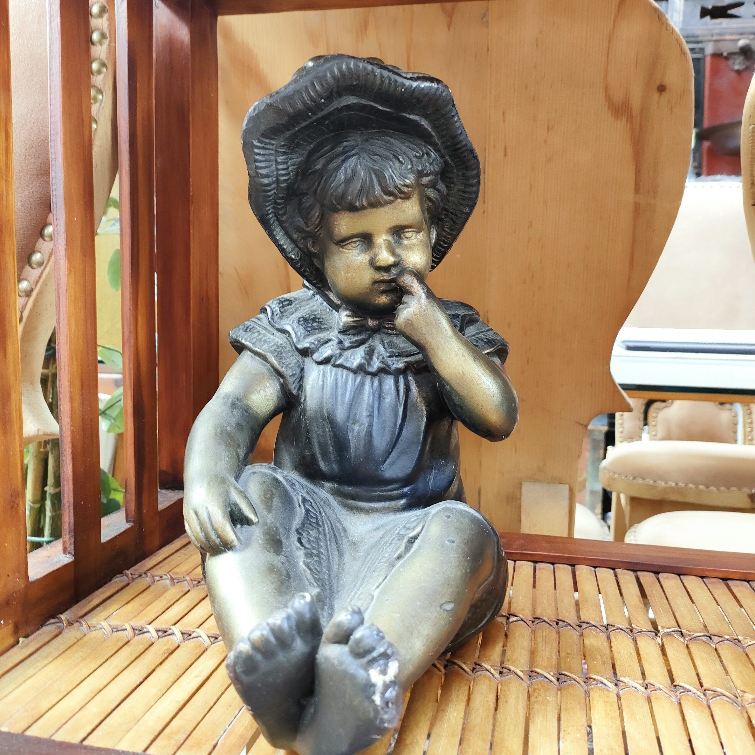 Esta encantadora figura decorativa de cerámica captura la inocencia de una niña con un detallado sombrero de ala ancha y vestimenta clásica. La pieza destaca por su delicado modelado, mostrando una pose tierna que evoca la nostalgia de las esculturas de época.