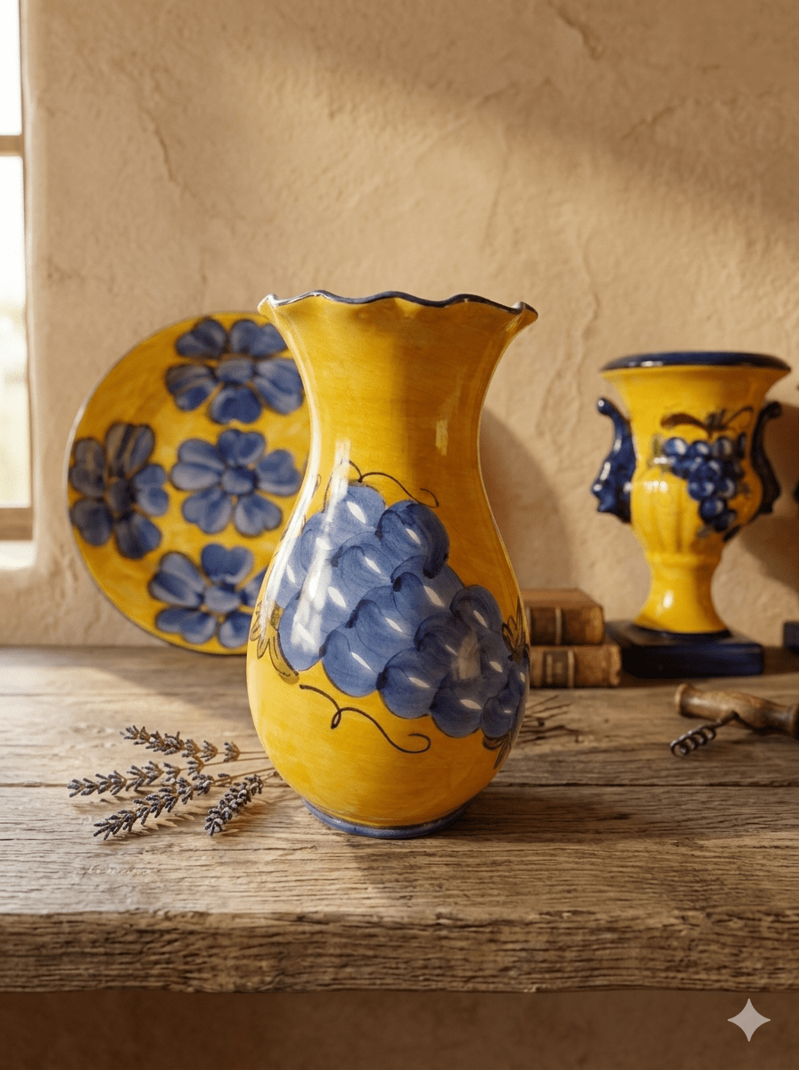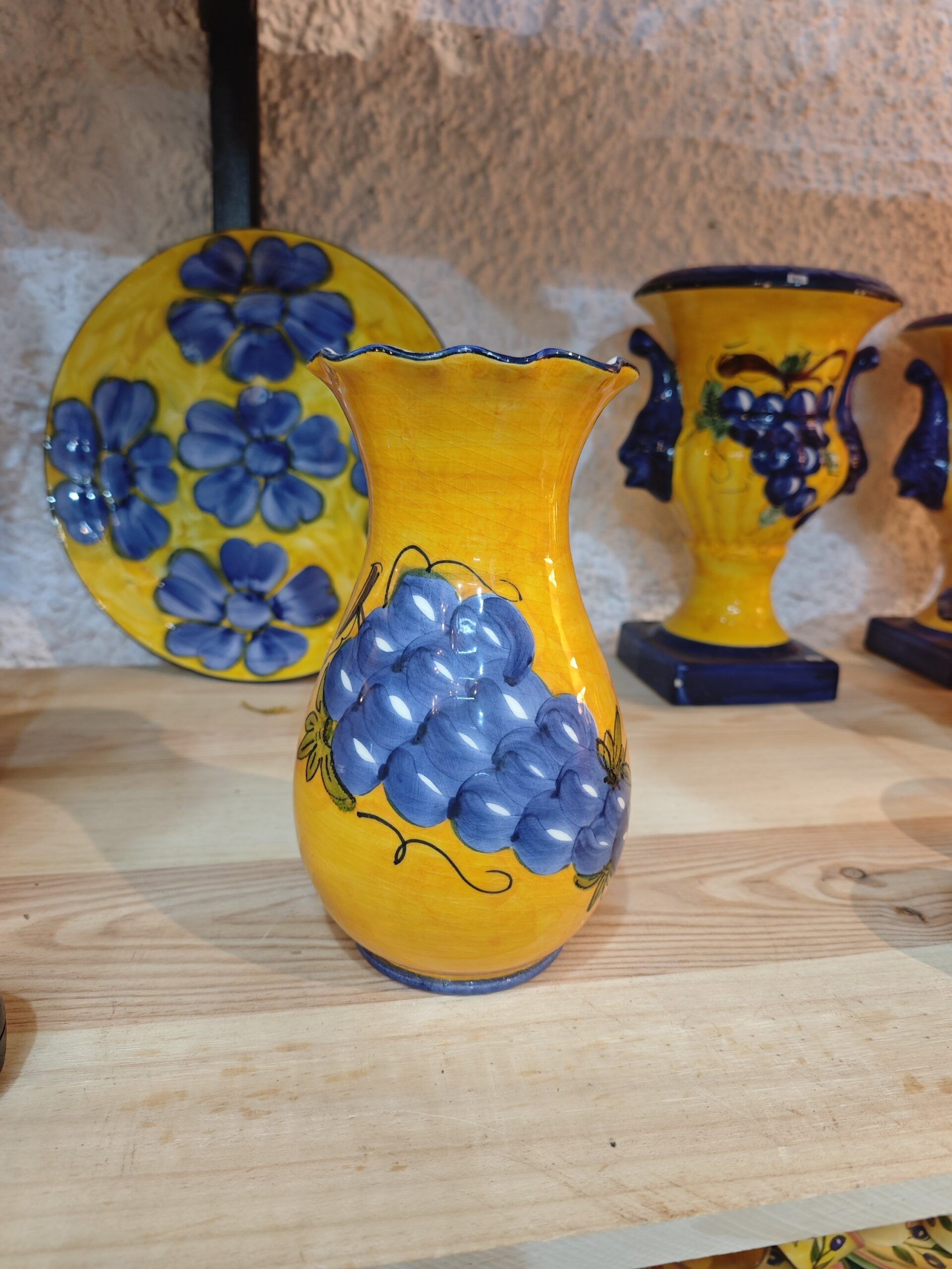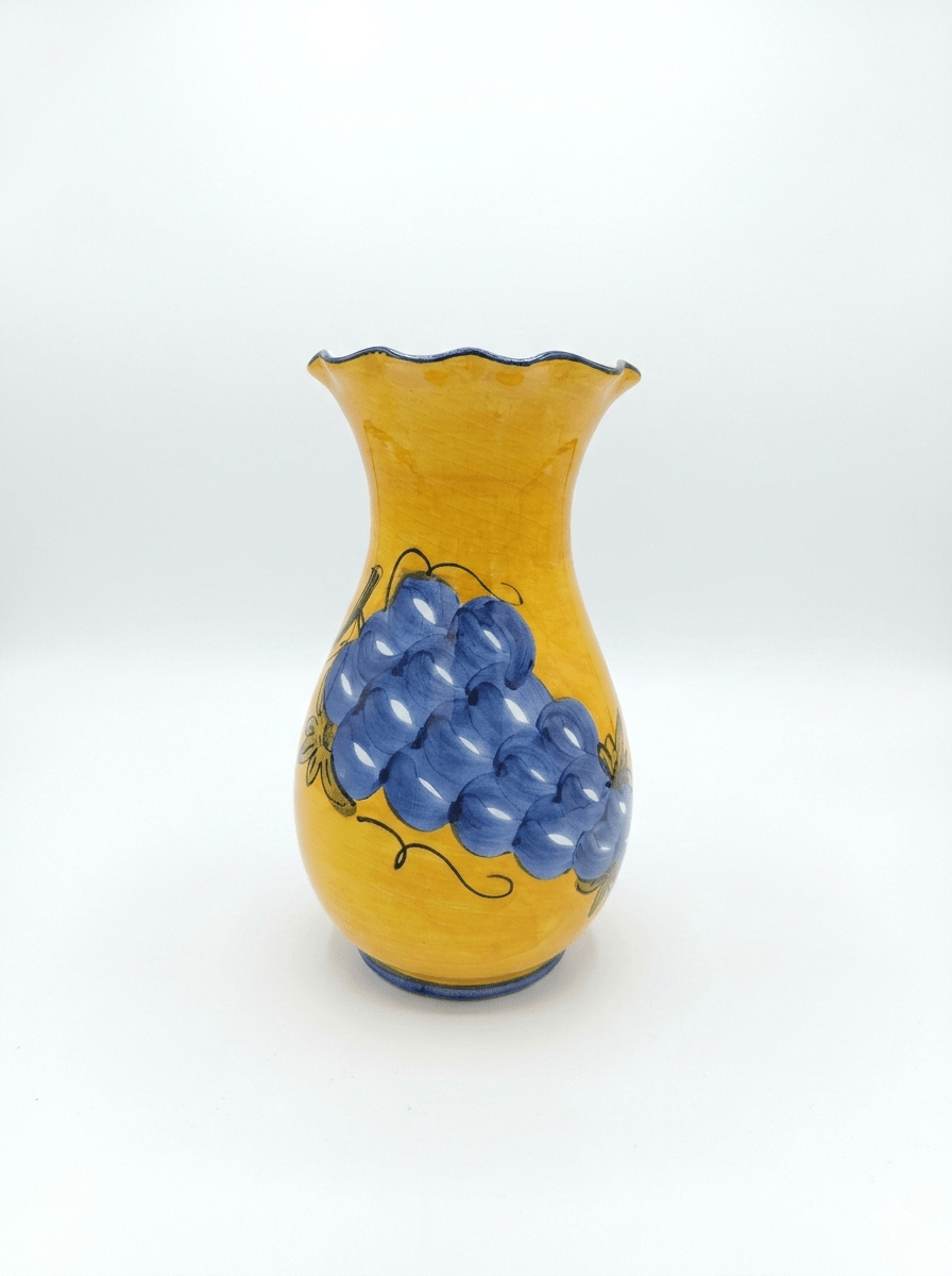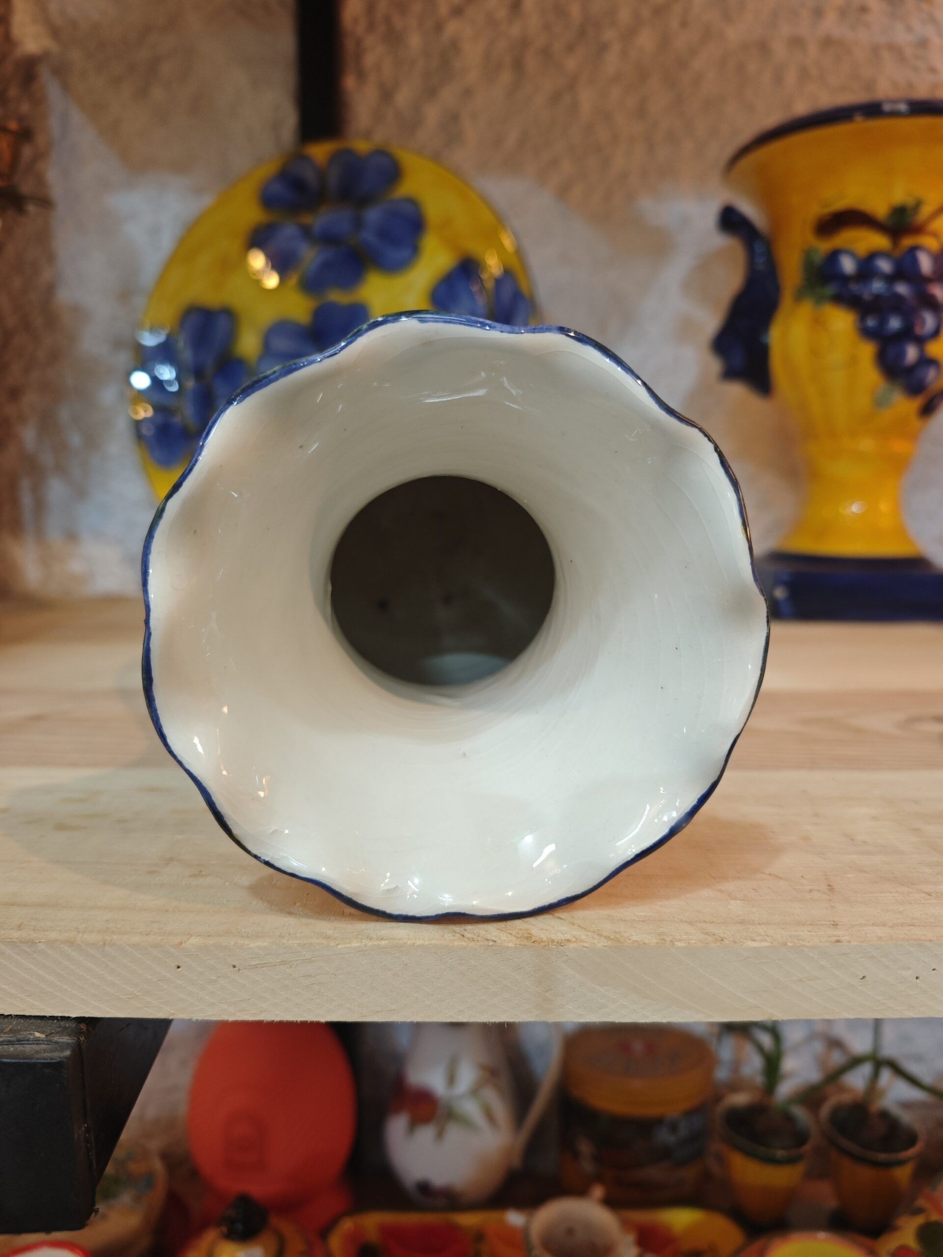 Este elegante florero de cerámica destaca por su vibrante color amarillo y su detallado diseño de un racimo de uvas azules, realizado con técnicas artesanales. Su boca ondulada con borde azul realza su silueta clásica, convirtiéndolo en una pieza decorativa ideal para cualquier estancia. La calidad del vidriado y la intensidad de sus pigmentos reflejan una tradición cerámica de alta calidad, perfecta para lucir flores frescas o como objeto decorativo por sí mismo en estanterías, mesas o aparadores.
