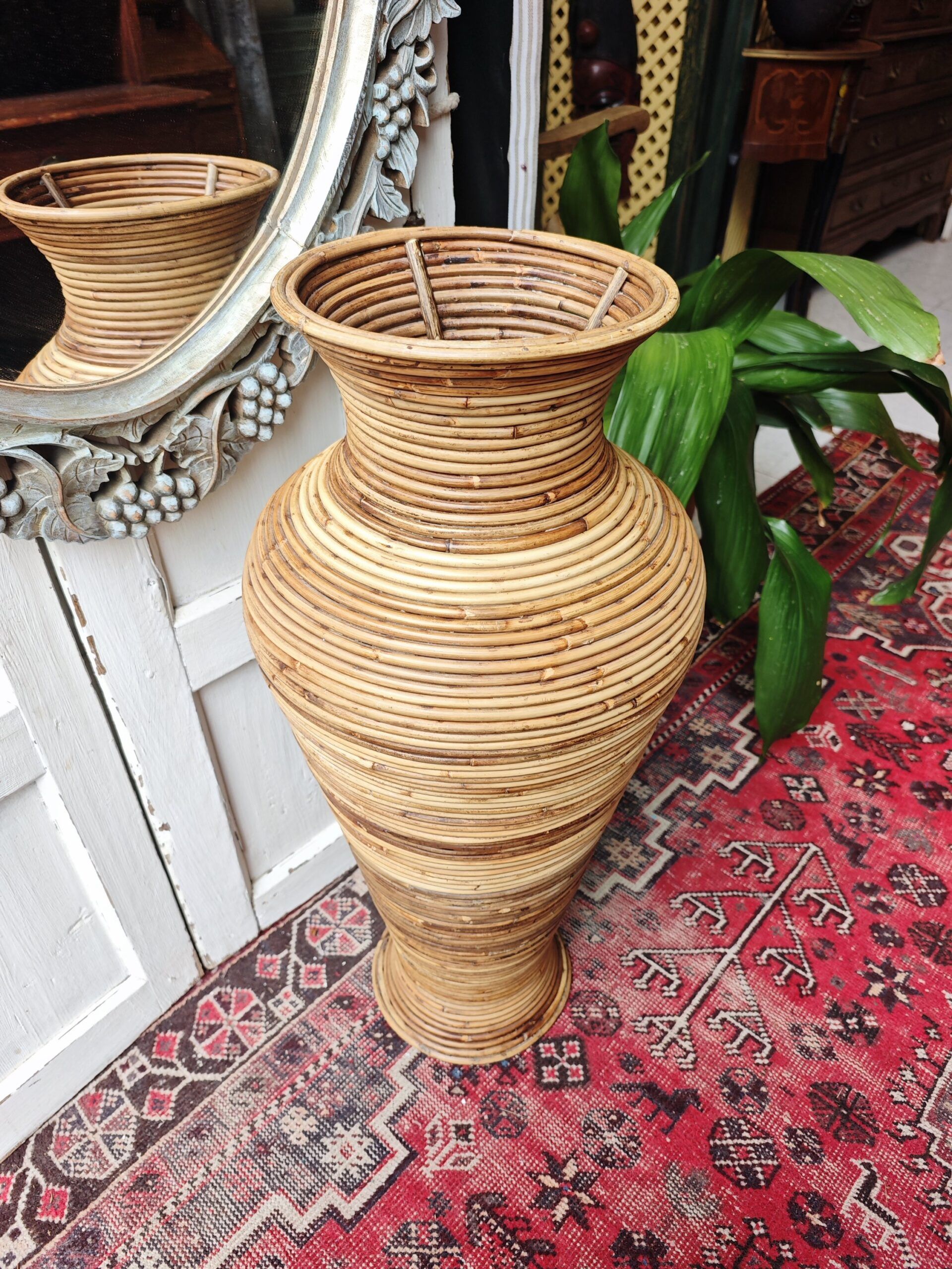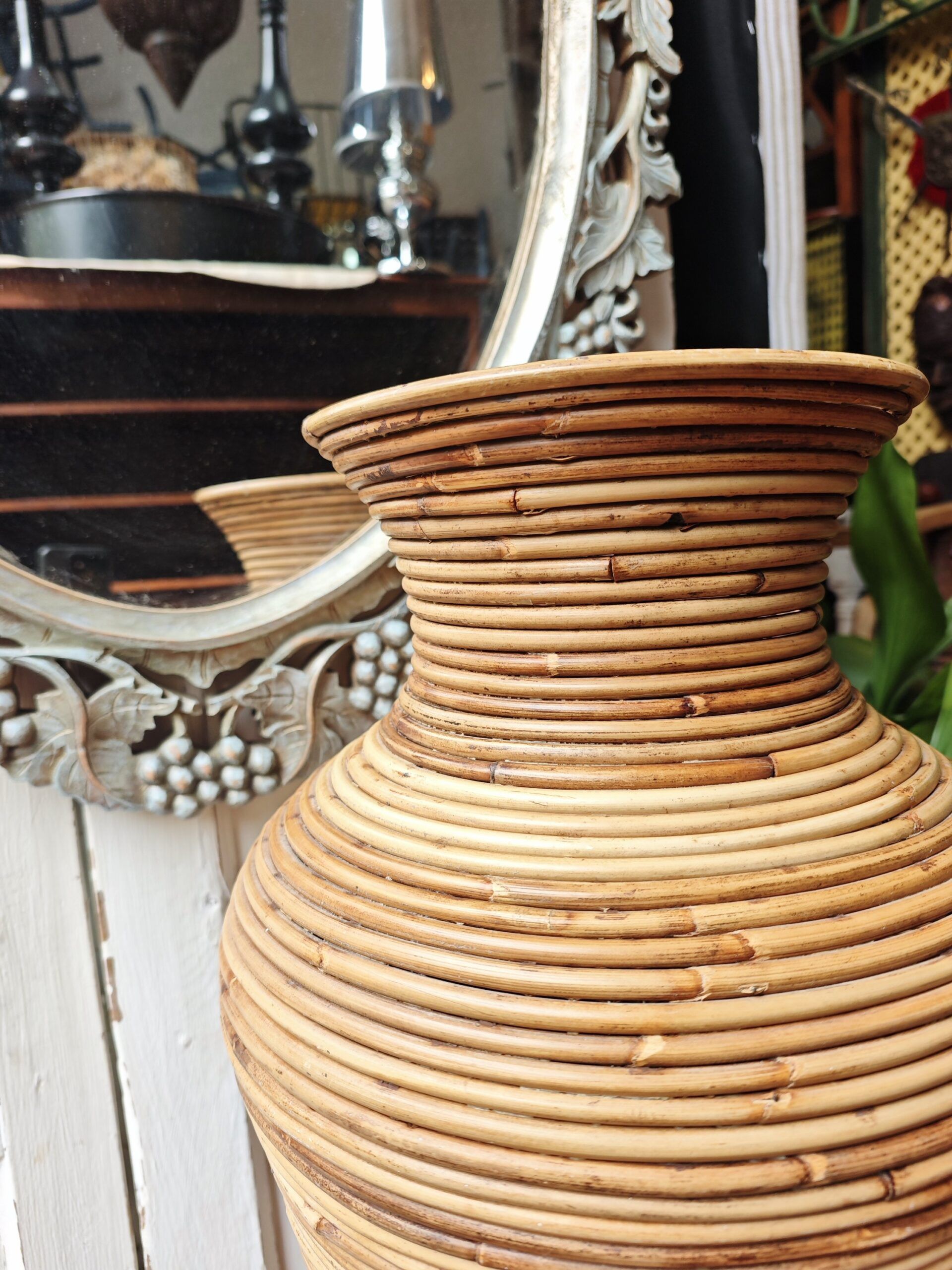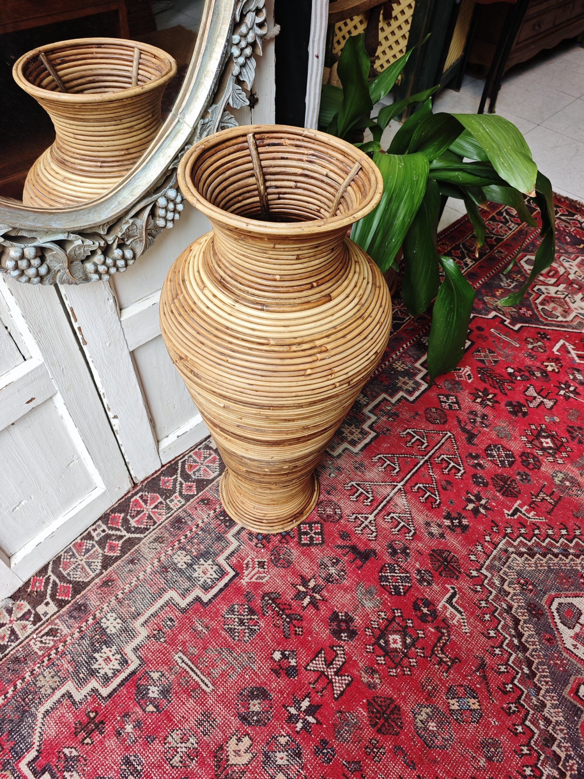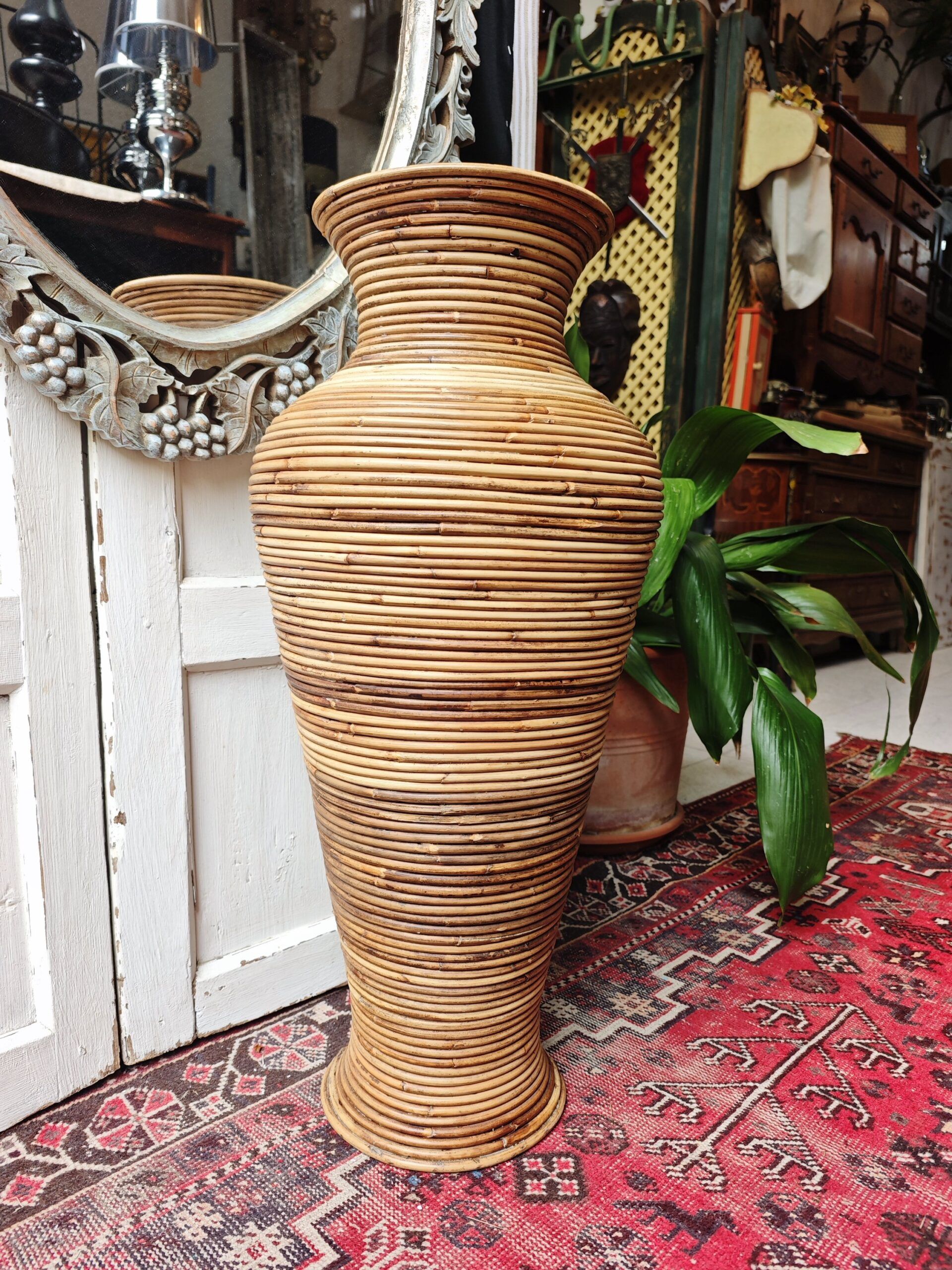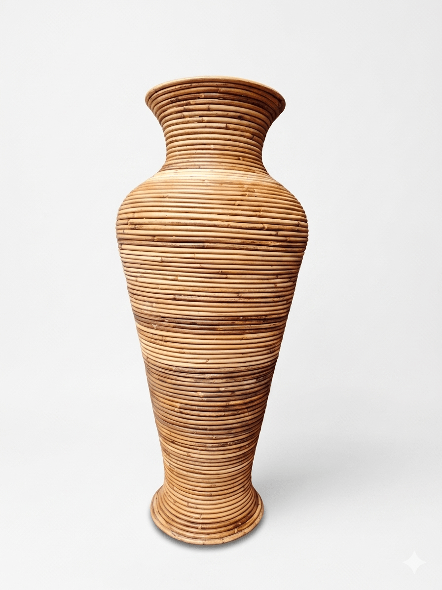 Esta imponente pieza de 77 cm de altura es un ejemplo magistral del diseño Hollywood Regency con tintes orgánicos que dominó la escena europea en la década de los 70. Siguiendo la estética de la legendaria diseñadora milanesa Gabriella Crespi, este jarrón destaca por su técnica de «split reed» (caña partida o tallada en lápiz), donde finas varas de médula de rattan se enrollan de forma continua para crear una superficie estriada y táctil de gran sofisticación.
