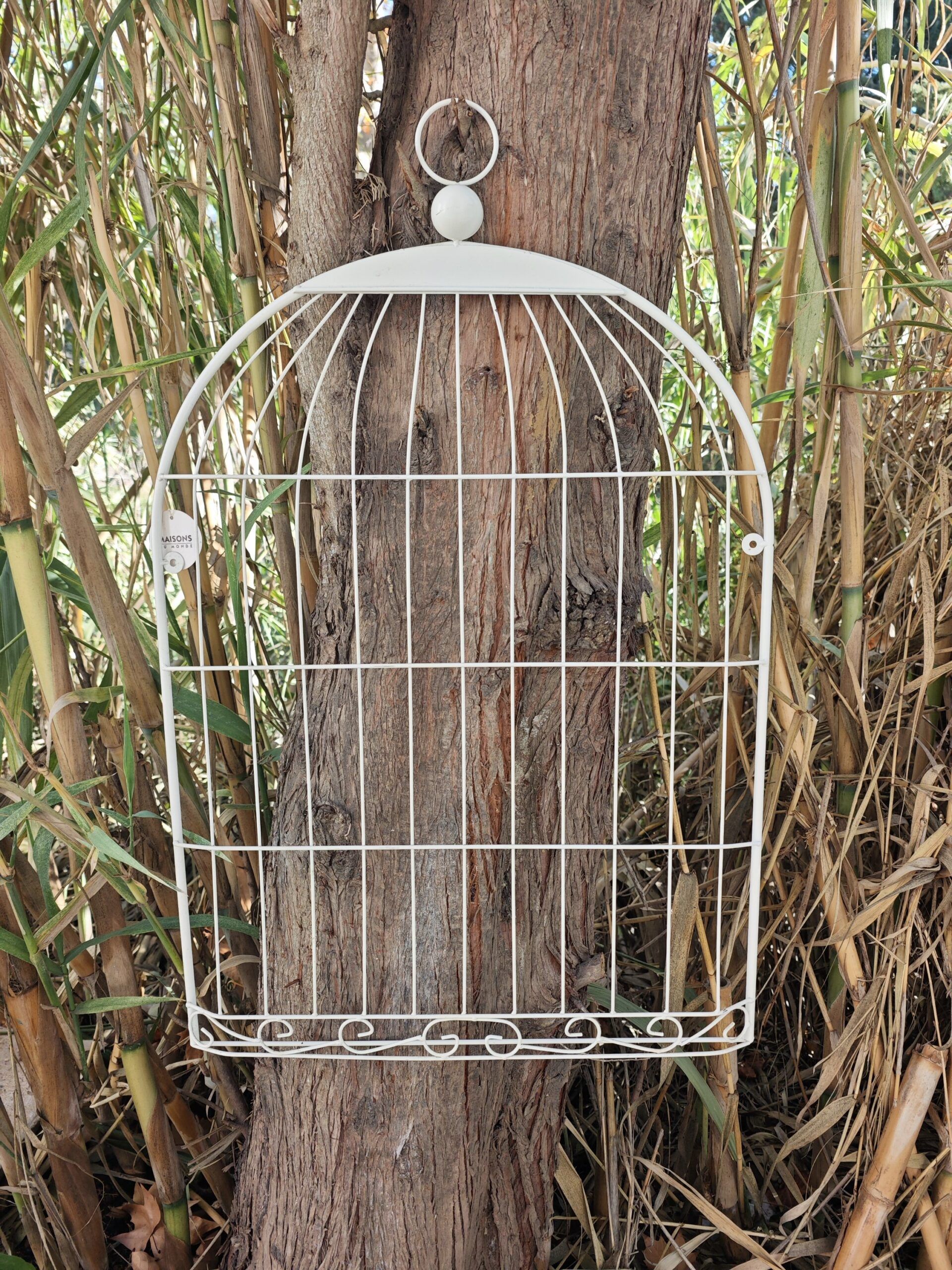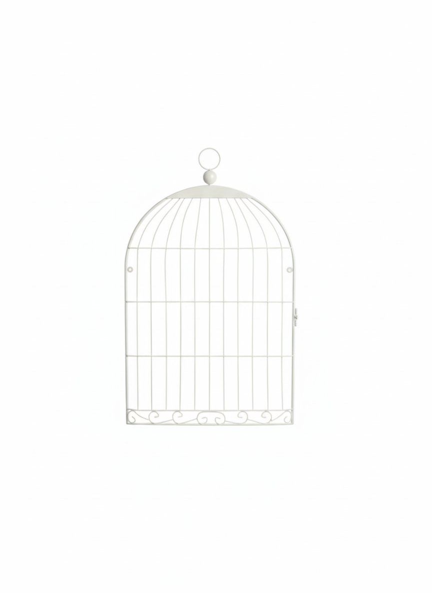 Añada un toque de encanto romántico a su hogar o jardín con esta Jaula Decorativa de Pared. Diseñada específicamente para ser colgada en la pared gracias a su parte posterior plana, esta pieza de gran tamaño destaca por su elegante arco superior, una anilla de sujeción robusta y un delicado trabajo de filigrana y volutas en la base. Su acabado en blanco puro la convierte en un elemento versátil para estilos de decoración Shabby Chic, Provenzal o rústico moderno.