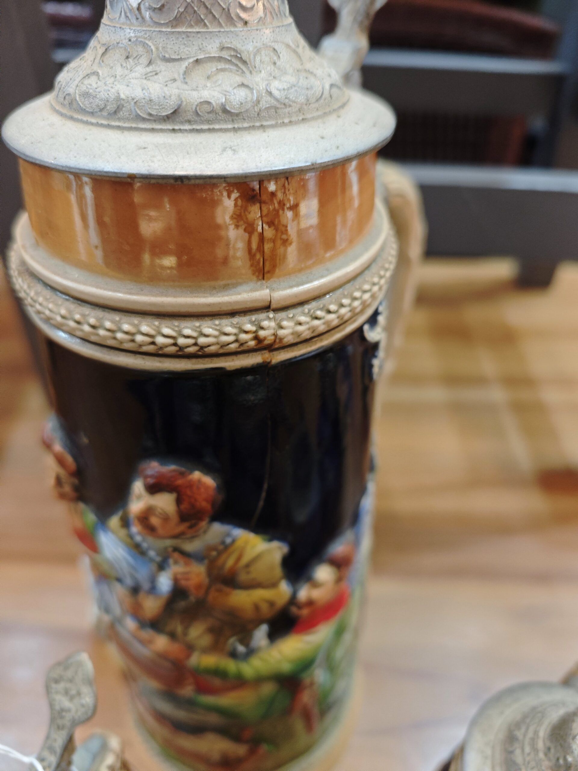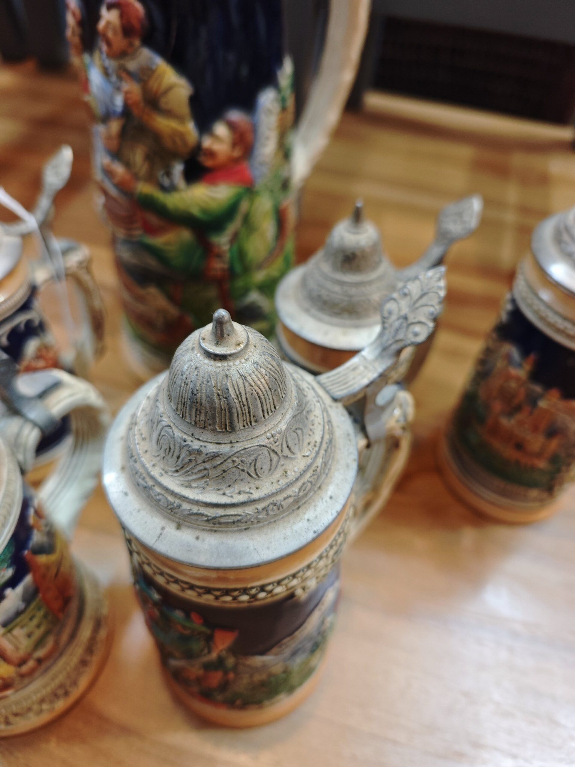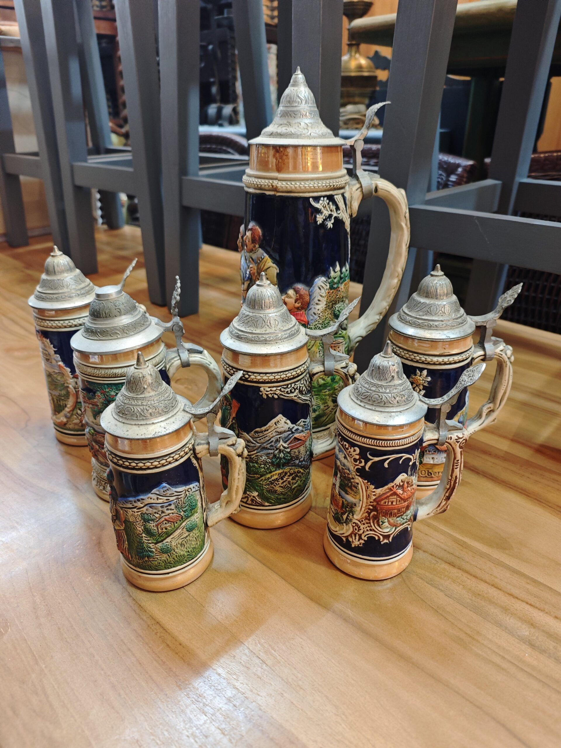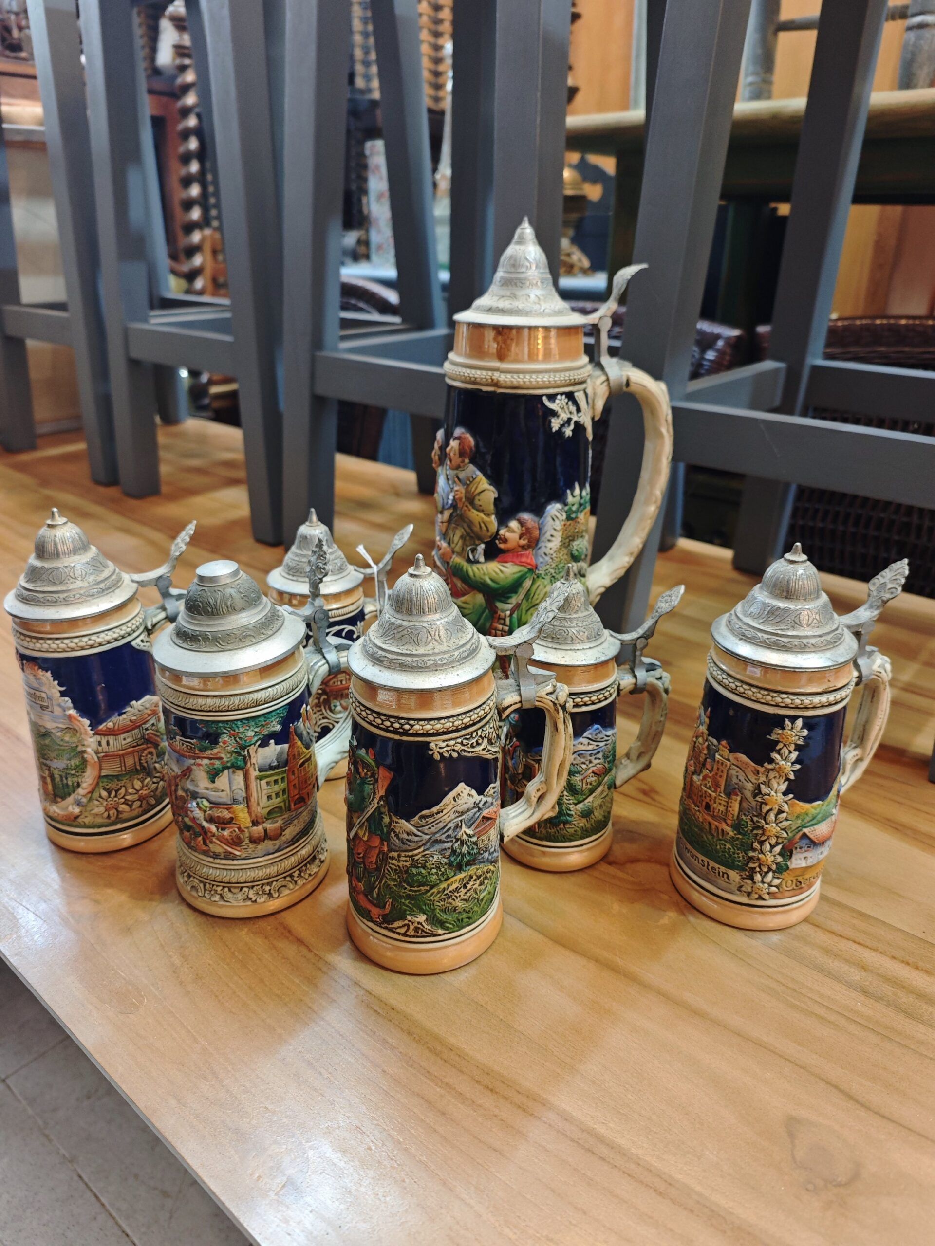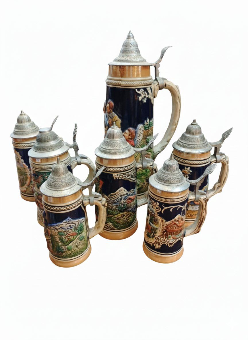 Set de 7 piezas de jarras de cerveza tradicionales con relieve y tapas metálicas.