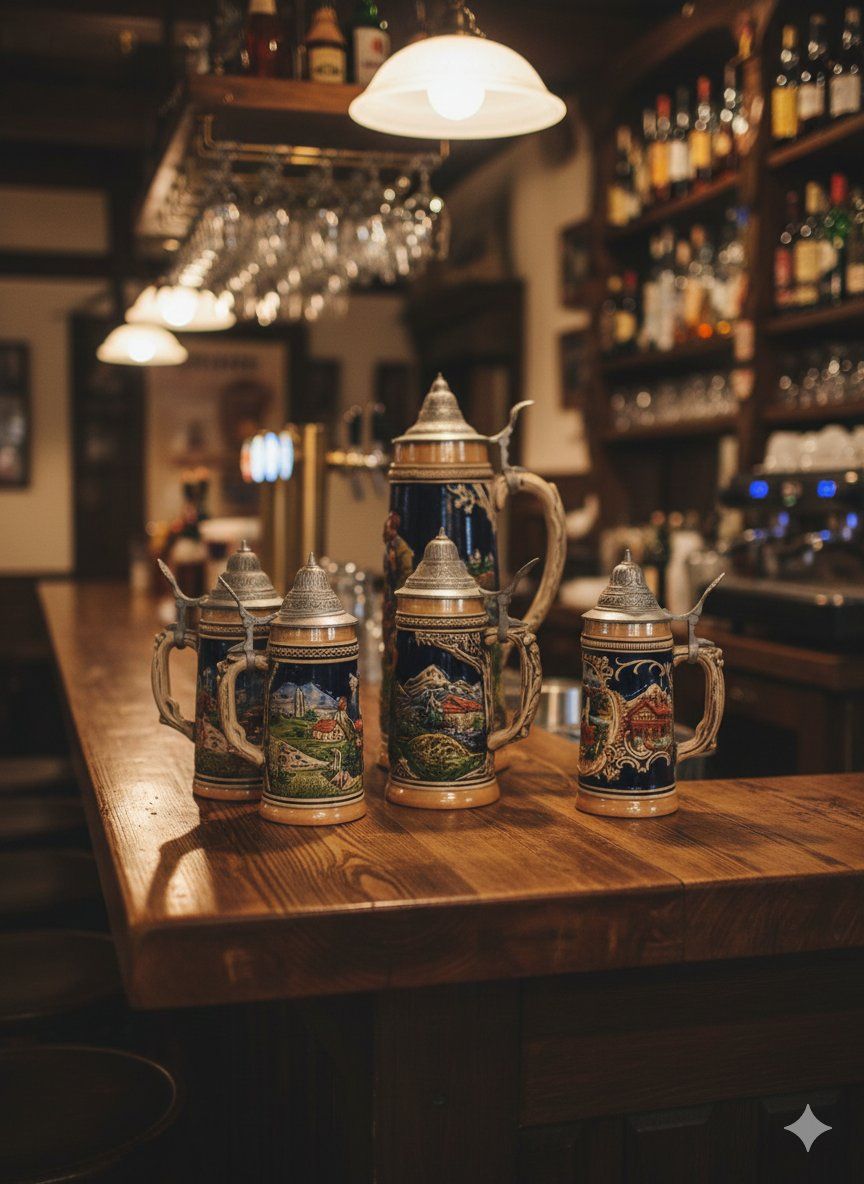 Añada un toque de tradición bávara a su colección con este espectacular juego de 7 jarras de cerveza alemanas vintage. Este set artesanal destaca por su cerámica policromada de alta calidad con intrincados acabados en relieve que representan escenas clásicas de los Alpes, paisajes rurales y motivos folclóricos tradicionales.