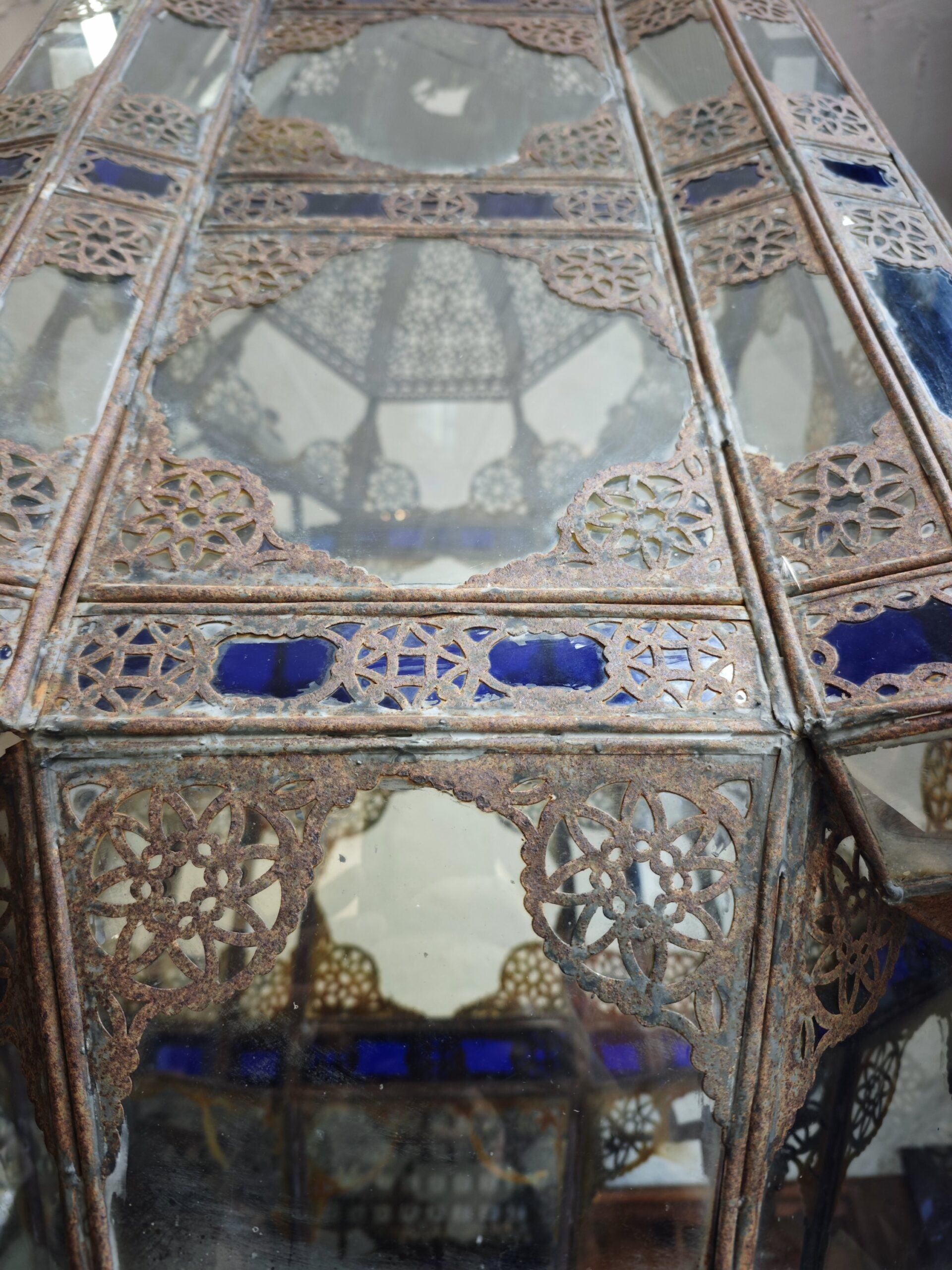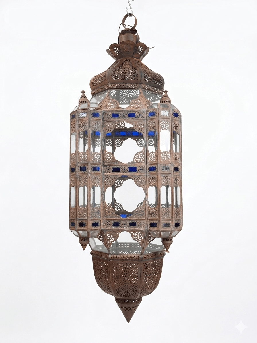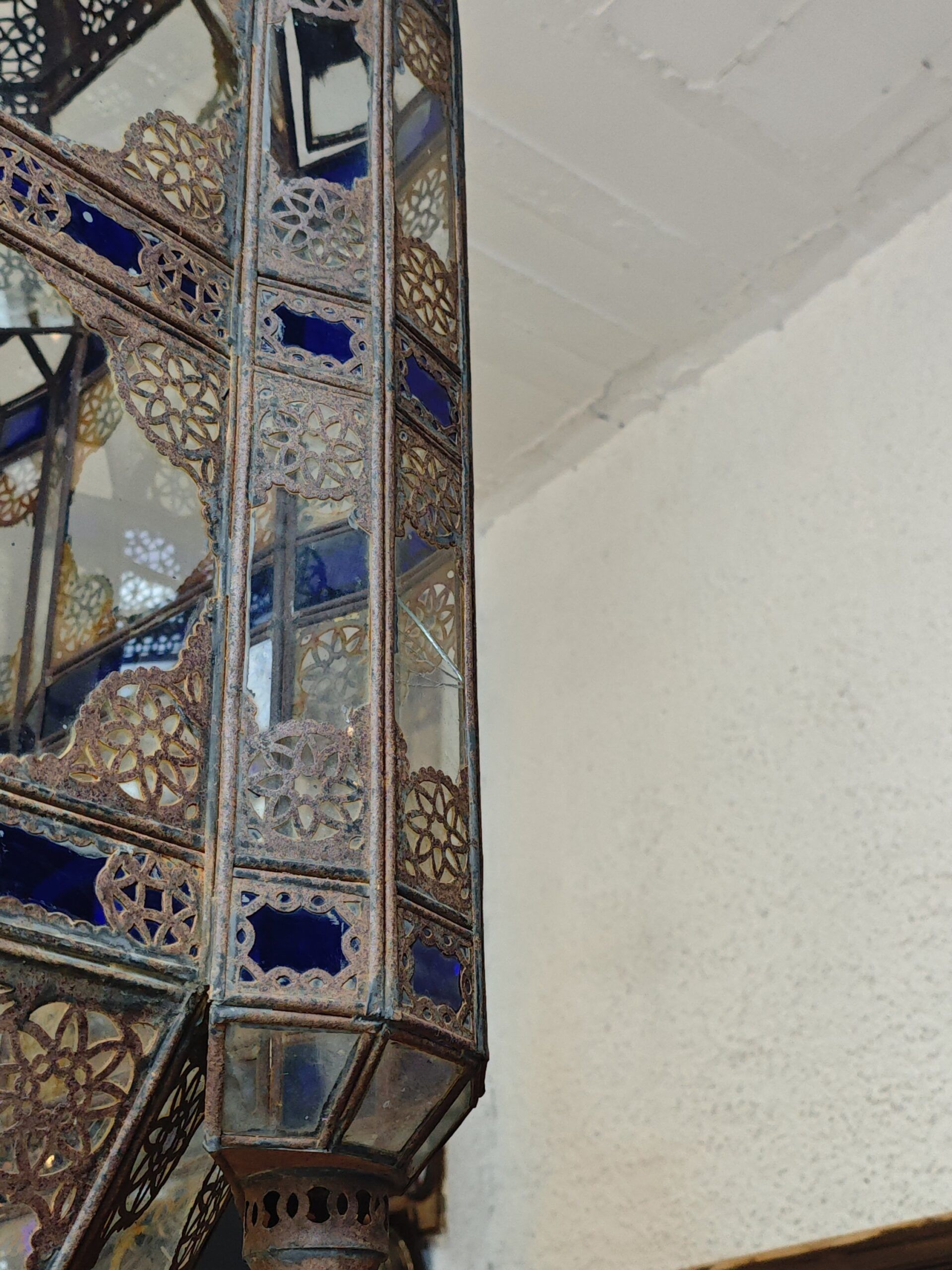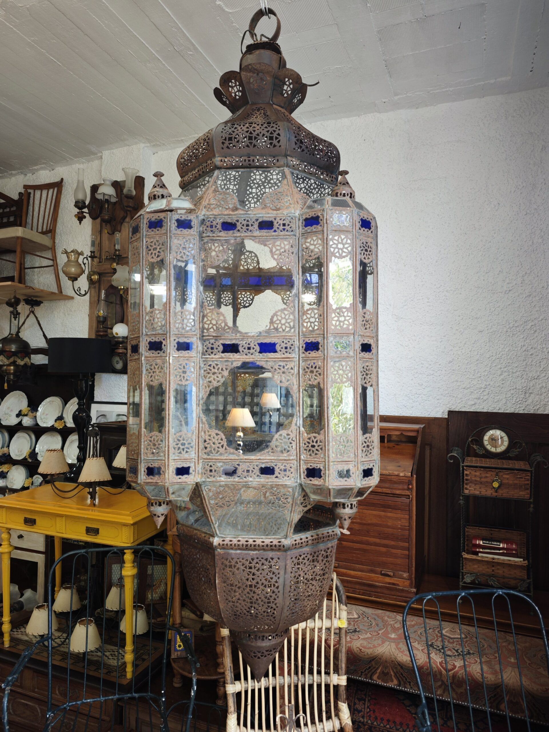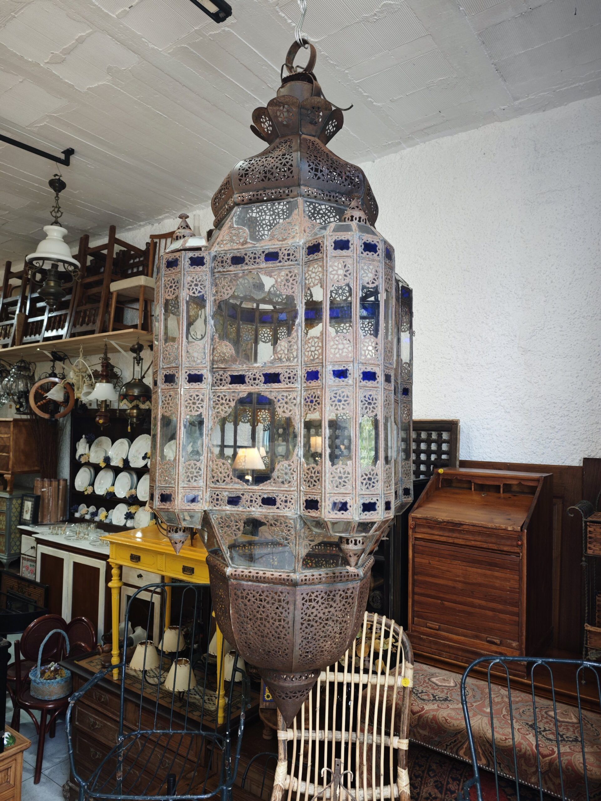 Lámpara Árabe Gigante de Metal Calado y Cristal Azul