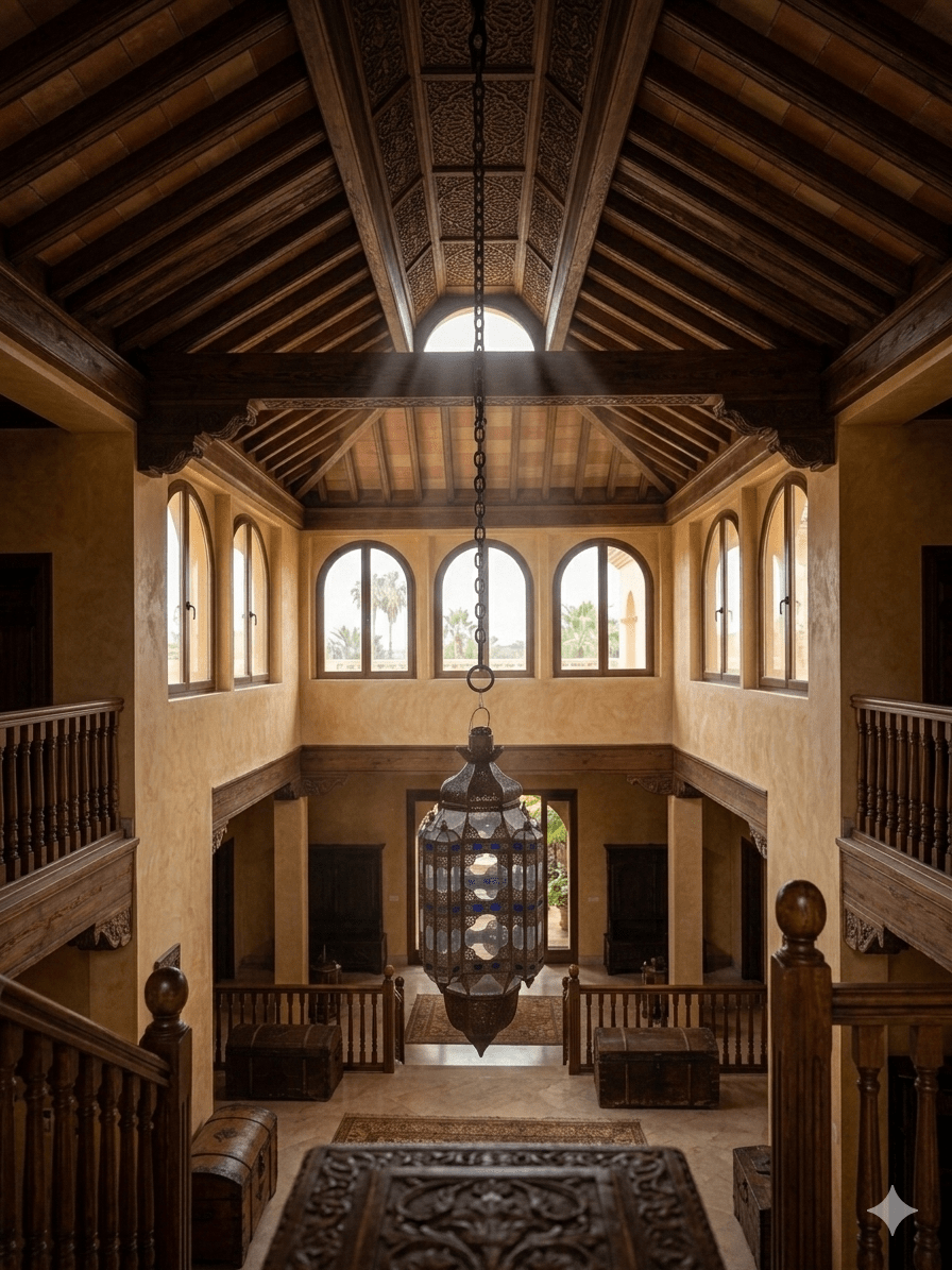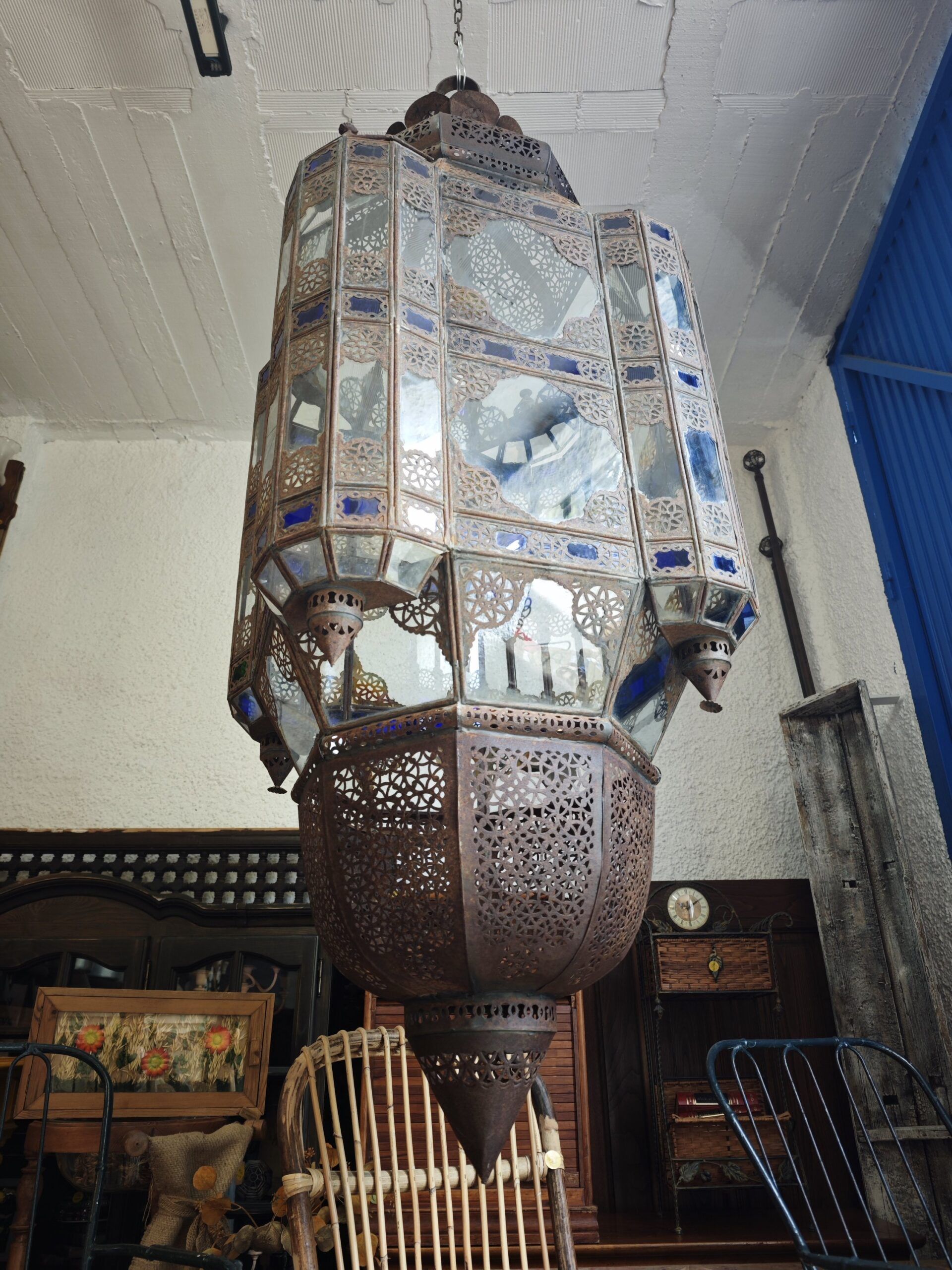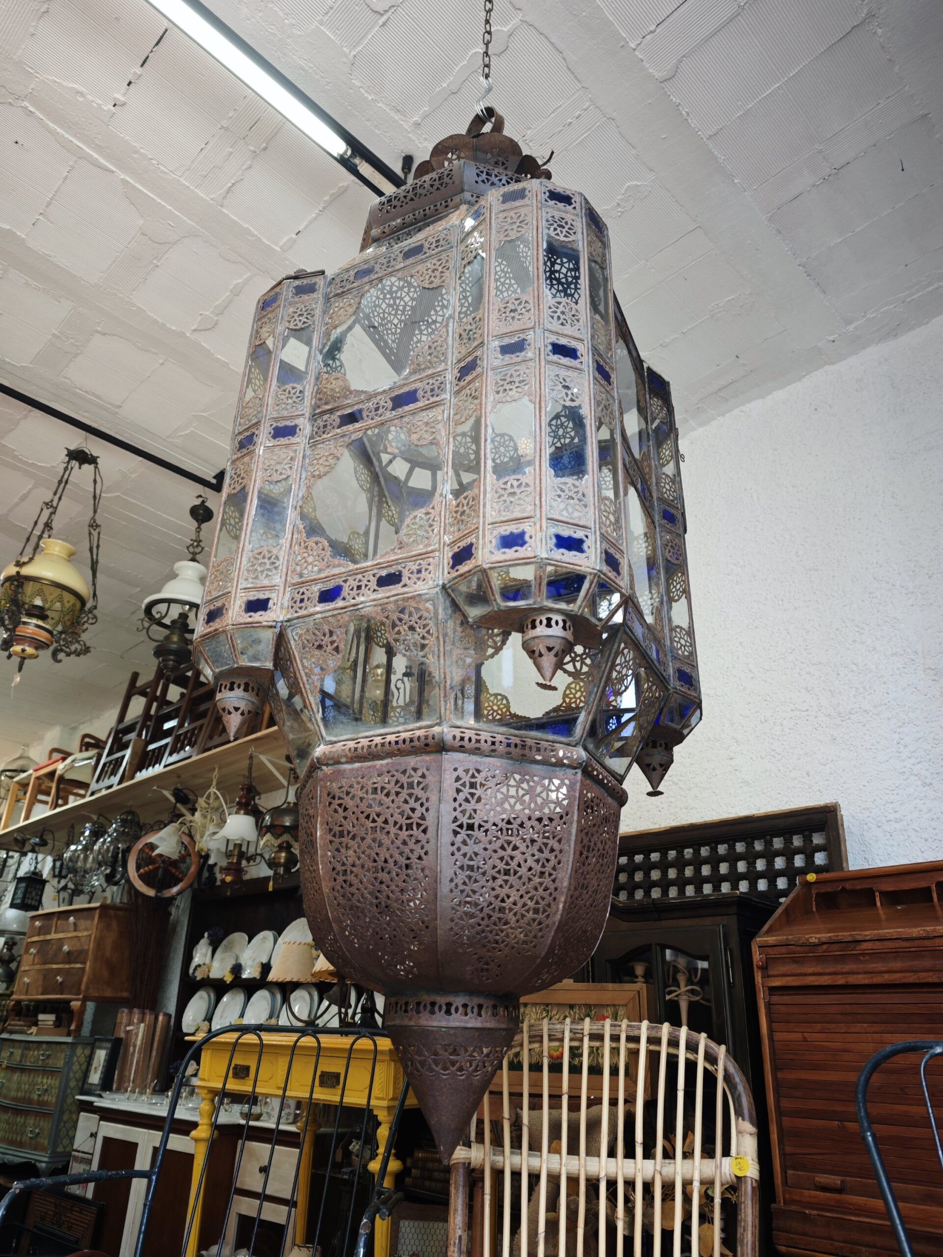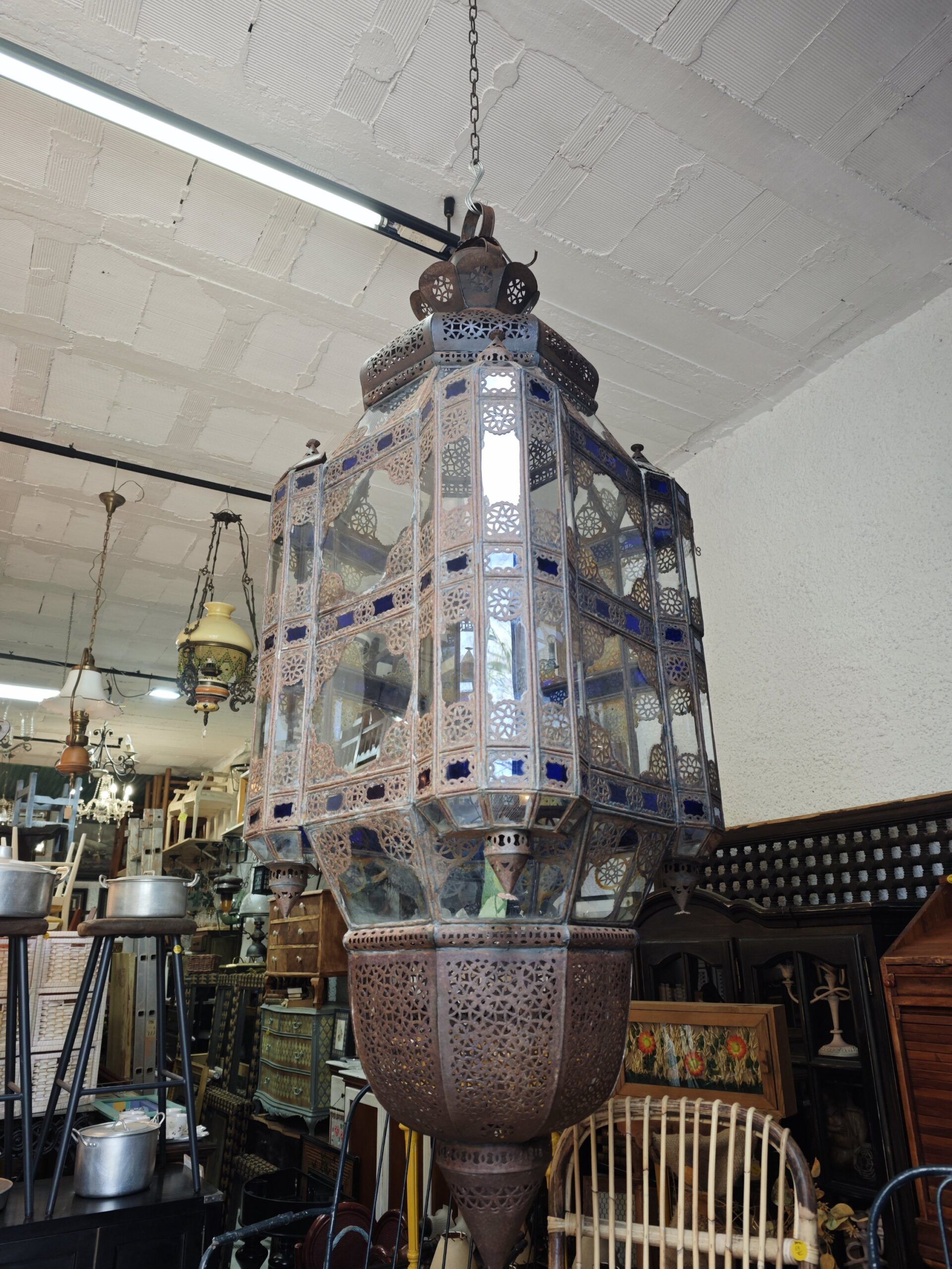 Esta impresionante lámpara de techo de estilo árabe, fabricada en los años 70, destaca por su escala monumental y su exquisito trabajo artesanal. La estructura está realizada en metal con una pátina envejecida natural que realza su carácter vintage. Presenta un diseño geométrico complejo con paneles de cristal transparente y detalles en cristal azul cobalto que crean un contraste visual fascinante. El cuerpo central está profusamente decorado con calados hechos a mano (filigrana), diseñados para proyectar sombras intrincadas y una iluminación cálida y ambiental. Su forma hexagonal se remata con una cúpula superior labrada y una base cónica inferior, lo que la convierte en una pieza arquitectónica ideal para techos altos, entradas o proyectos de interiorismo que busquen un punto focal de gran impacto visual y elegancia exótica.