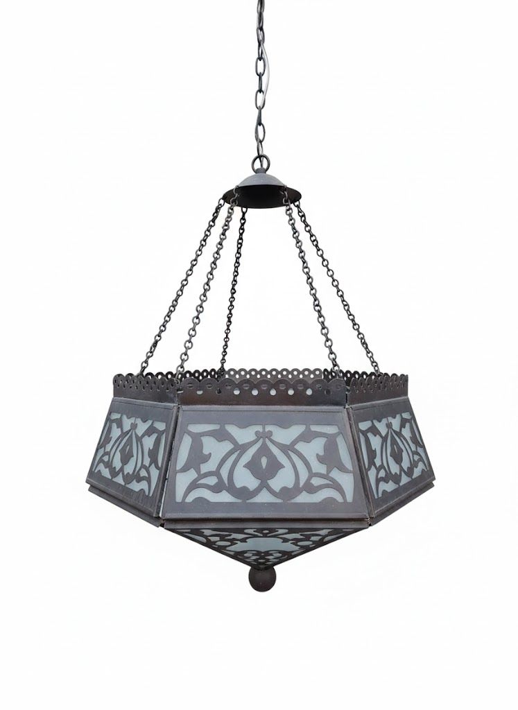 Esta lámpara colgante marroquí es una pieza decorativa de gran impacto visual, elaborada con estructura metálica calada y paneles de cristal esmerilado. Su diseño hexagonal y suspendido por cadenas aporta elegancia y carácter artesanal, evocando la estética tradicional de los zocos y patios del Magreb. Los motivos florales y geométricos troquelados en el metal permiten que la luz se filtre suavemente, creando sombras envolventes y un ambiente cálido y exótico.