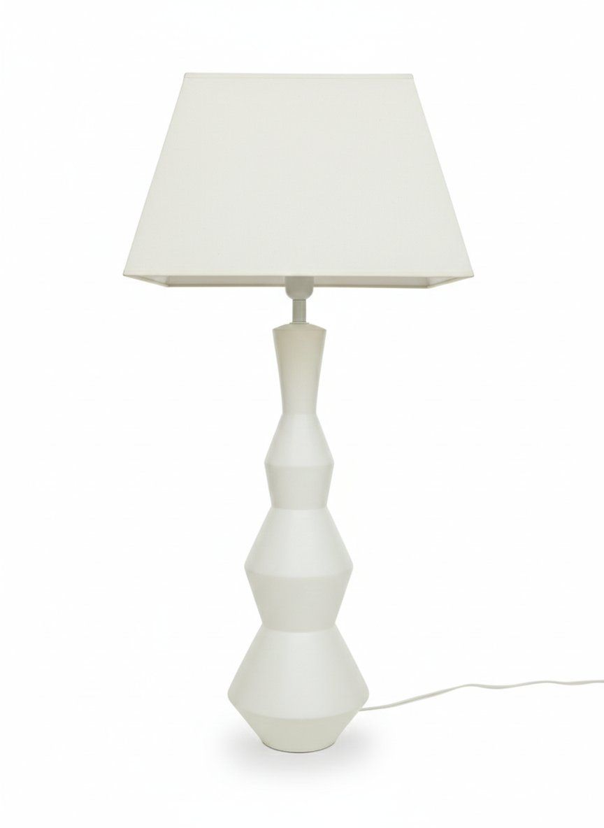 Lámpara de mesa blanca con base geométrica facetada y pantalla cuadrada. Diseño moderno y decorativo.