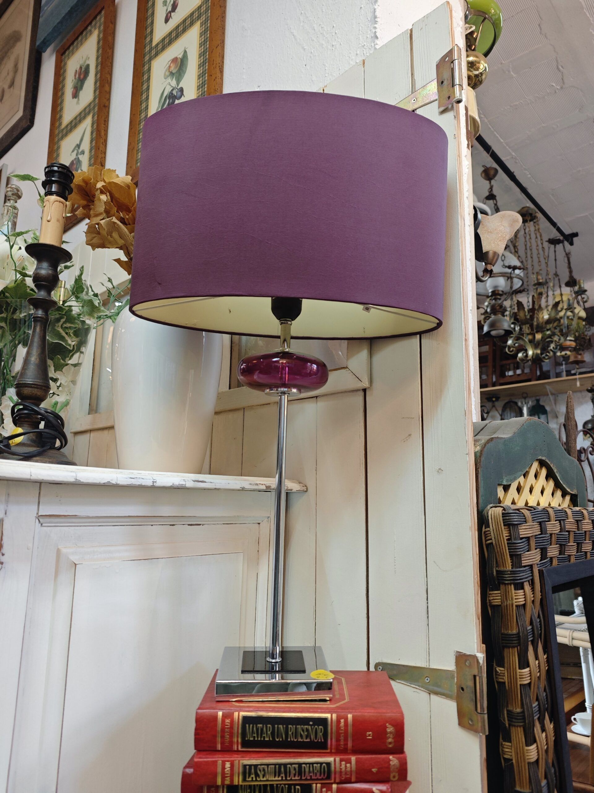 La lámpara se completa con una amplia pantalla cilíndrica de tela en color púrpura intenso, diseñada para difundir una luz cálida y acogedora, ideal para crear ambiente en salones, dormitorios o despachos elegantes. Su base cuadrada sólida garantiza estabilidad, mientras que su altura la convierte en una pieza con presencia suficiente para destacar sobre aparadores o mesas auxiliares.