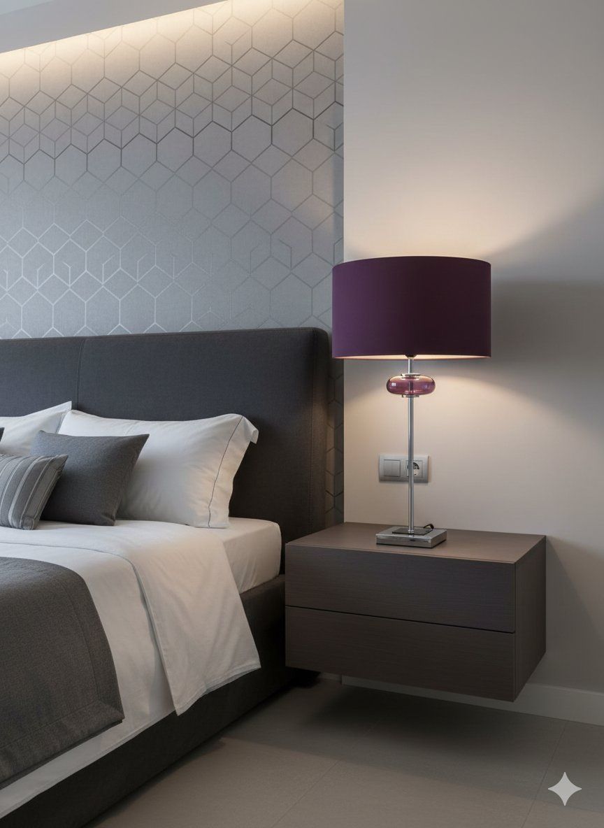 Añada un toque de sofisticación contemporánea a su espacio con esta elegante lámpara de mesa de metal. Con un diseño estilizado y minimalista, esta pieza presenta una estructura de acabado cromado de alta calidad que aporta brillo y modernidad. El detalle distintivo es una pieza decorativa de vidrio en color amatista situada justo debajo de la pantalla, que crea un juego de luz y color excepcional.