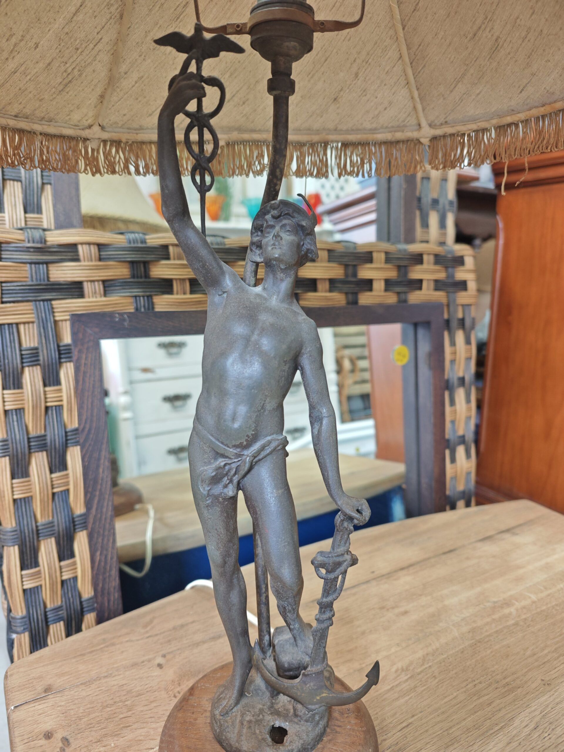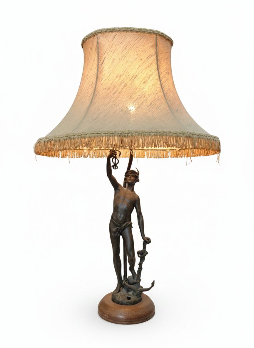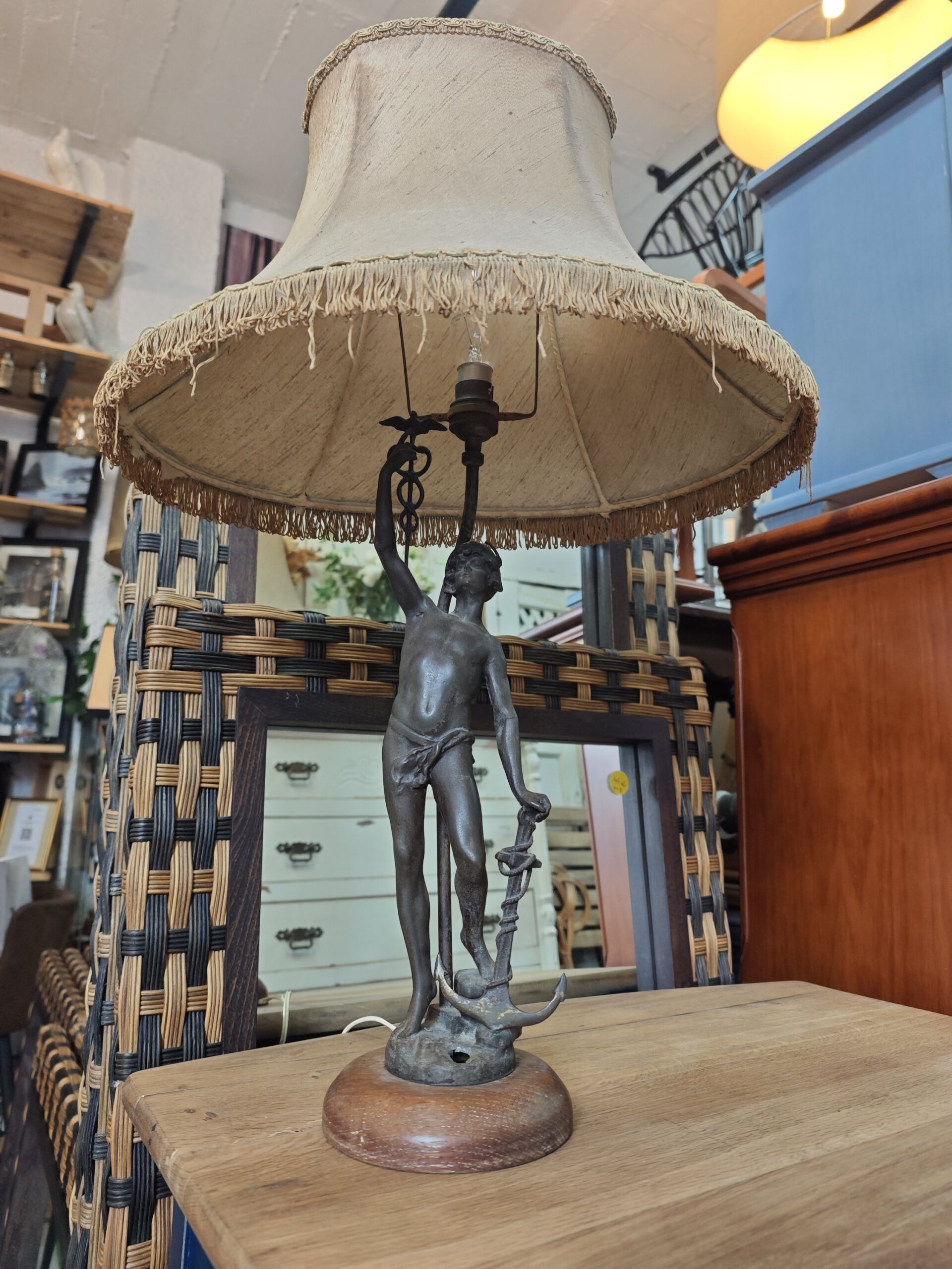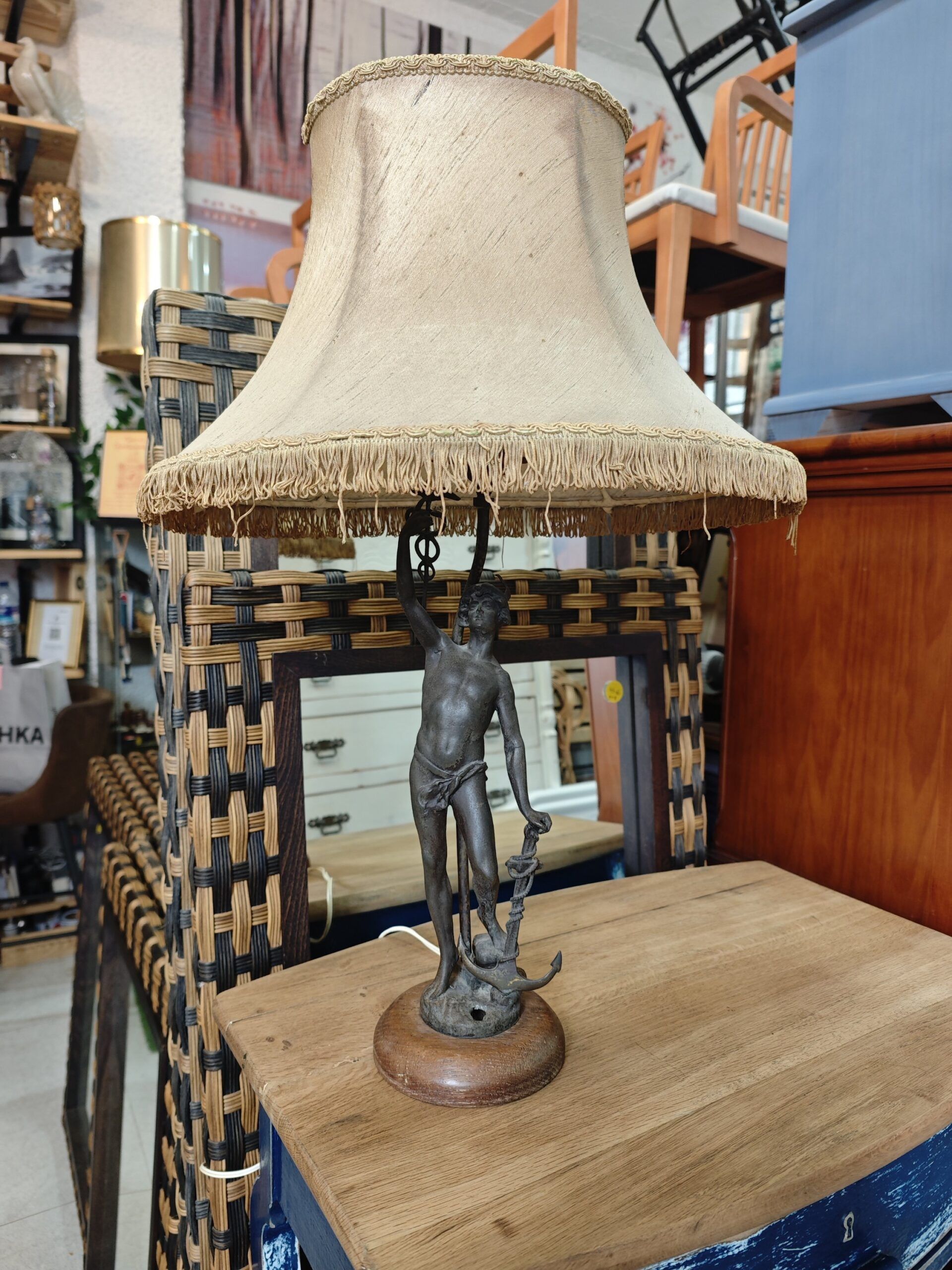 Lampara de mesa vintage con base de escultura metálica y pantalla textil.