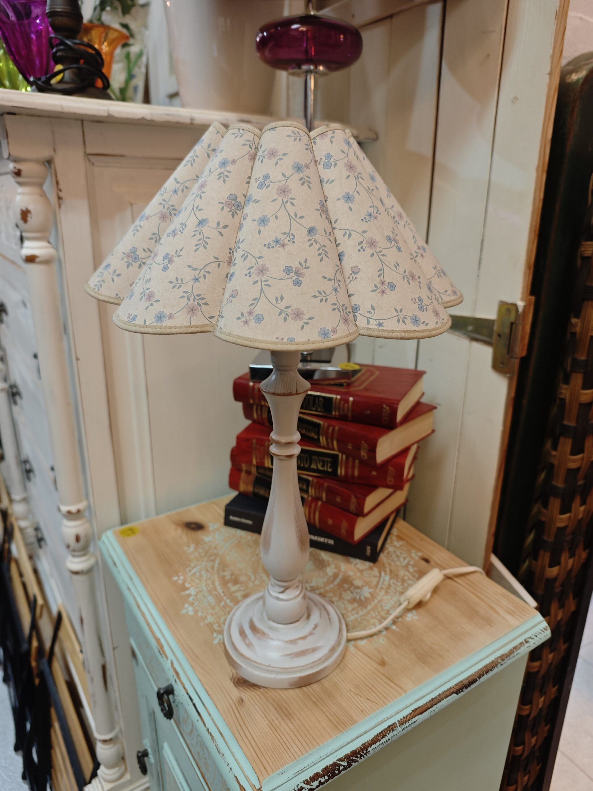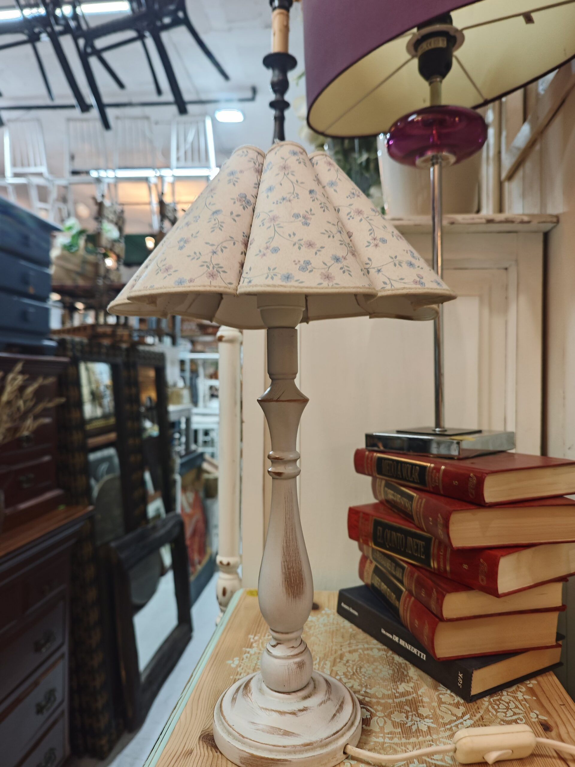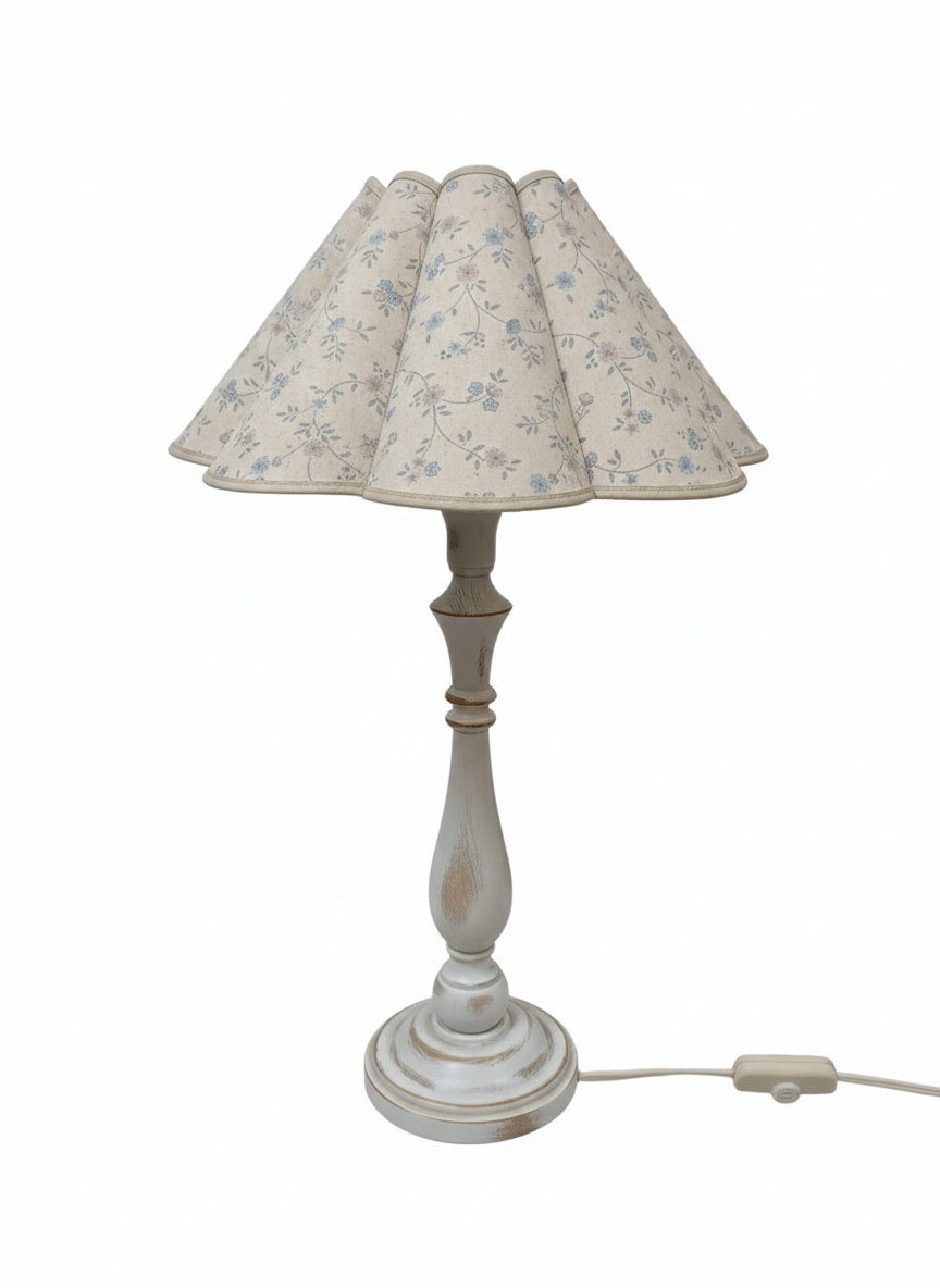 Esta encantadora lámpara de mesa de estilo vintage es el complemento perfecto para ambientes románticos y acogedores. Cuenta con un pie torneado de madera en color blanco envejecido que aporta un toque rústico y elegante. Su elemento más distintivo es la tulipa plisada de tela, decorada con un delicado estampado de pequeñas flores silvestres en tonos pastel que filtran la luz de manera suave y cálida. Gracias a su diseño atemporal y su acabado artesanal, es ideal para iluminar mesitas de noche, escritorios o rincones de lectura, integrándose perfectamente en decoraciones de estilo Shabby Chic, provenzal o clásico.