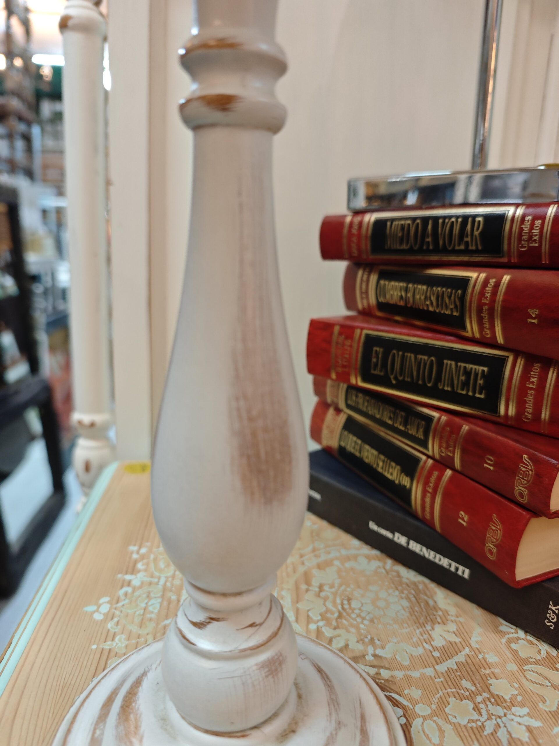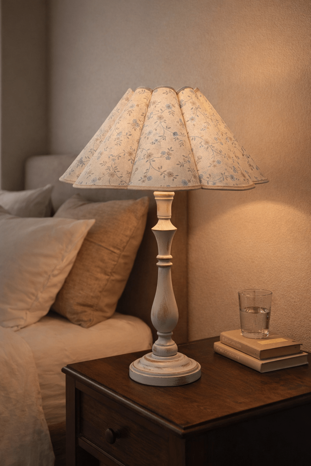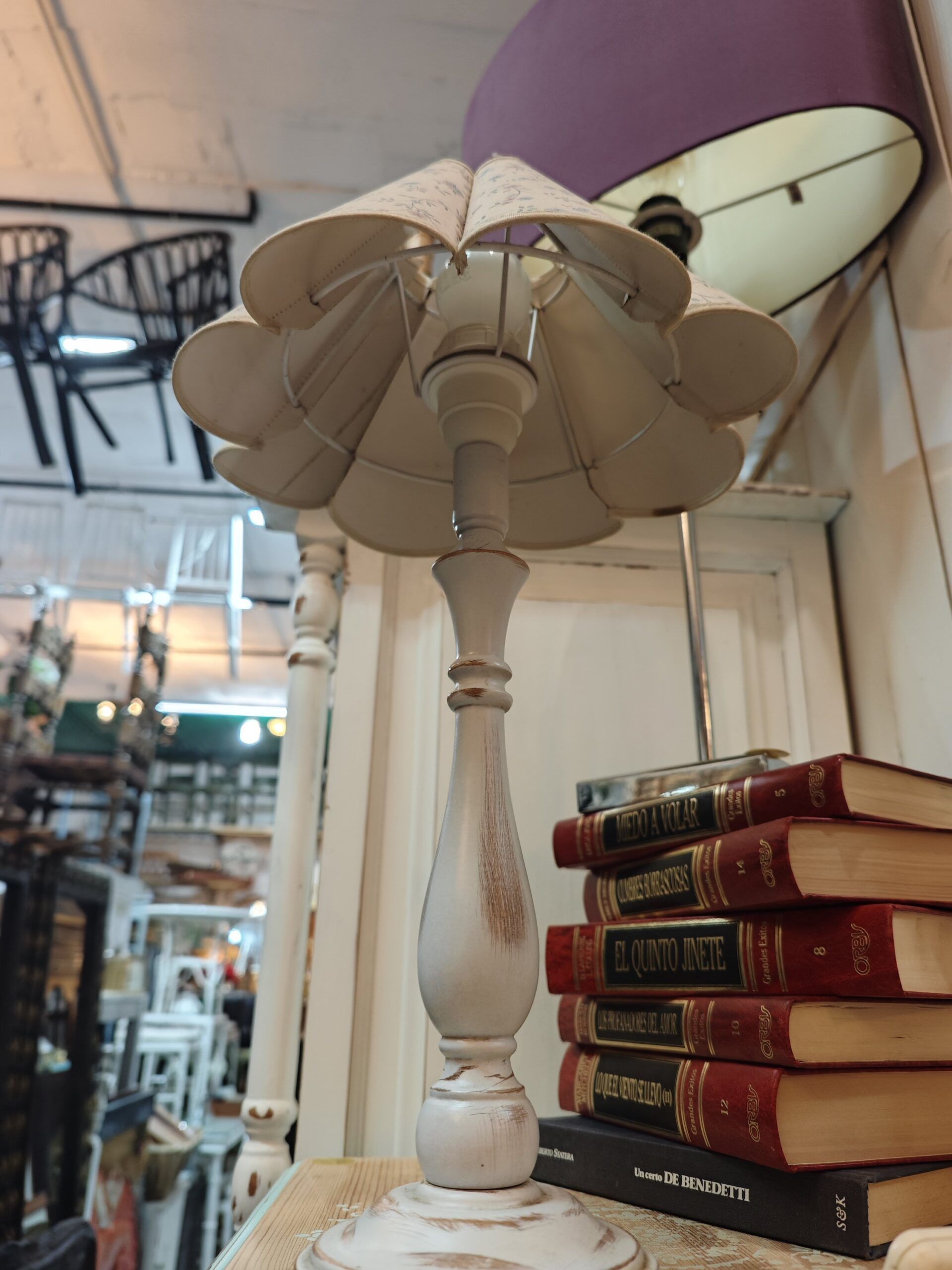 Esta encantadora lámpara de mesa de estilo vintage es el complemento perfecto para ambientes románticos y acogedores. Cuenta con un pie torneado de madera en color blanco envejecido que aporta un toque rústico y elegante. Su elemento más distintivo es la tulipa plisada de tela, decorada con un delicado estampado de pequeñas flores silvestres en tonos pastel que filtran la luz de manera suave y cálida. Gracias a su diseño atemporal y su acabado artesanal, es ideal para iluminar mesitas de noche, escritorios o rincones de lectura, integrándose perfectamente en decoraciones de estilo Shabby Chic, provenzal o clásico.