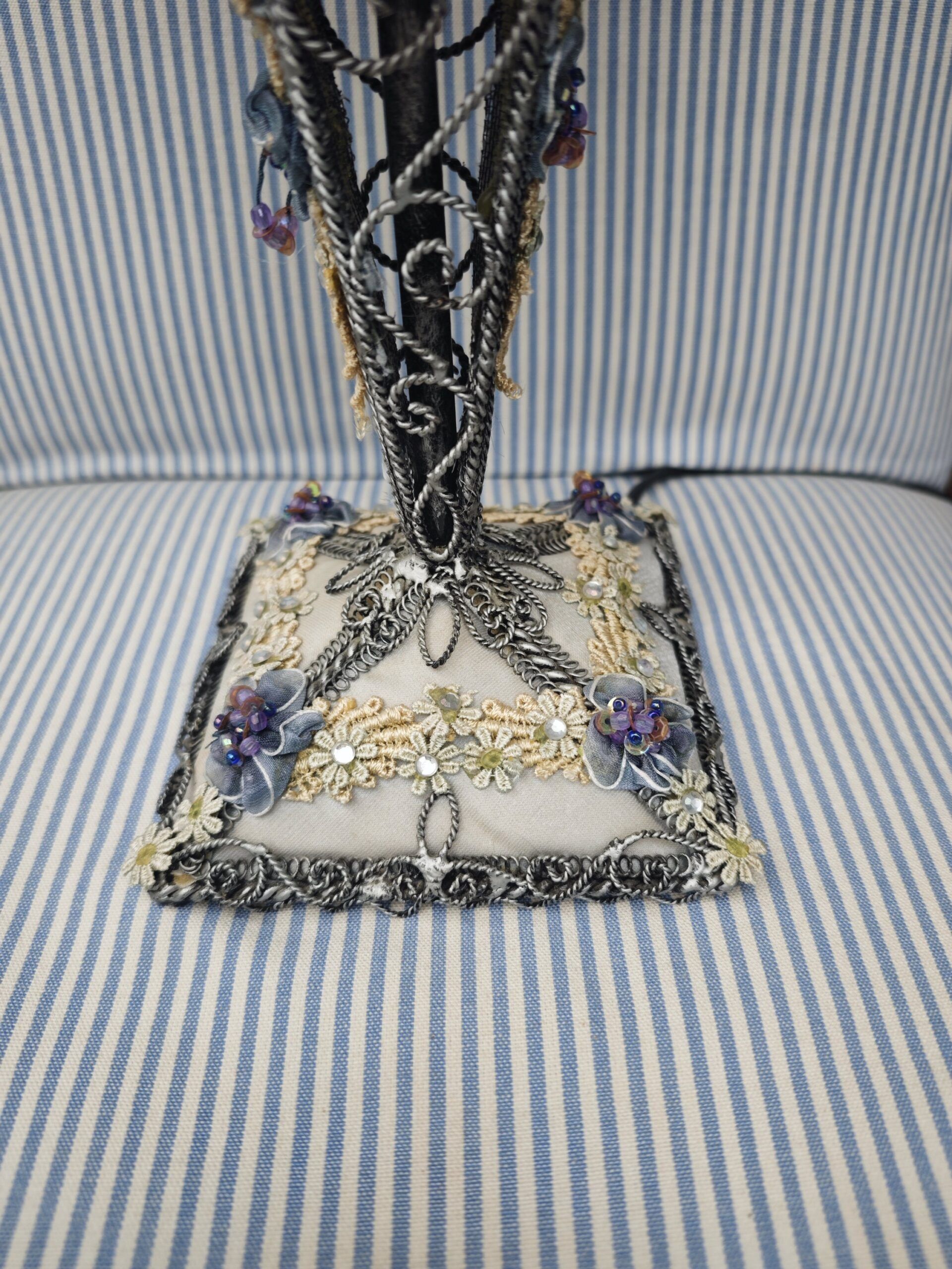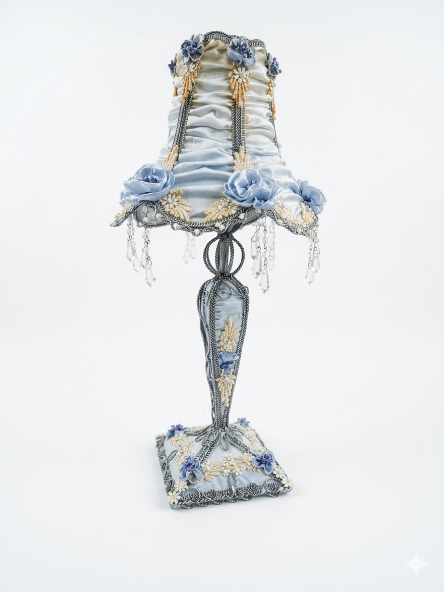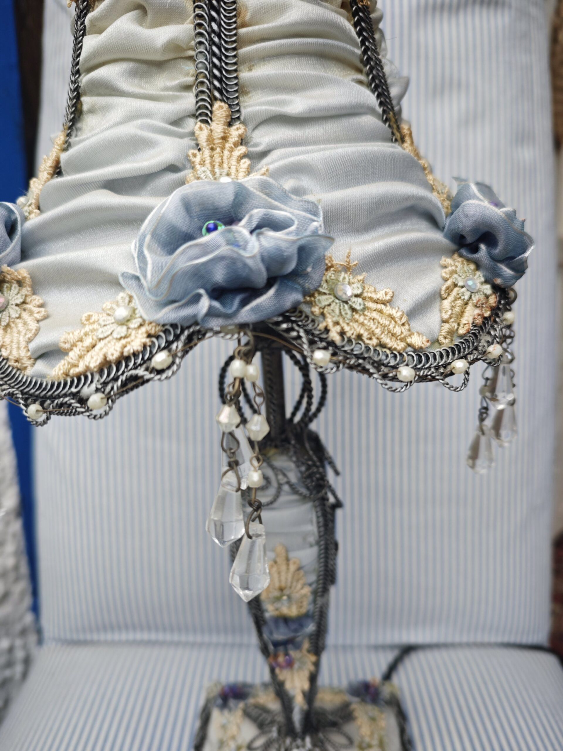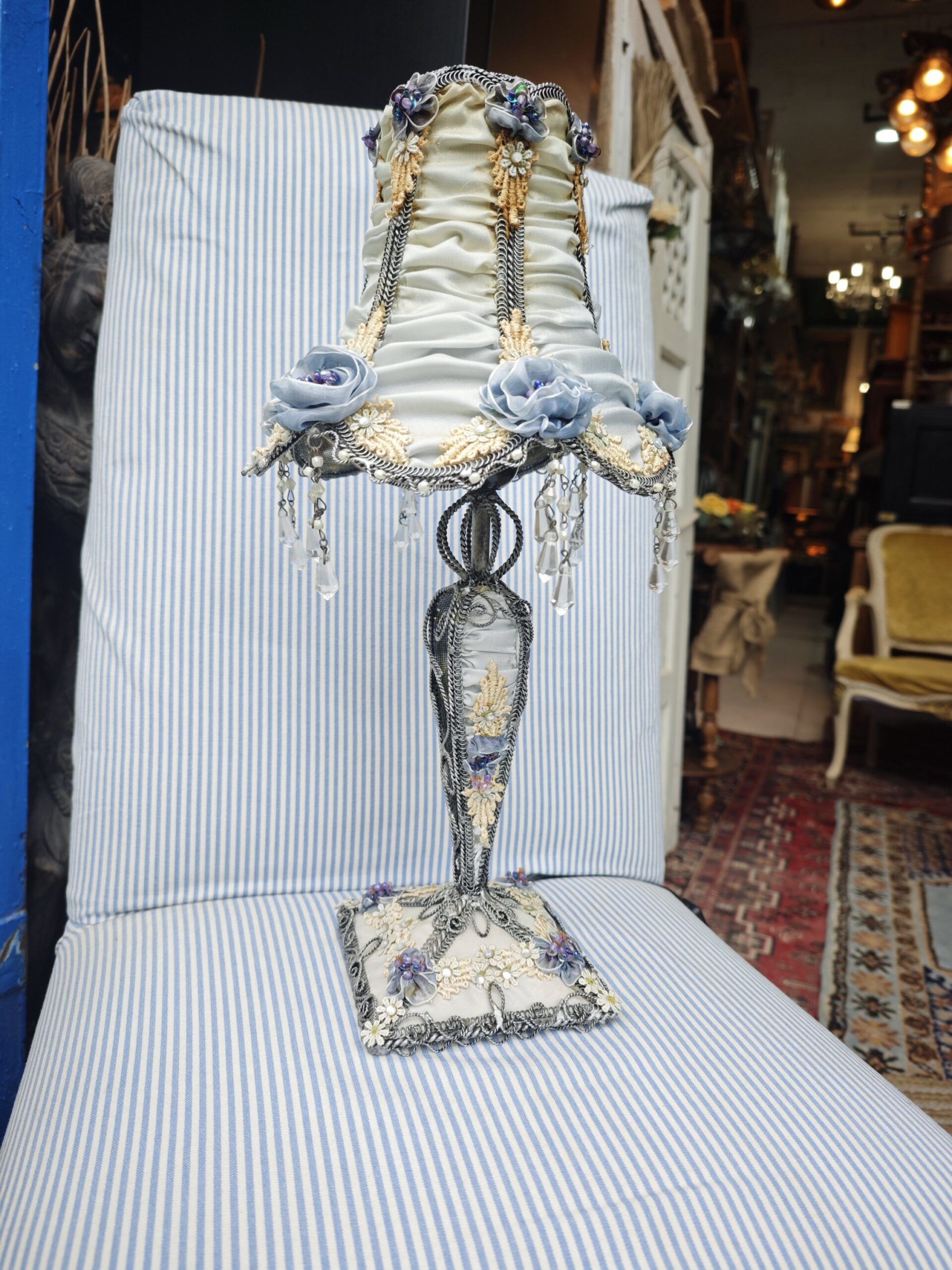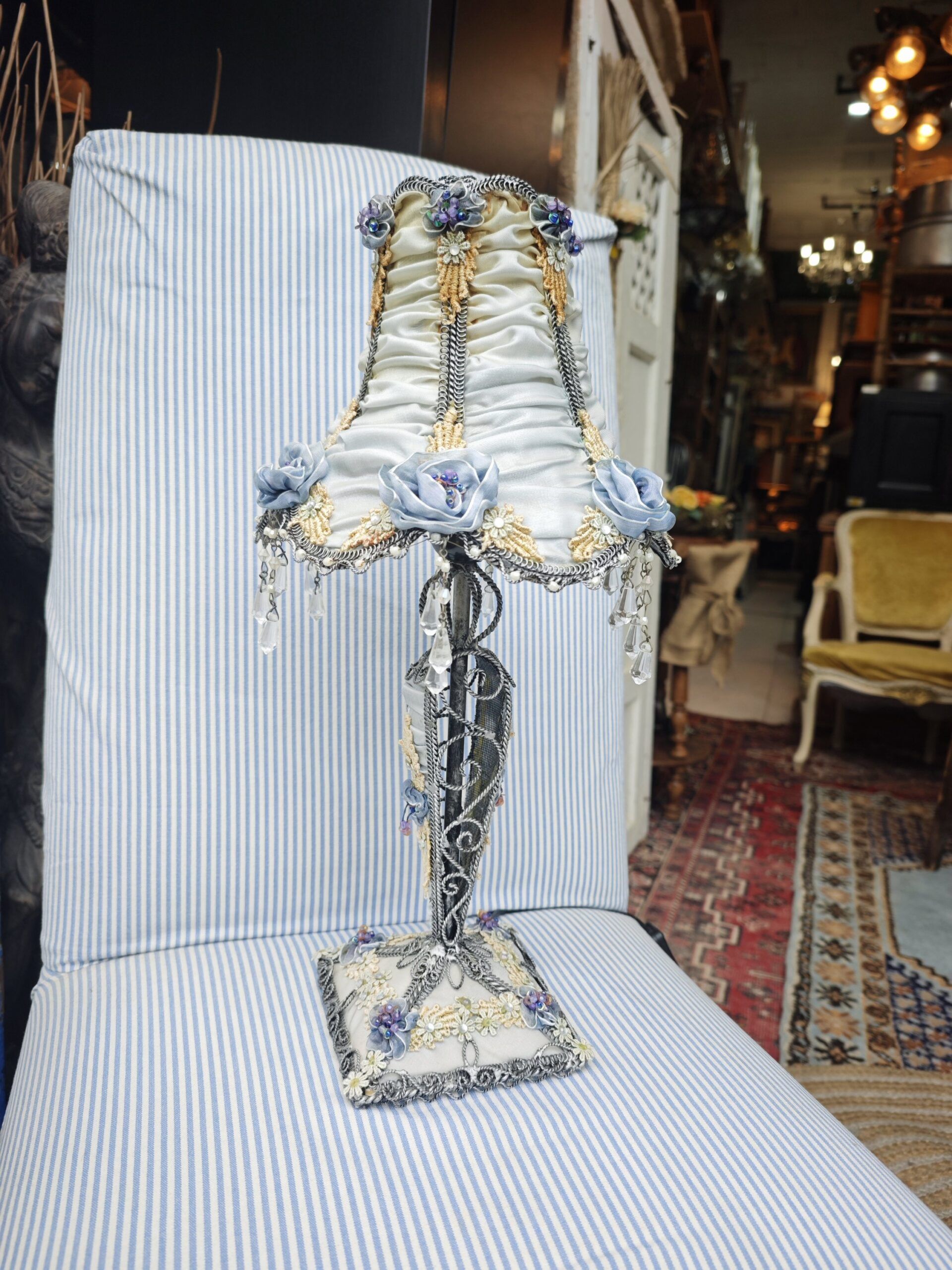 Añade un toque romántico y lujoso a tu hogar con esta joya de lámpara. Base de filigrana plateada, tallo decorado con flores y perlas, y pantalla de satén azul fruncido con rosas de seda y cristales colgantes. Una pieza única de 45 cm de altura lista para iluminar con estilo.