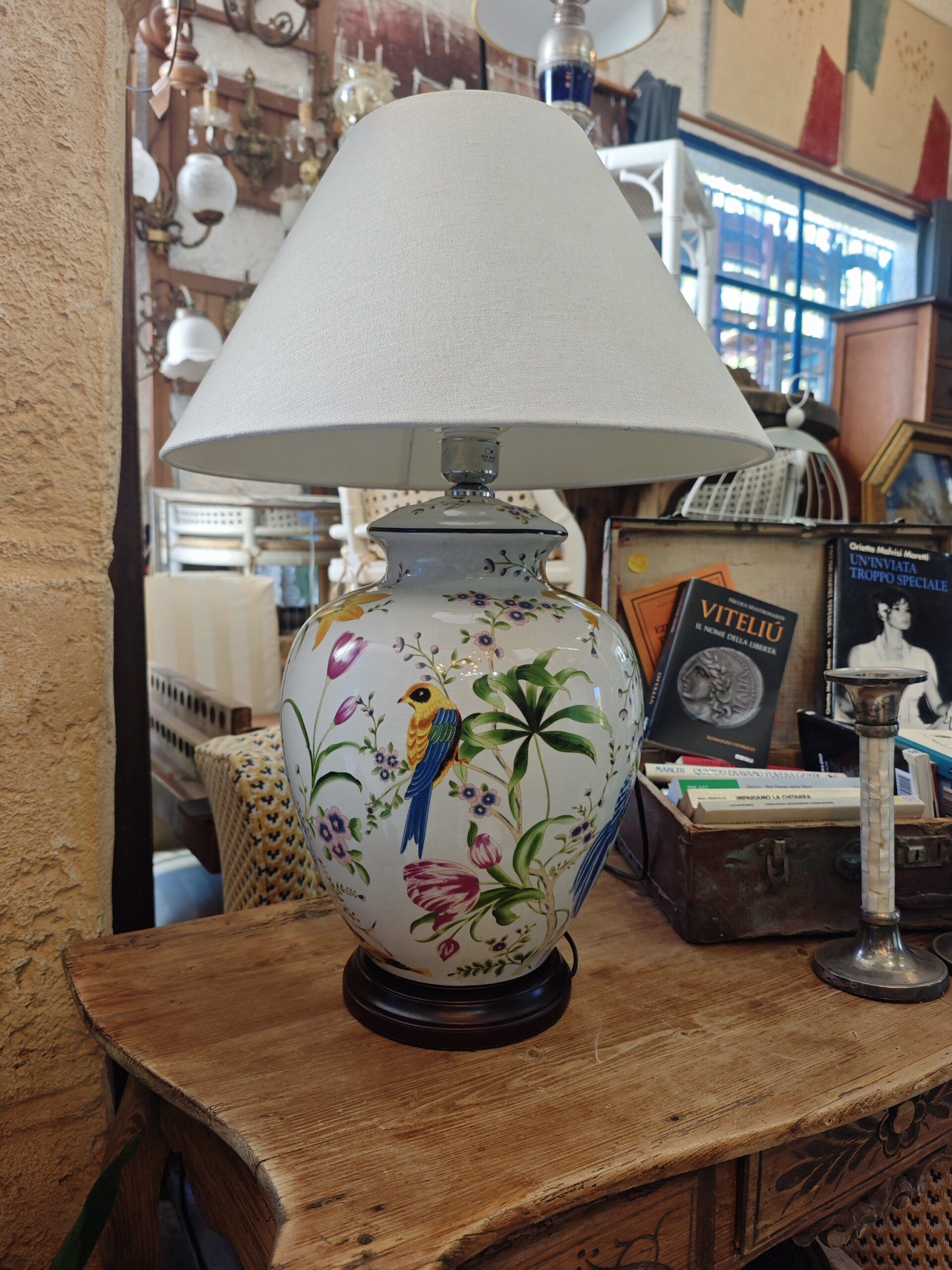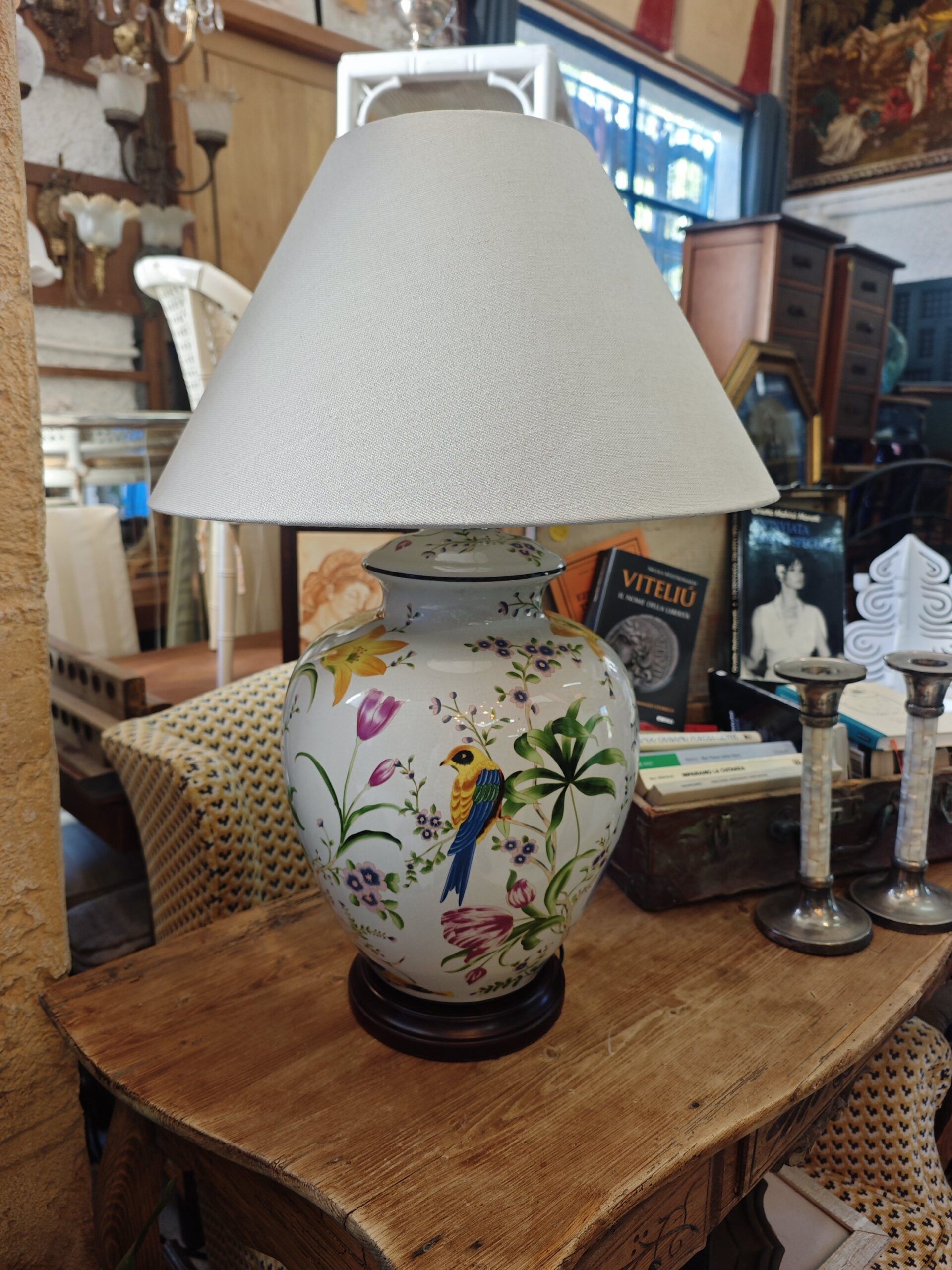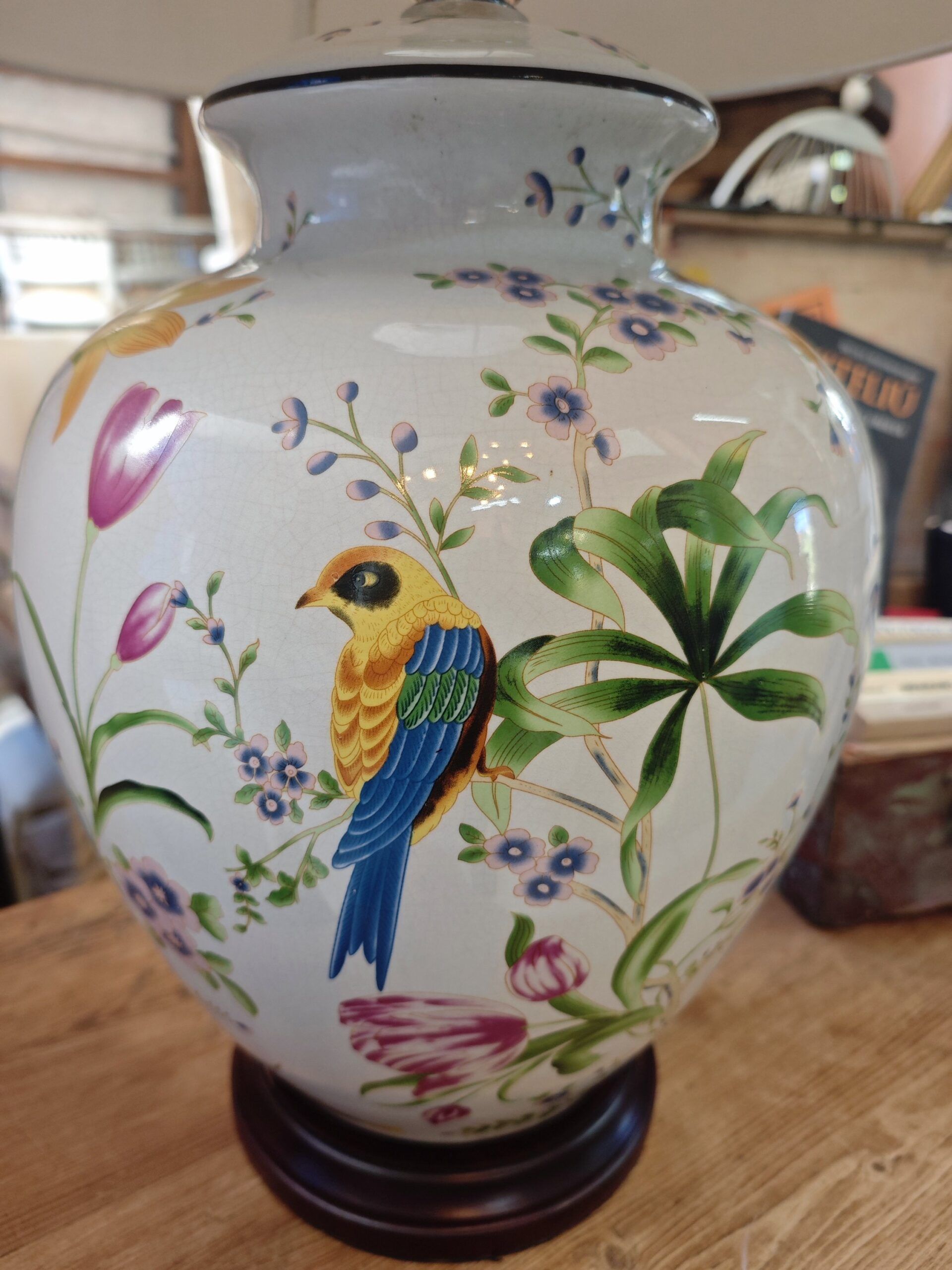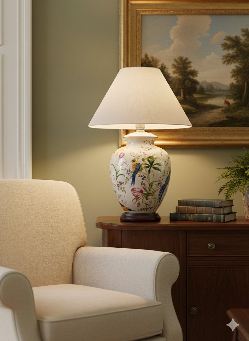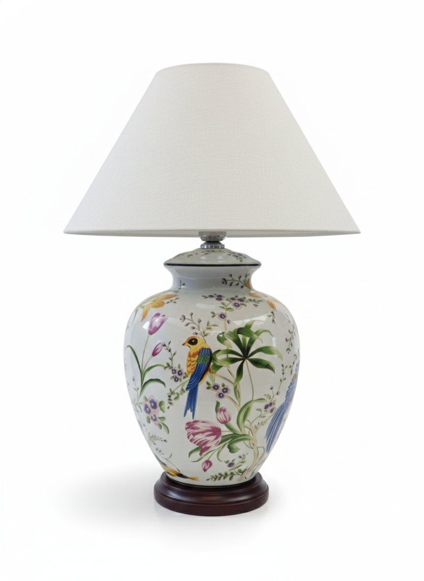 Esta elegante lámpara de sobremesa vintage destaca por su base de cerámica de alta calidad, inspirada en los clásicos recipientes tipo «ginger jar». El diseño presenta una exquisita decoración pintada con motivos de pájaros exóticos y flores silvestres en una paleta de colores vibrantes sobre un fondo blanco pulido, lo que aporta una estética botánica y clásica a cualquier estancia.