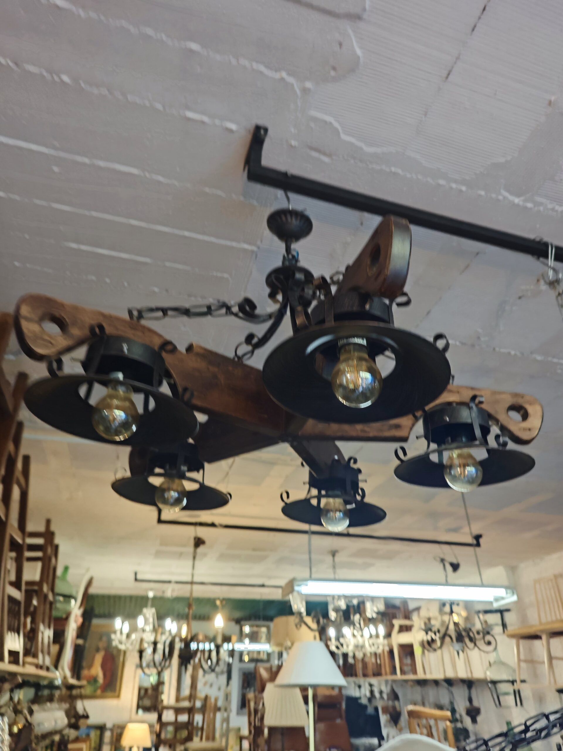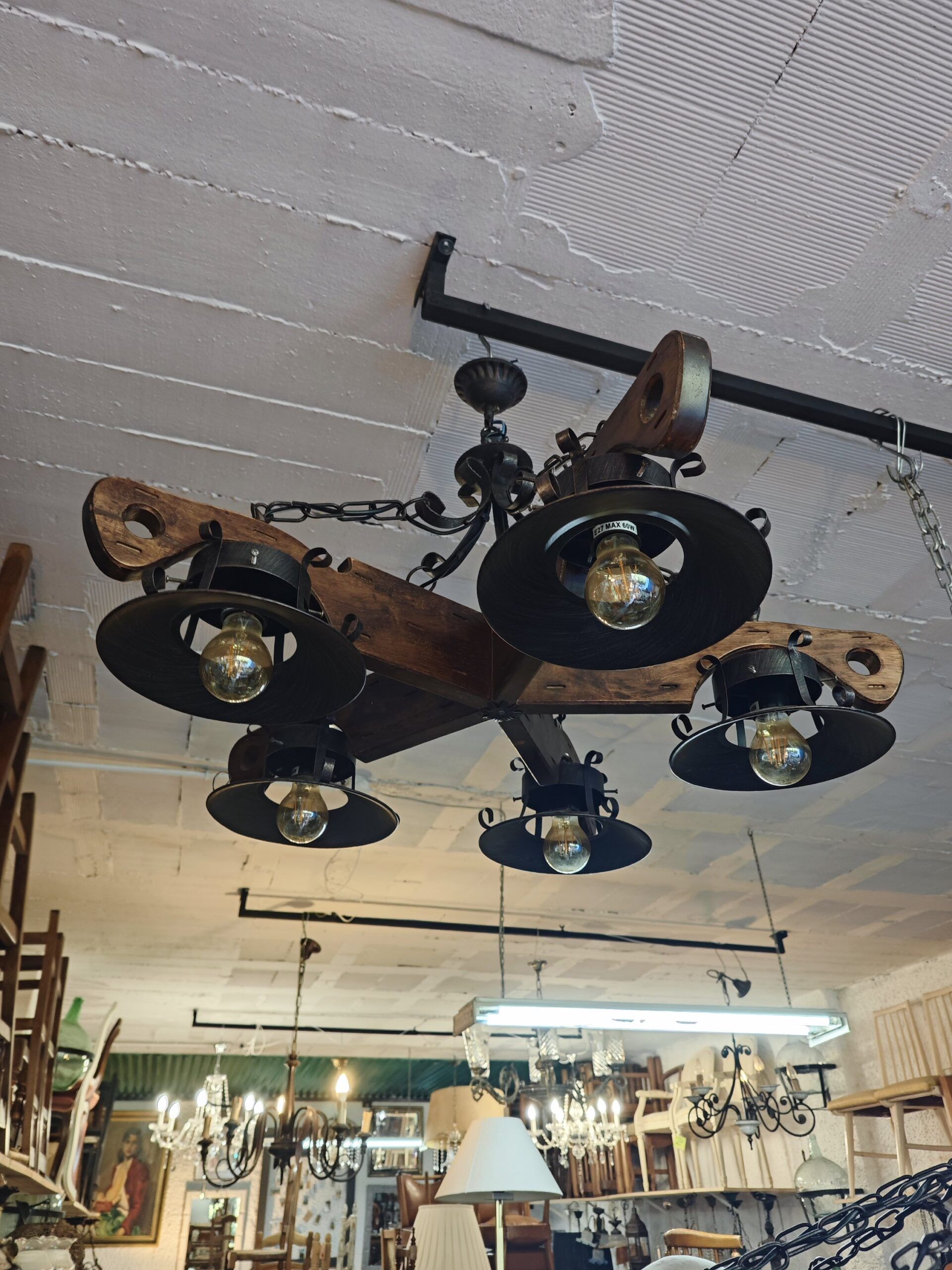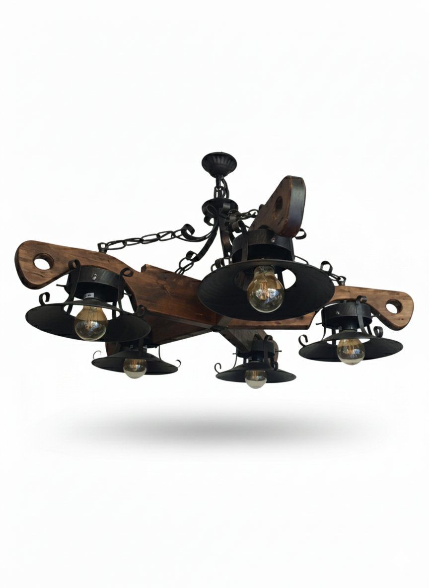 Transforma tu hogar con la elegancia atemporal de la lámpara de techo rústica Clearhalo. Esta pieza exclusiva combina la calidez de la madera maciza tallada con la robustez del hierro forjado en acabado negro mate, creando un punto focal impresionante para cualquier estancia.