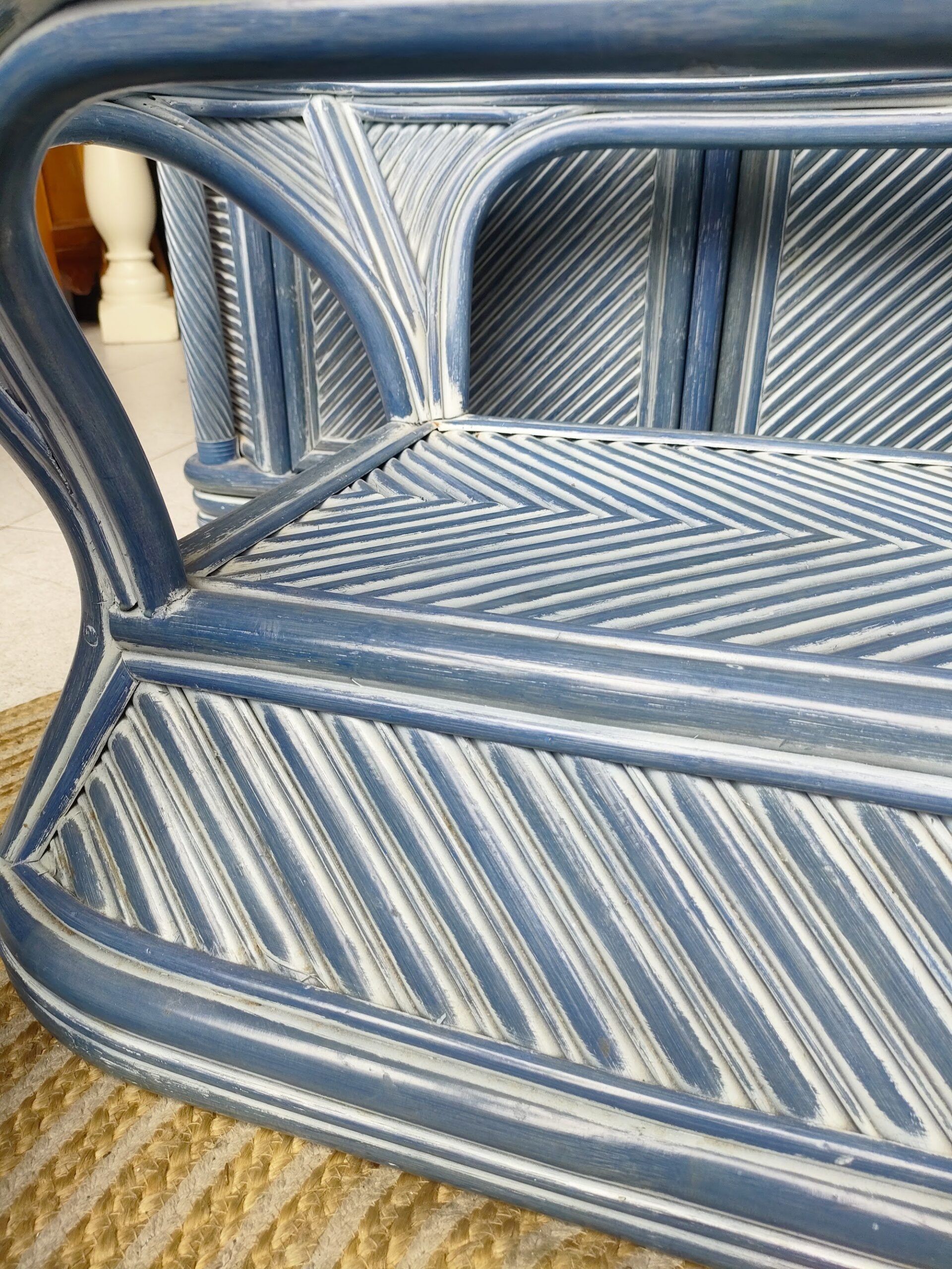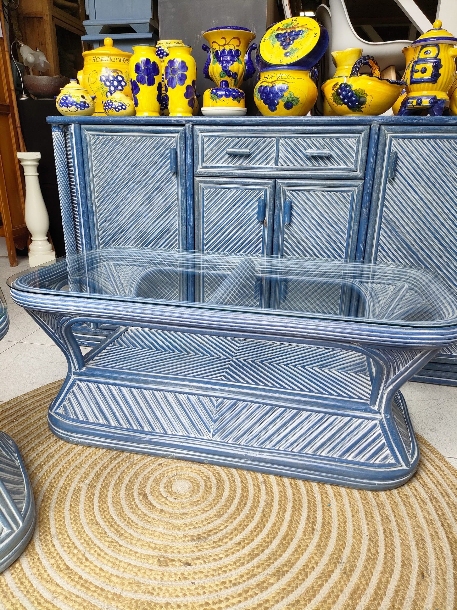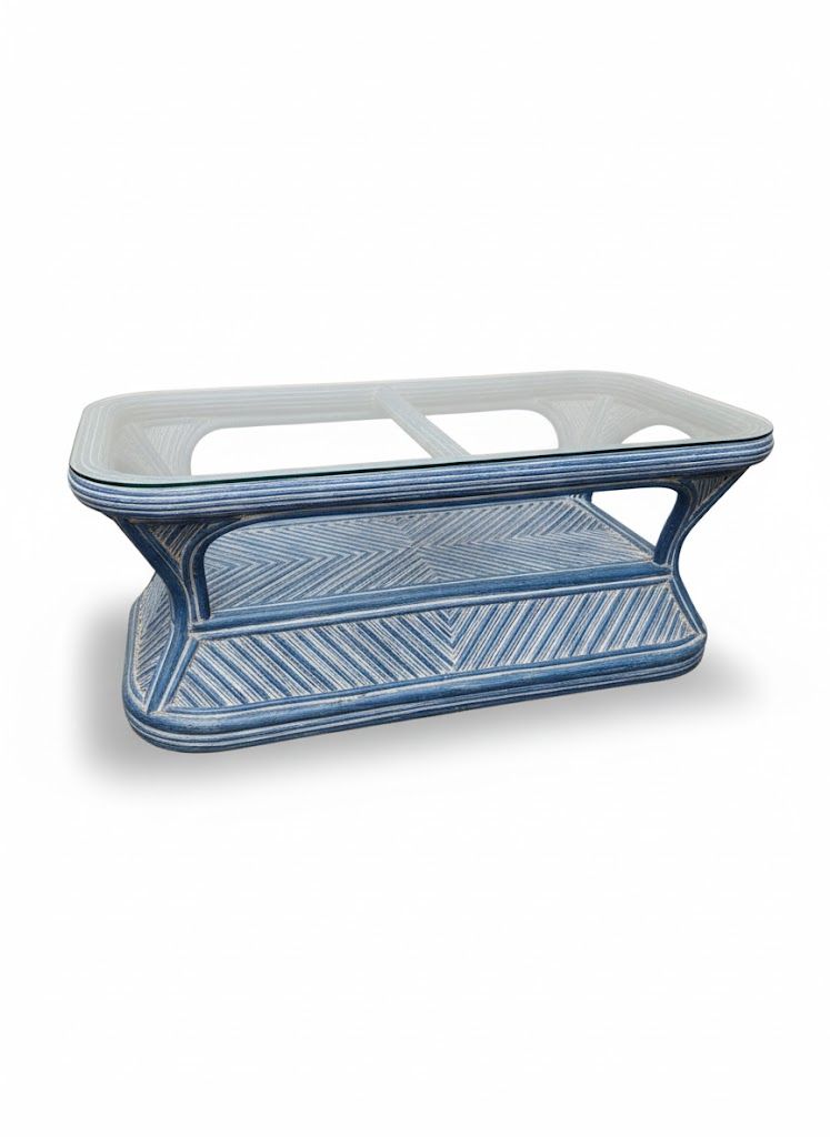 Mesa baja de bambú natural con sobre de cristal templado. Mide 120 cm de ancho, 60 cm de fondo y 46 cm de altura. Su estructura tejida en patrón diagonal aporta textura y ligereza visual, ideal para salones o terrazas con estilo mediterráneo, tropical o bohemio.