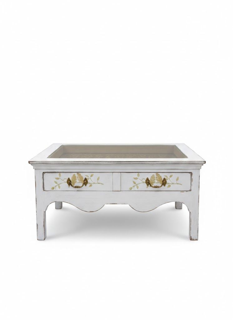 Mesa de centro shabby chic con tapa de cristal, detalles decorativos y acabado blanco envejecido. 95×60×47 cm