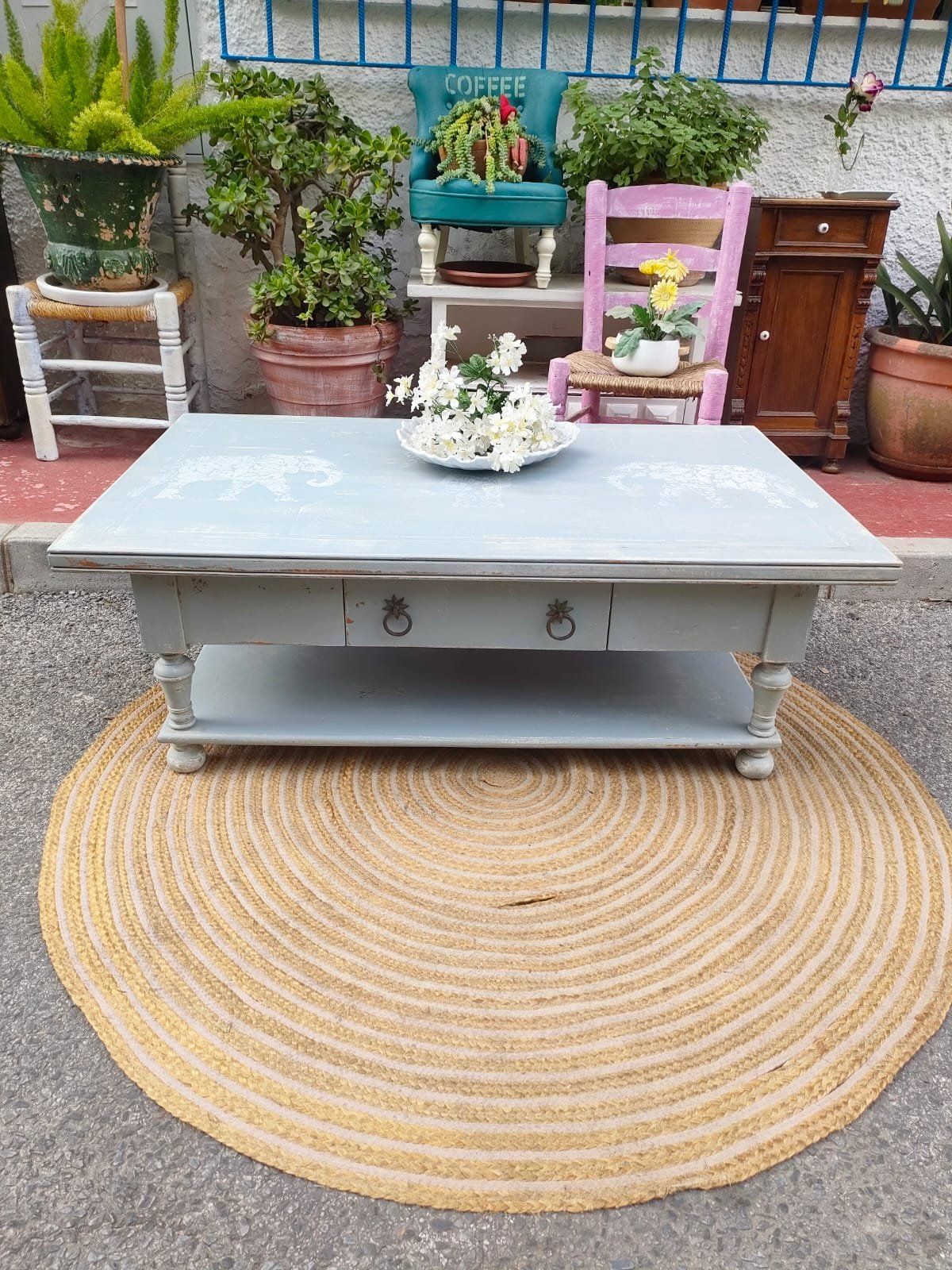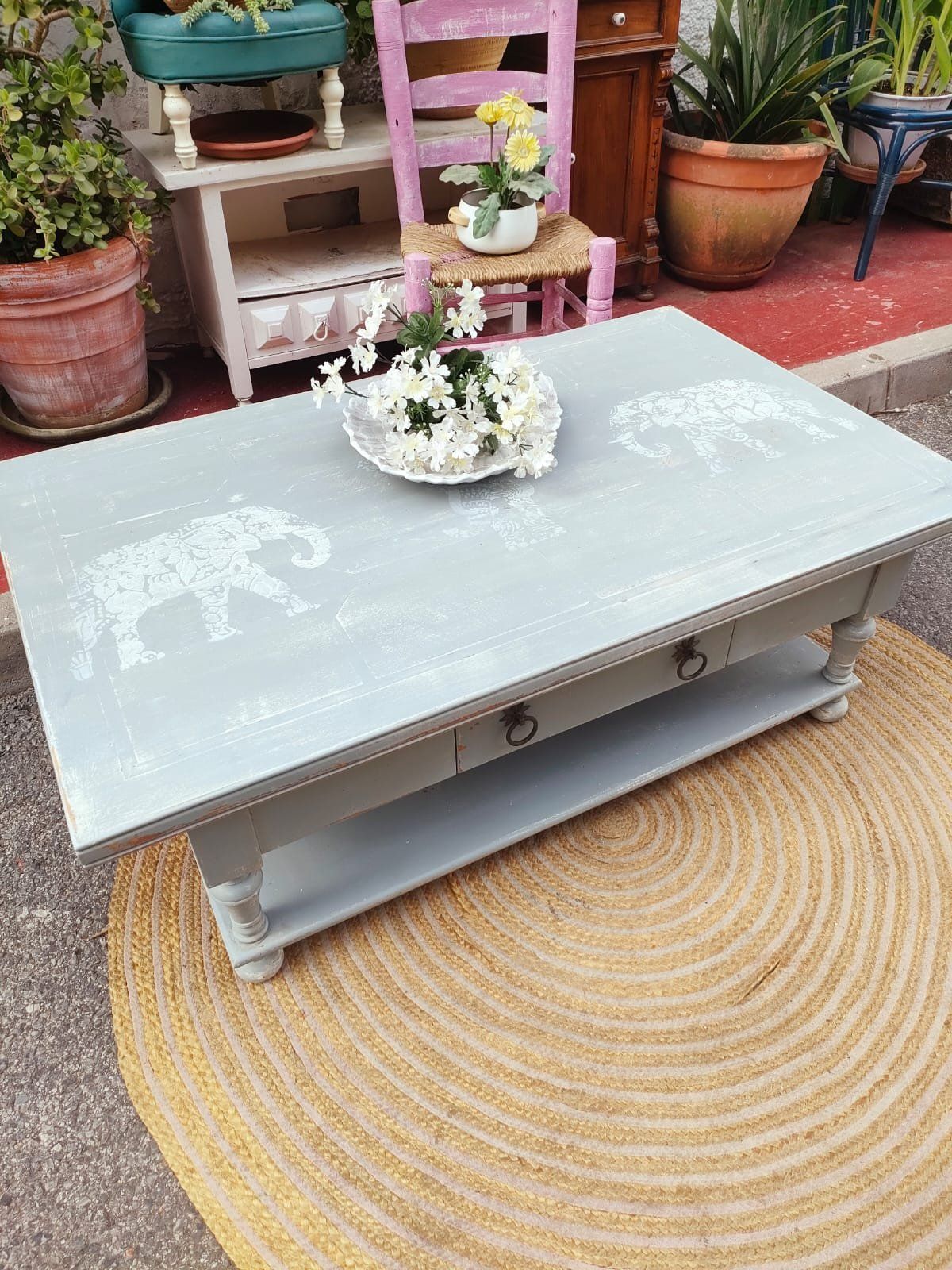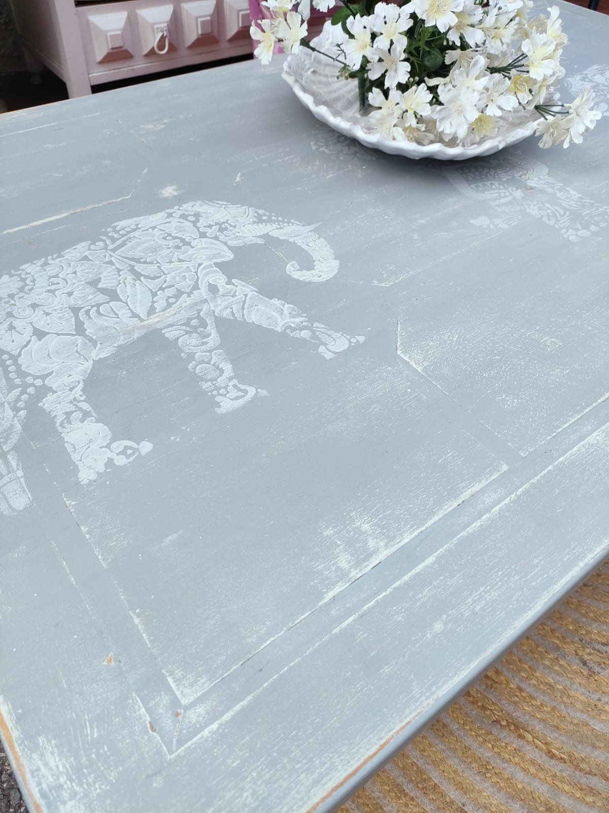 Una pieza única que combina arte, funcionalidad y estilo vintage. Esta mesa baja de madera pintada a mano destaca por su diseño encantador de elefantes blancos , ideal para aportar personalidad a cualquier espacio.