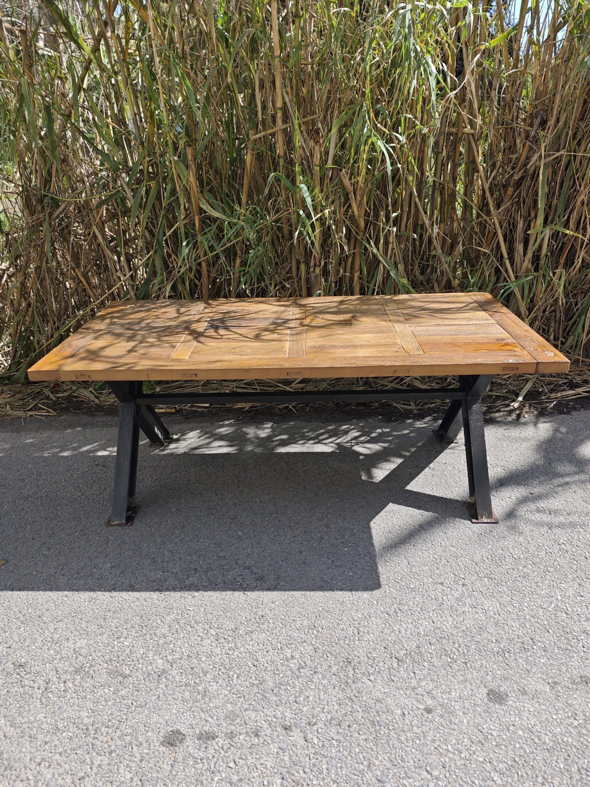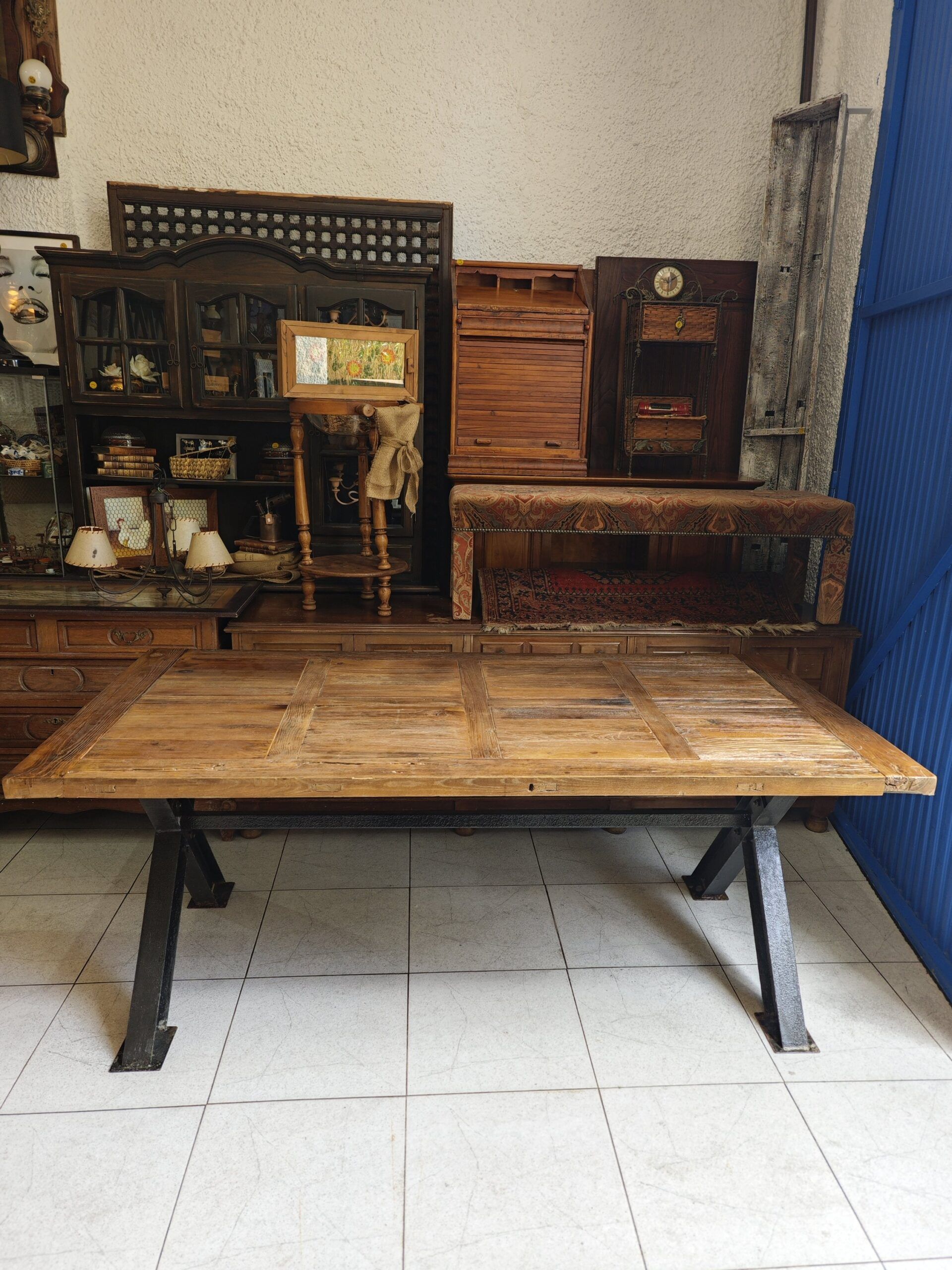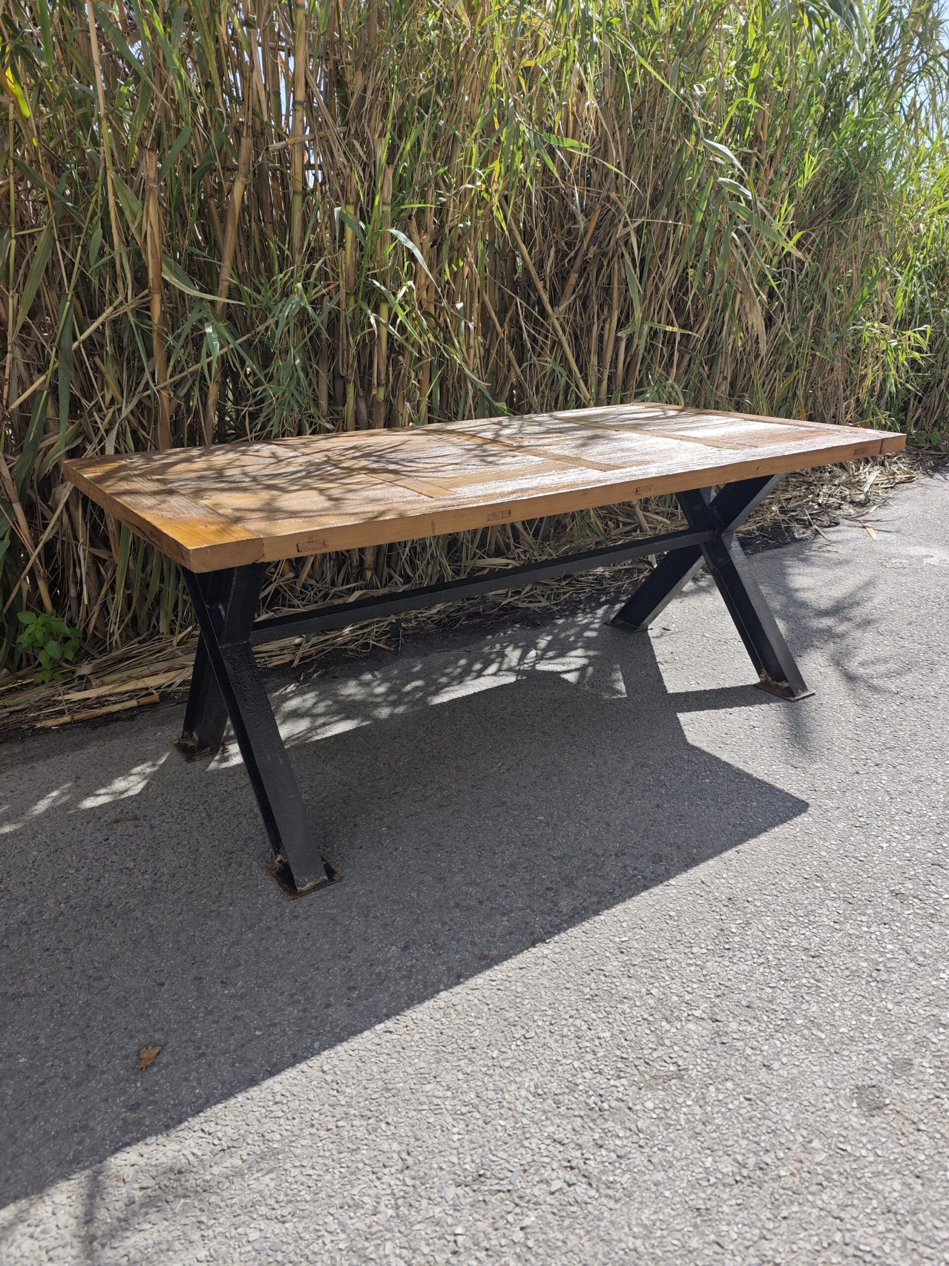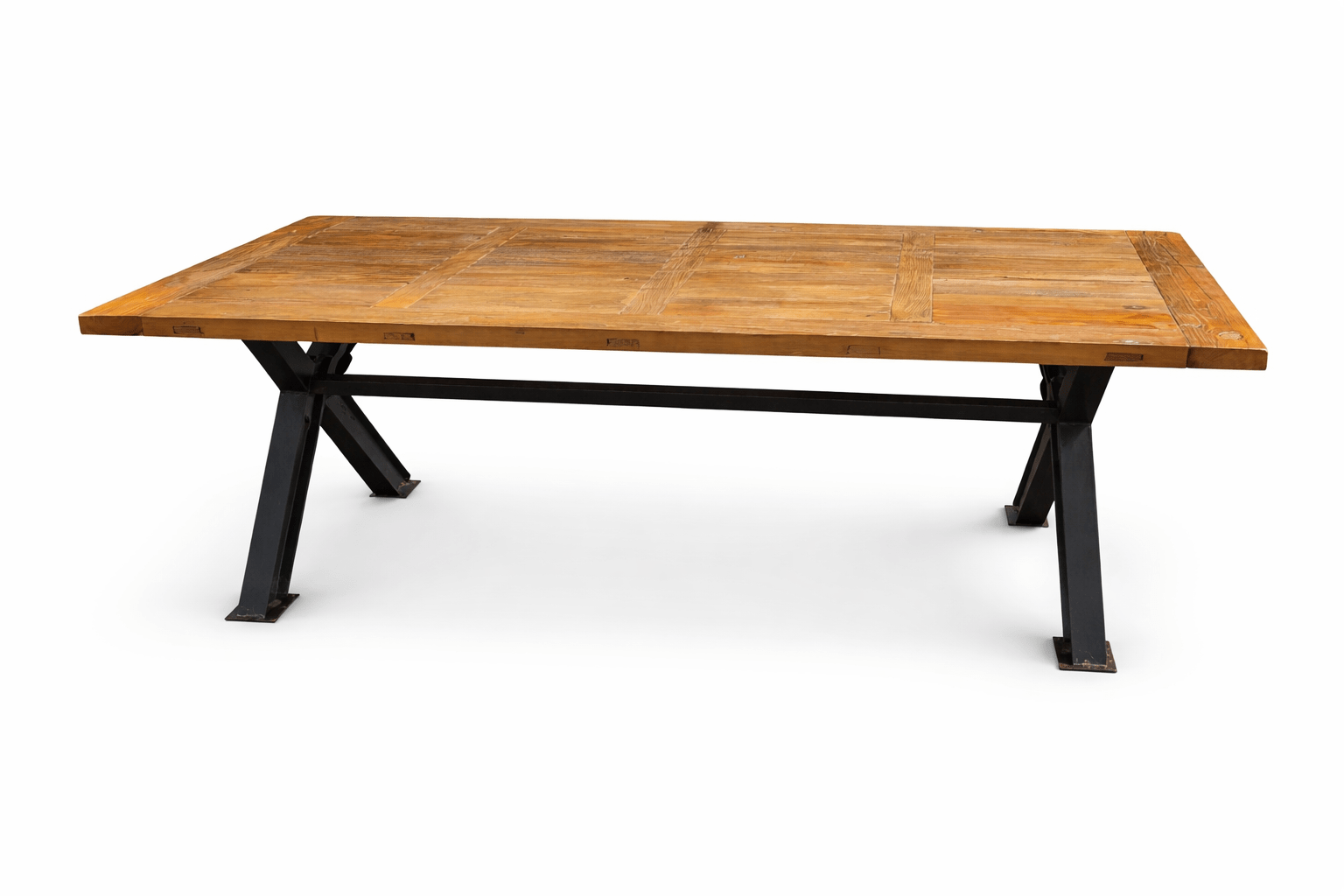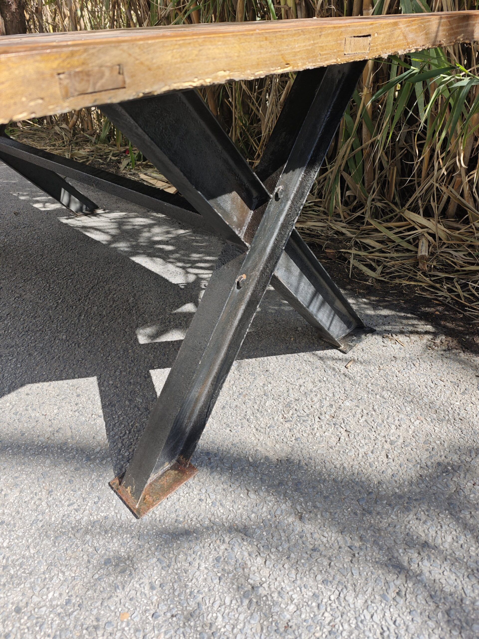 Mesa de Comedor de Madera de Olmo Recuperada con Patas de Vigas de Hierro en X