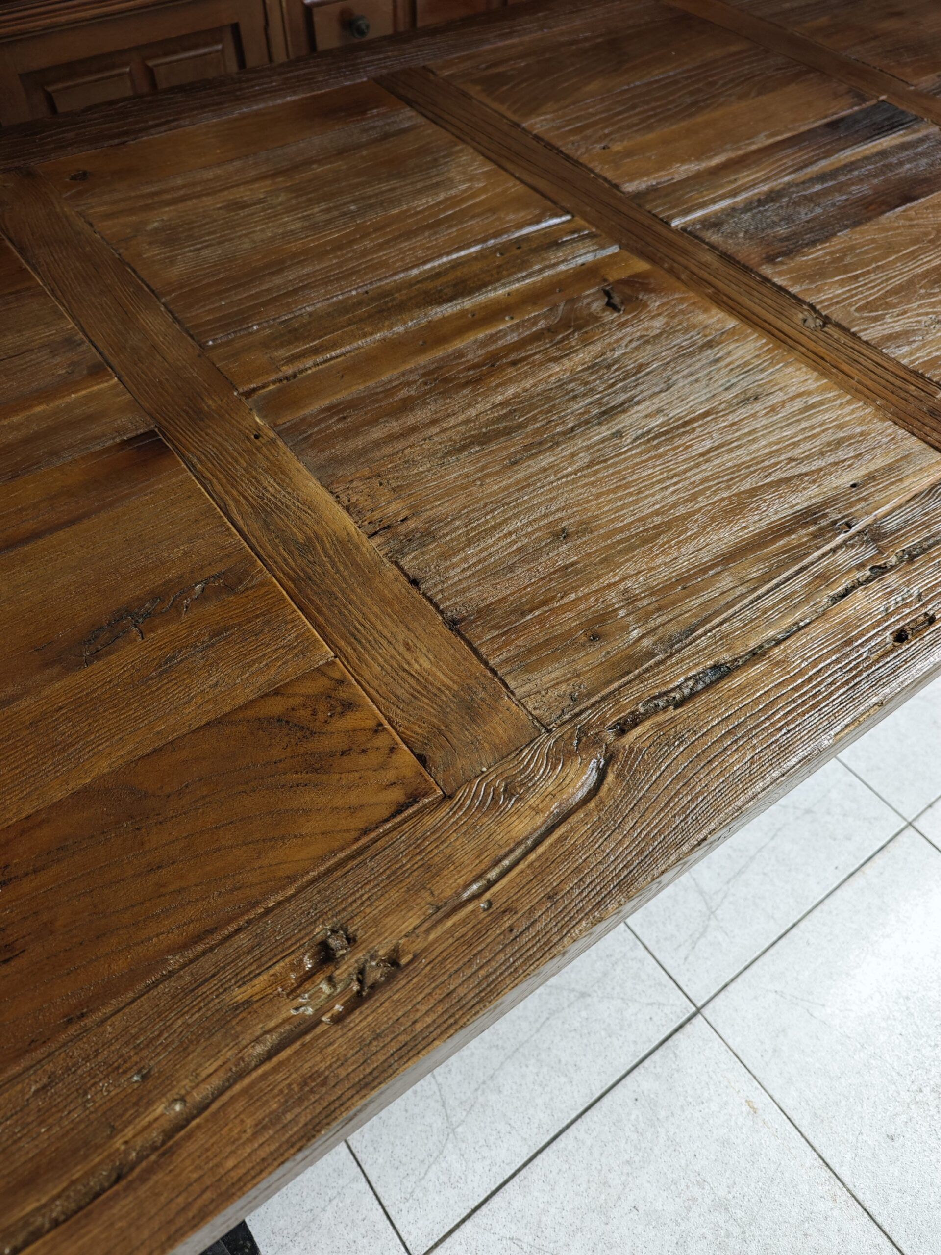 Esta exclusiva mesa de comedor industrial destaca por su tablero confeccionado íntegramente en madera de olmo recuperada, una madera noble valorada por su excepcional dureza y sus veteados entrelazados de gran belleza natural. La superficie presenta un ensamblado tradicional que permite apreciar las marcas, nudos y texturas propias de la madera rescatada, lo que otorga a cada pieza una identidad única e irrepetible.