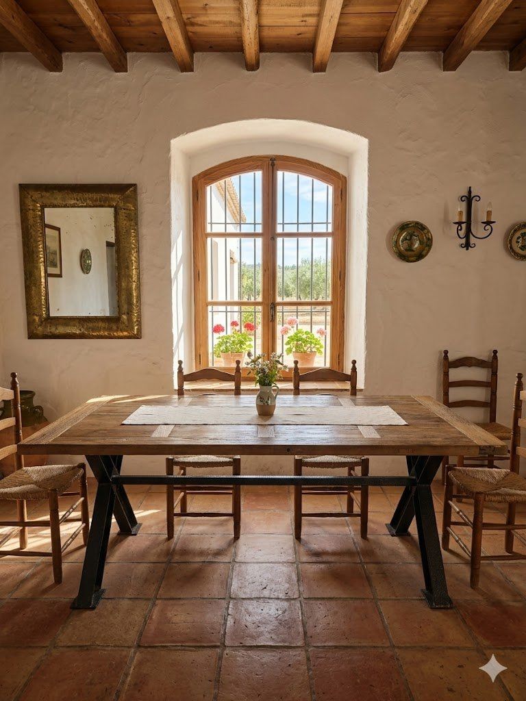 La base está construida con potentes vigas de hierro en configuración de X, proporcionando una estructura arquitectónica sólida y una estabilidad inquebrantable. El acabado oscuro del metal resalta la tonalidad miel del olmo, creando un equilibrio perfecto entre la calidez de los materiales naturales y la fuerza del diseño industrial. Es una pieza diseñada para perdurar, ideal tanto para comedores de alto uso como para mesas de reuniones en espacios profesionales con estilo.
