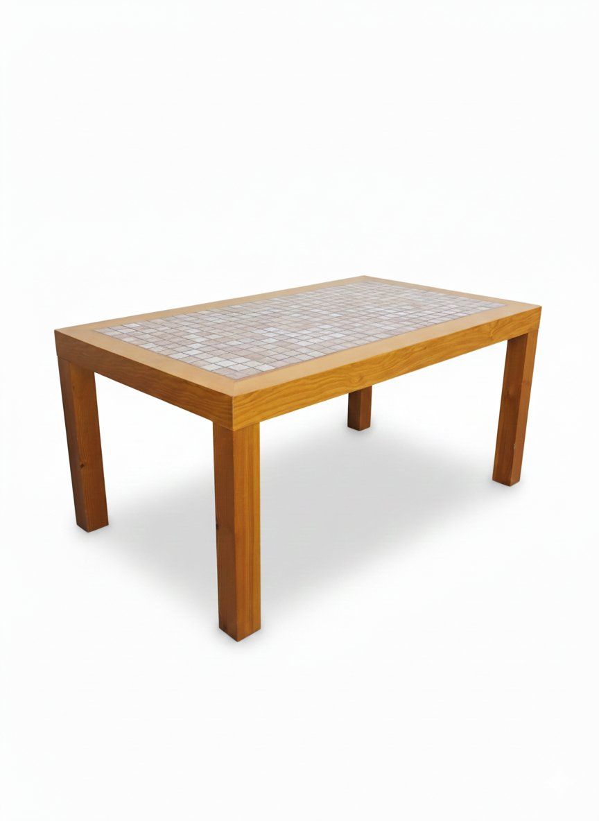 Mesa de madera con cerámica decorativo. Medidas: 158 cm de ancho, 94 cm de fondo, 76 cm de altura. Ideal para interiores o espacios cubiertos con estilo mediterráneo y funcionalidad artesanal.