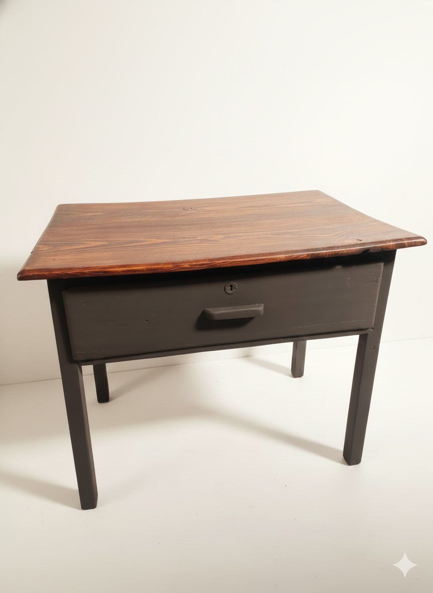 Mesa tocinera vintage de madera, 87 × 59 × 72 cm. Ideal como mesa de trabajo o apoyo decorativo.